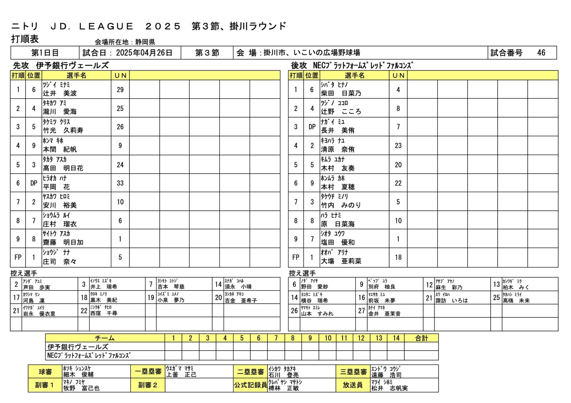 伊予銀行7-3NECプラットフォームズ JDL第3節掛川ラウンド 2025.4.26 女子ソフトボール試合結果