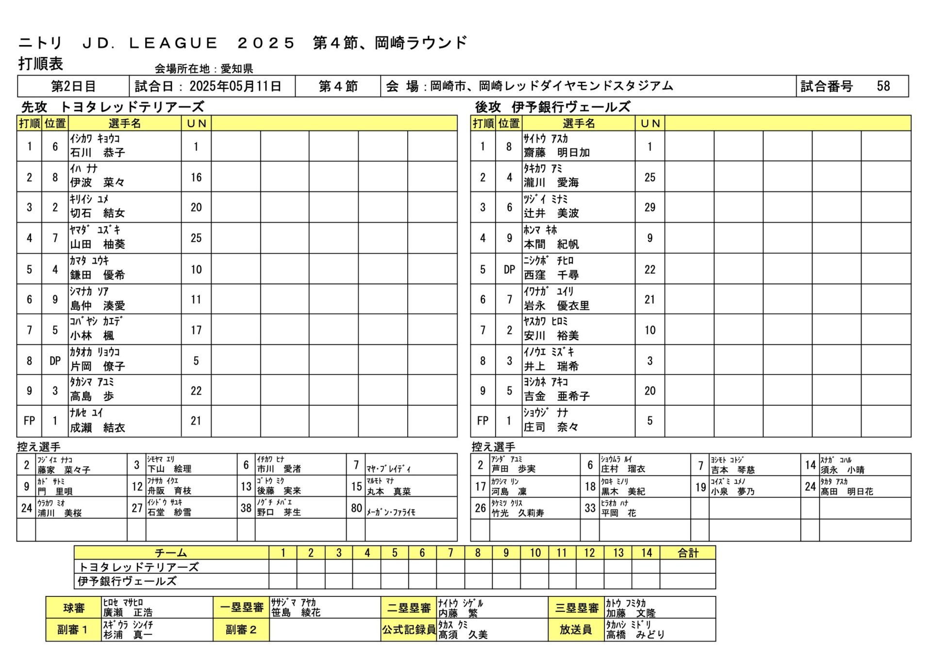 トヨタ3-5伊予銀行 JDL第4節岡崎ラウンド 2025.5.11 女子ソフトボール試合結果