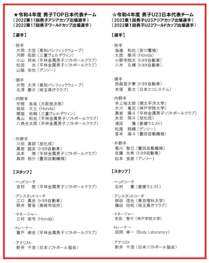 新設されたU23カテゴリーの記念すべき「第1回大会制覇」をめざす男子U23日本代表は、TOPチームの「弟分」的な位置づけでもあることから、次代の日本男子ソフトボールを担う若い力・新たなスターの出現に期待が高まります。