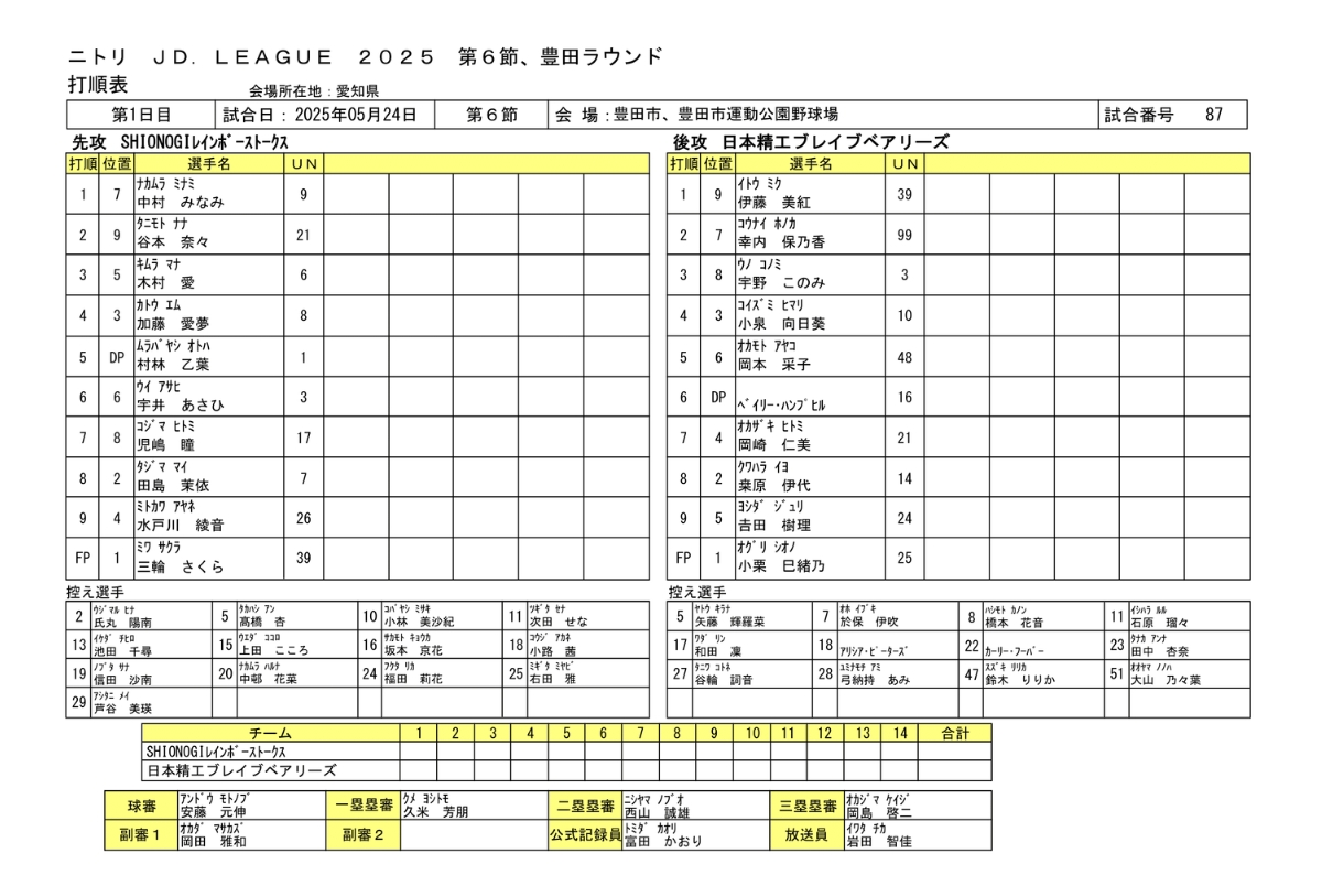 SHIONOGI 6-2 日本精工 JDL第6節豊田ラウンド 2025.5.24 女子ソフトボール試合結果