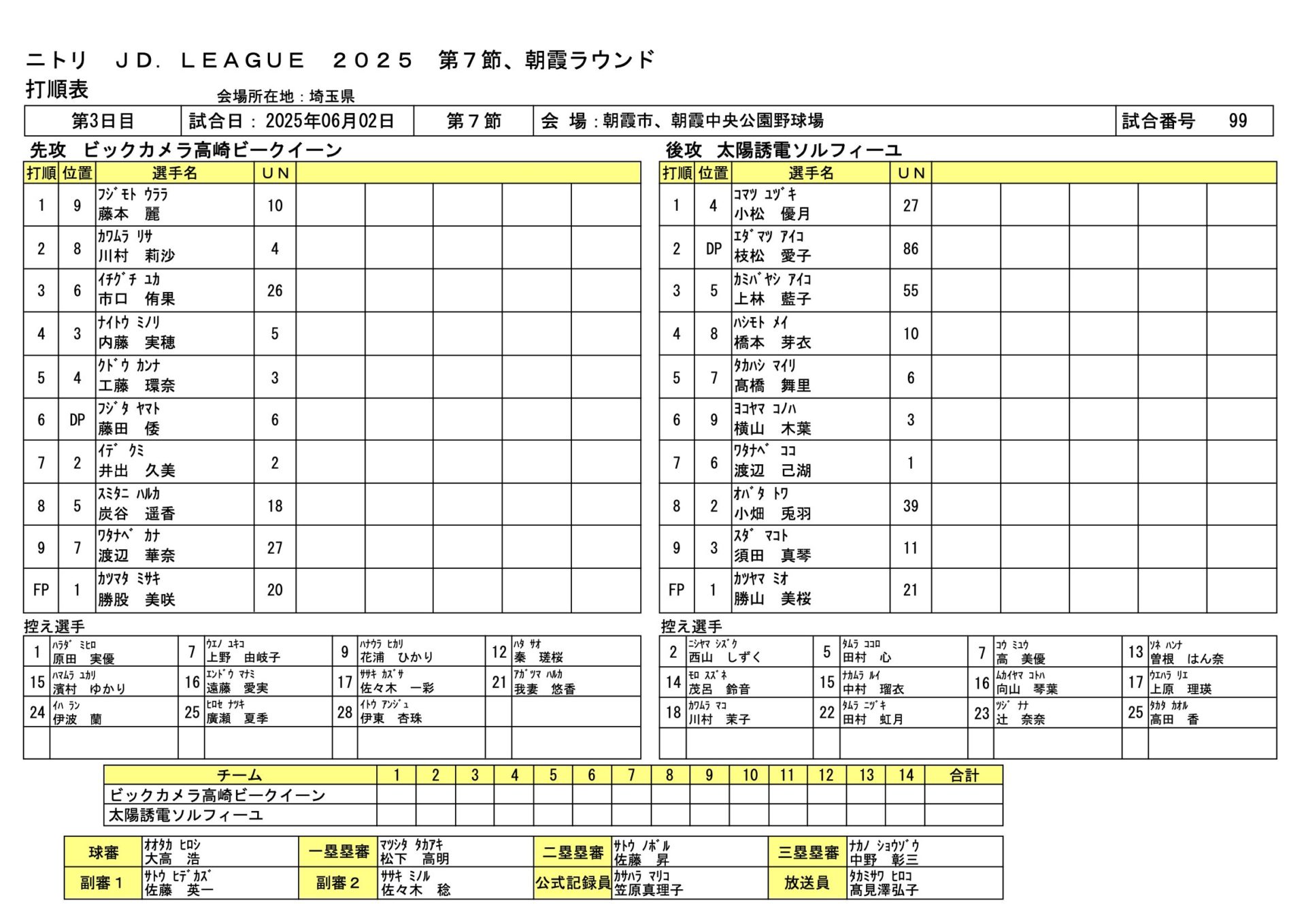 ビックカメラ4-0太陽誘電 JDL第7節朝霞ラウンド 2025.6.2 女子ソフトボール試合結果