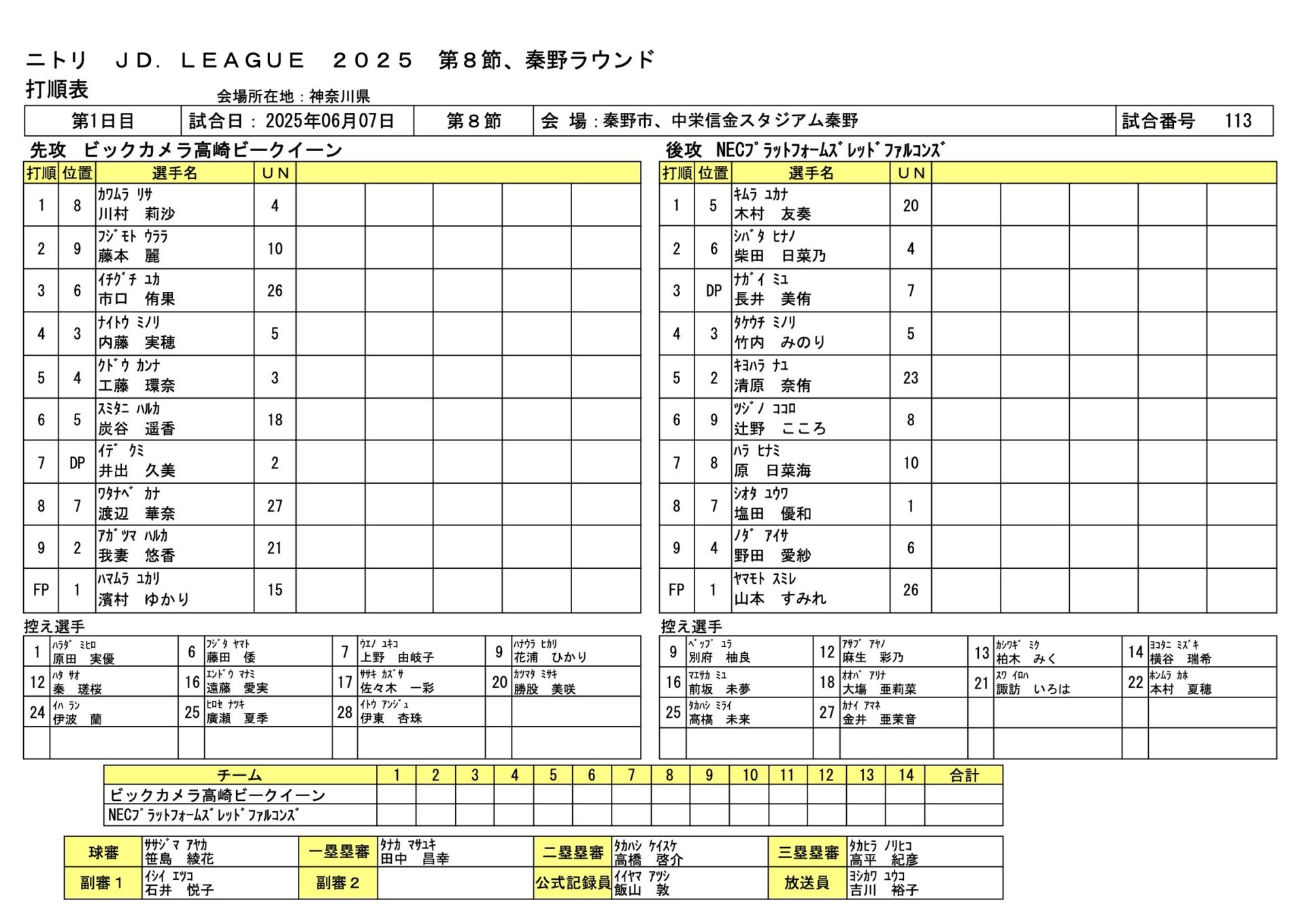 NEC1-0ビックカメラ JDL第8節秦野ラウンド 2025.6.7 女子ソフトボール試合結果