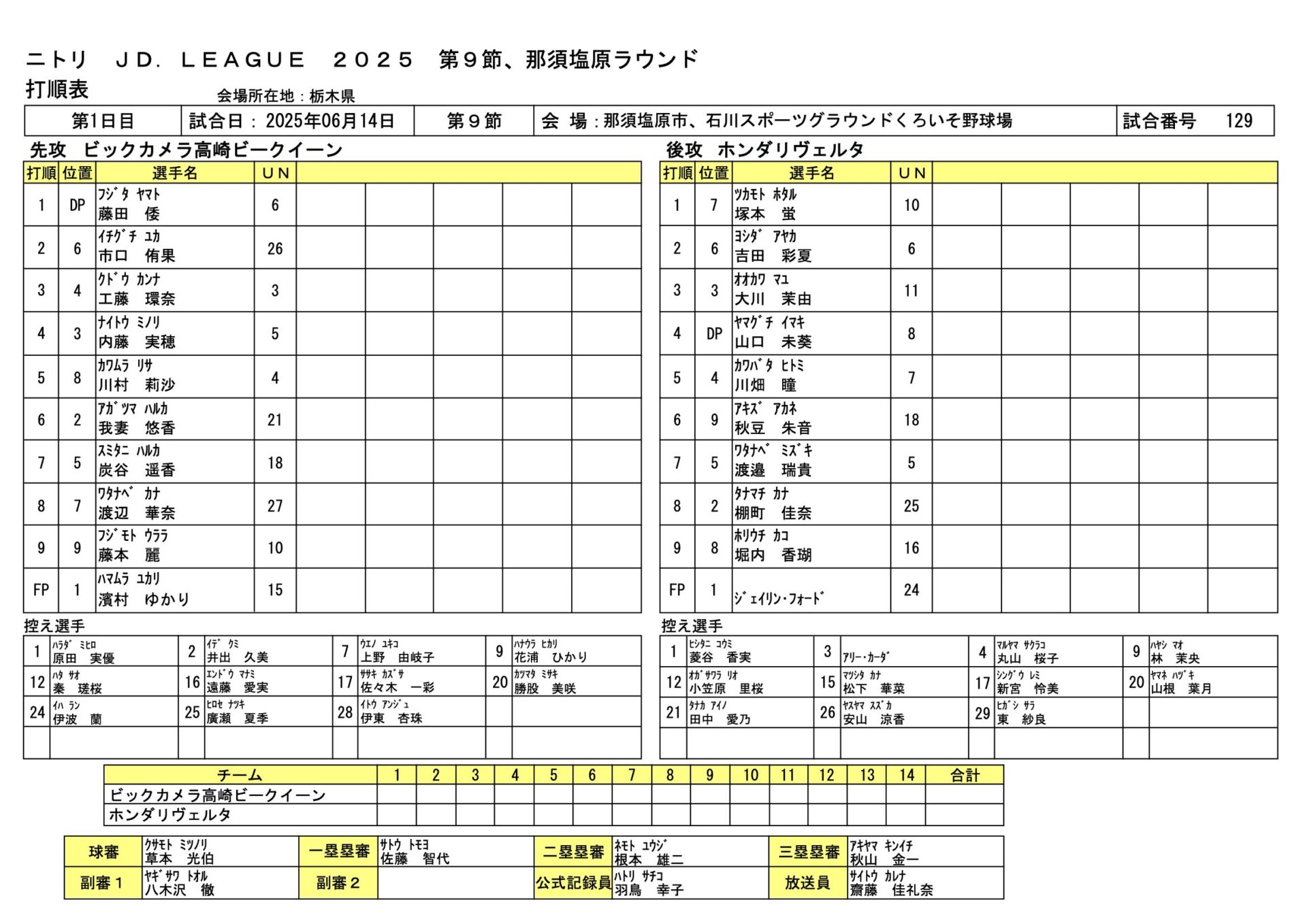 ビックカメラ高崎13-3ホンダ JDL第9節那須塩原ラウンド 2025.6.14 女子ソフトボール試合結果