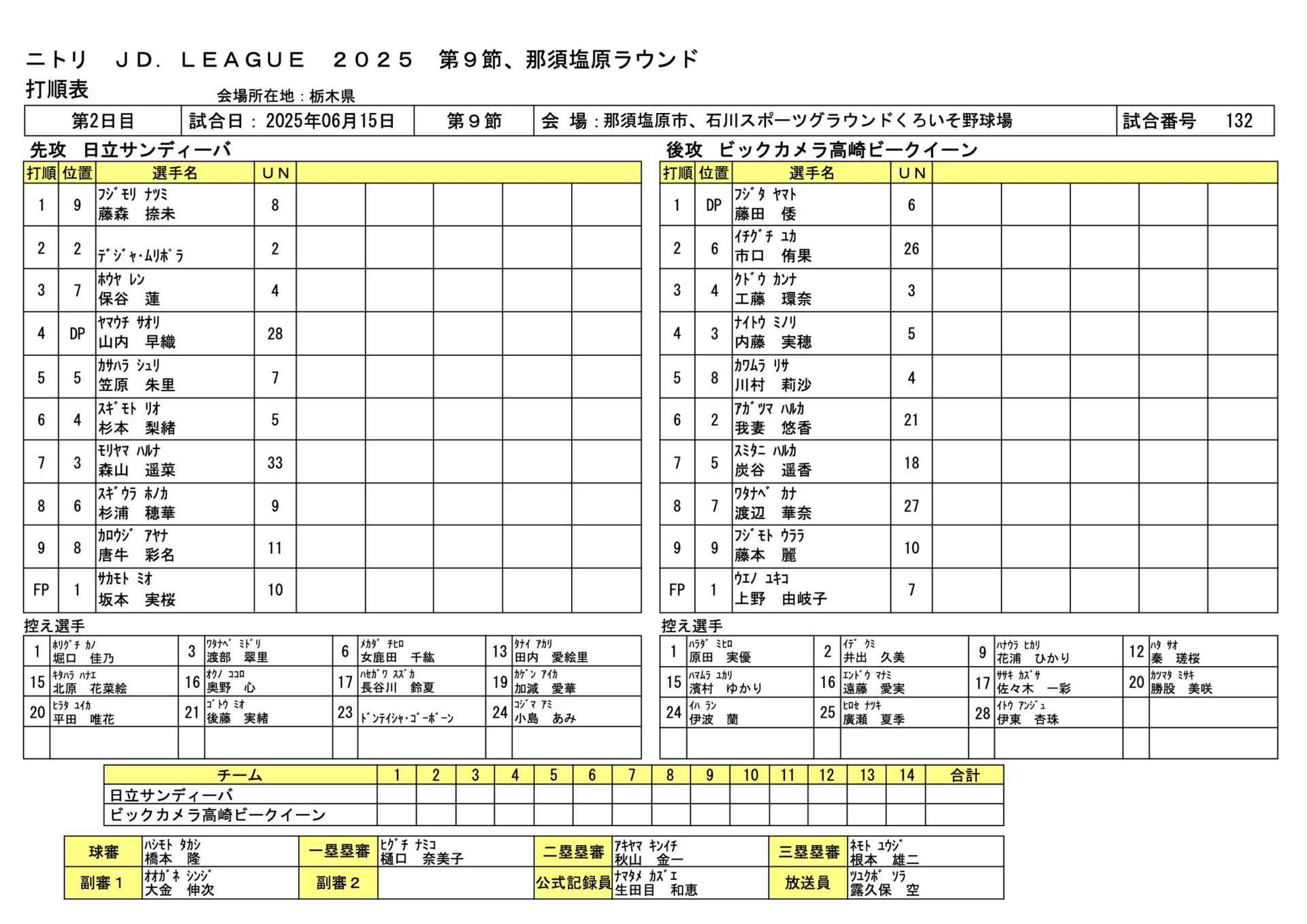 ビックカメラ高崎6-1日立 JDL第9節那須塩原ラウンド 2025.6.15 女子ソフトボール試合結果