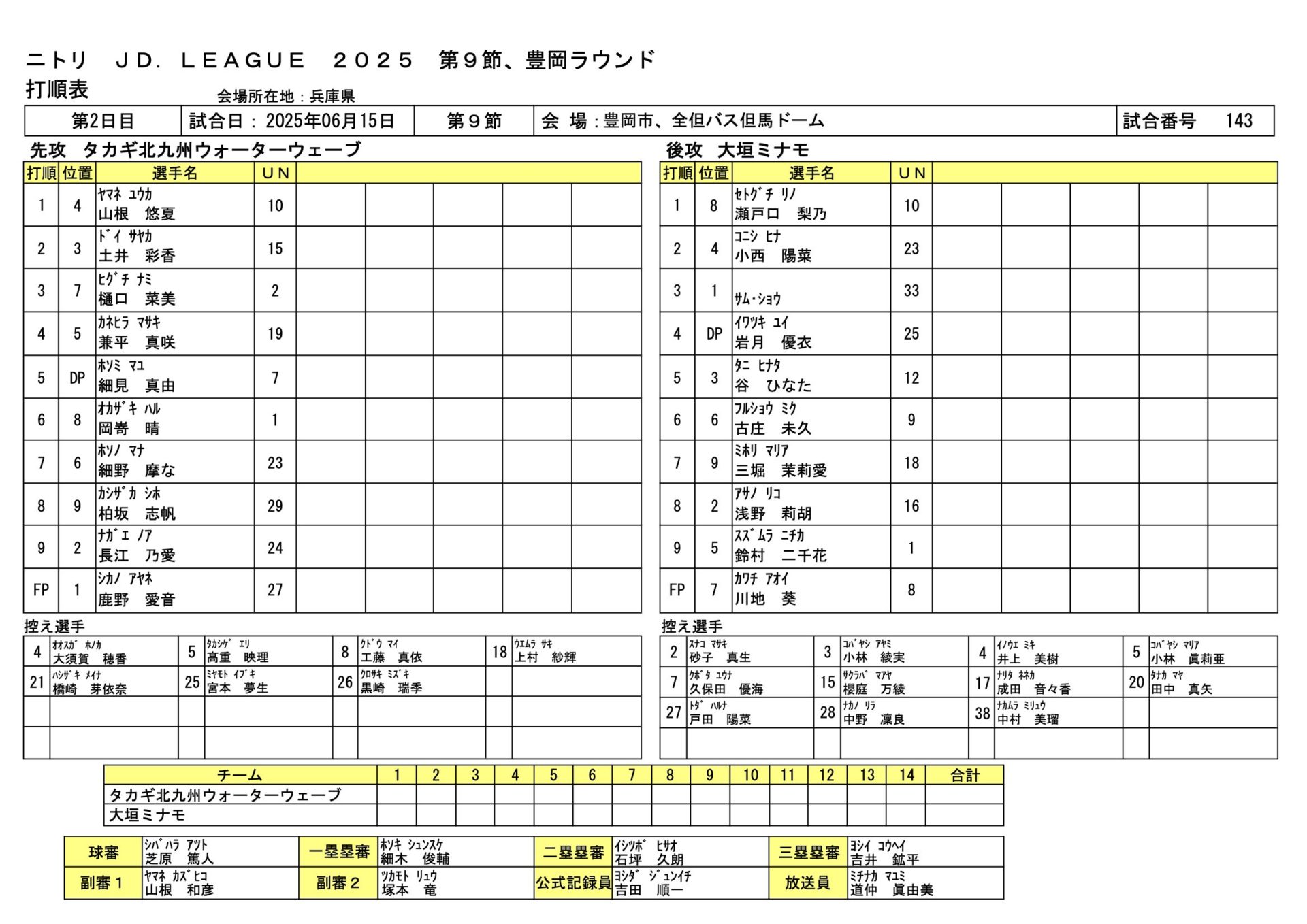 | タカギ北九州 | 0 | 2 | 0 | 0 | 3 | 2 | 0 | 7 | 10 | 2 |