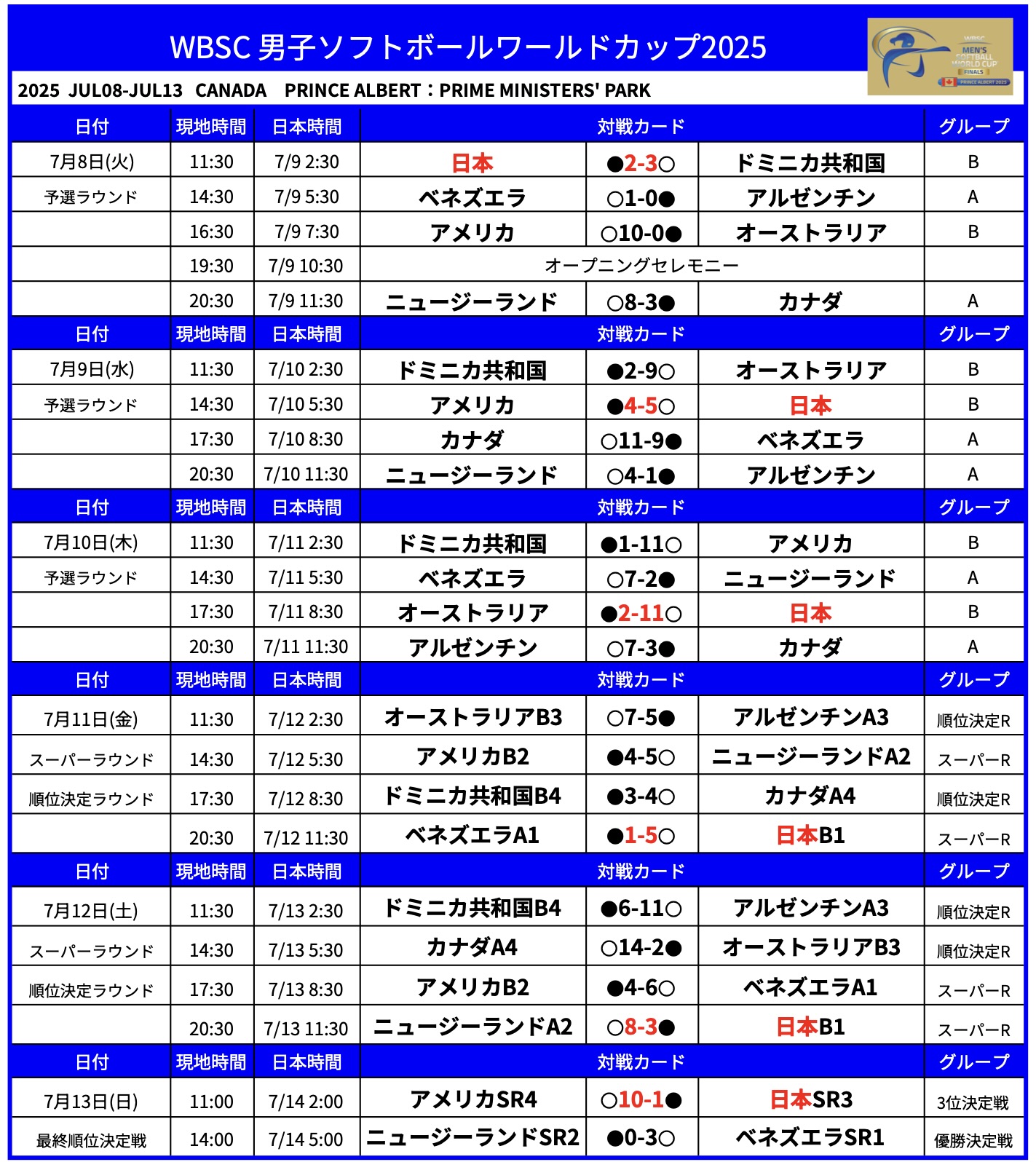 | 7月13日(日) | 11:00 | 7/14 2:00 | アメリカSR4位 | 10-1 | 日本SR3位 | 3位決定戦 |