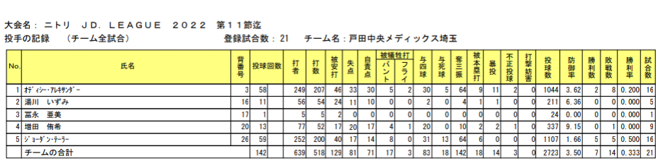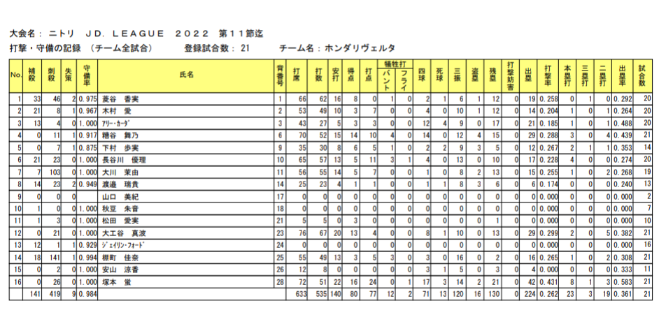 個人成績 ≪ JDリーグ ≫ 第11節まで