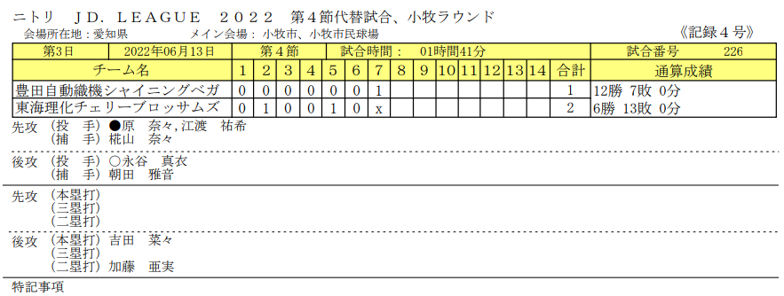 第一試合の豊田自動織機vs東海理化は、第10節の翌日6/13(月)11:00より小牧市民球場で行われた。