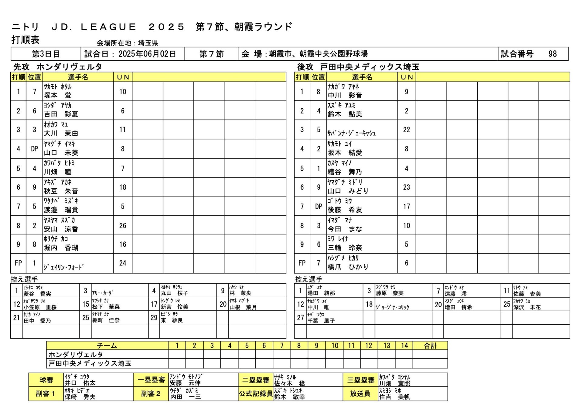 戸田中央2-1ホンダ JDL第7節朝霞ラウンド 2025.6.2 女子ソフトボール試合結果