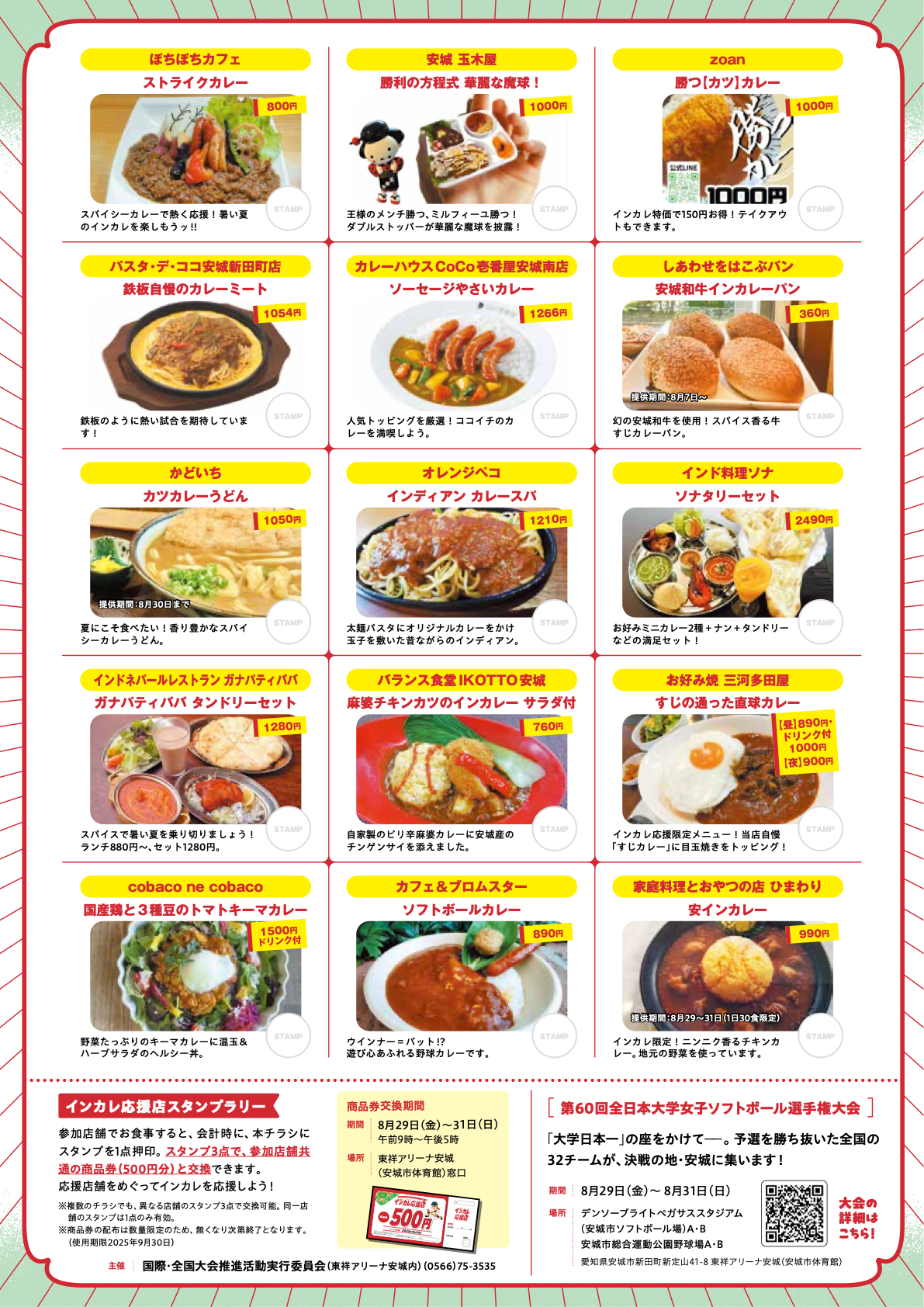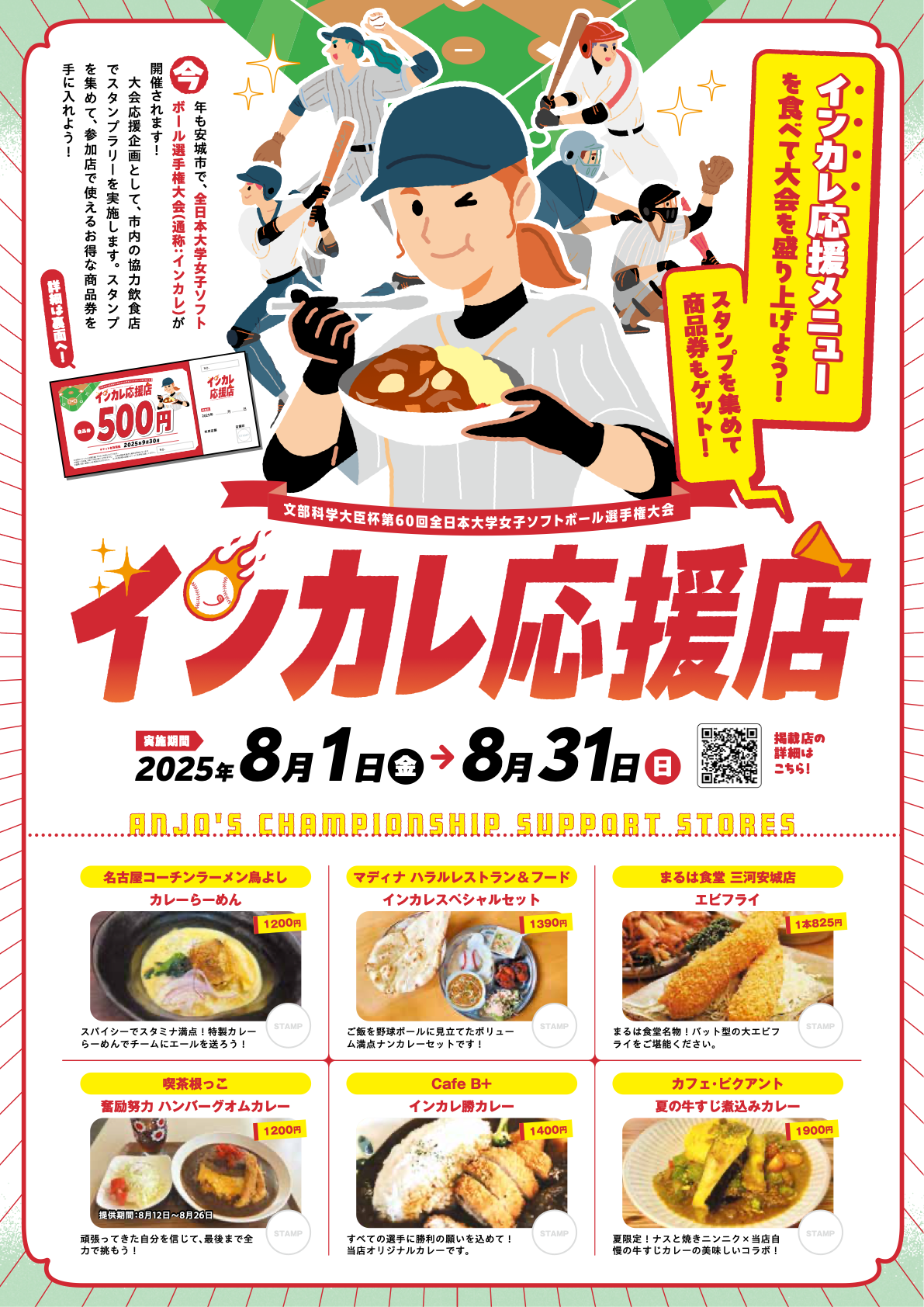 インカレ応援メニューとは、2025年8/29(金)~8/31(日)に安城市で開催される「第60回全日本大学女子ソフトボール選手権大会(通称:インカレ)」を盛り上げることへ賛同いただいた市内飲食店が趣向を凝らしたメニューです。
