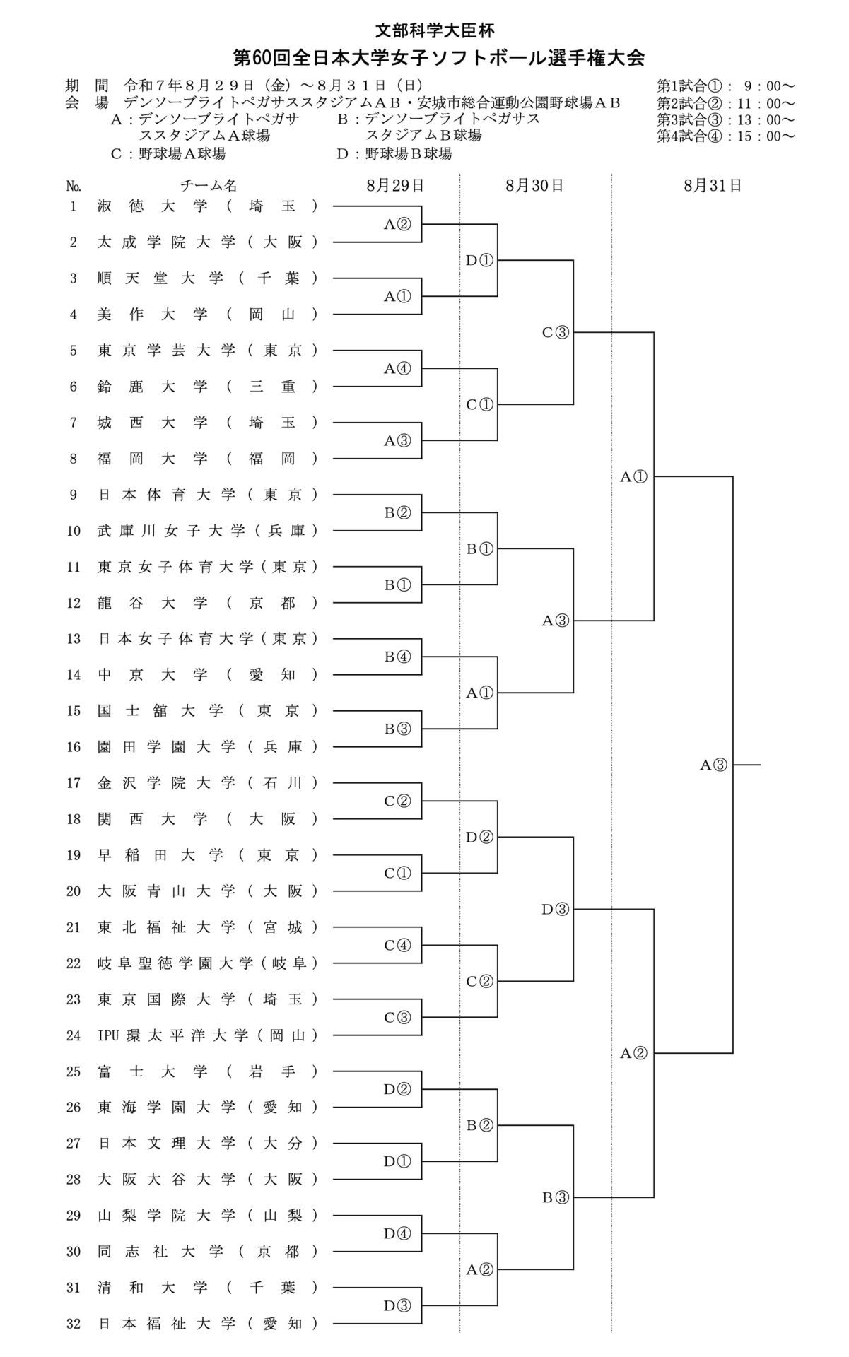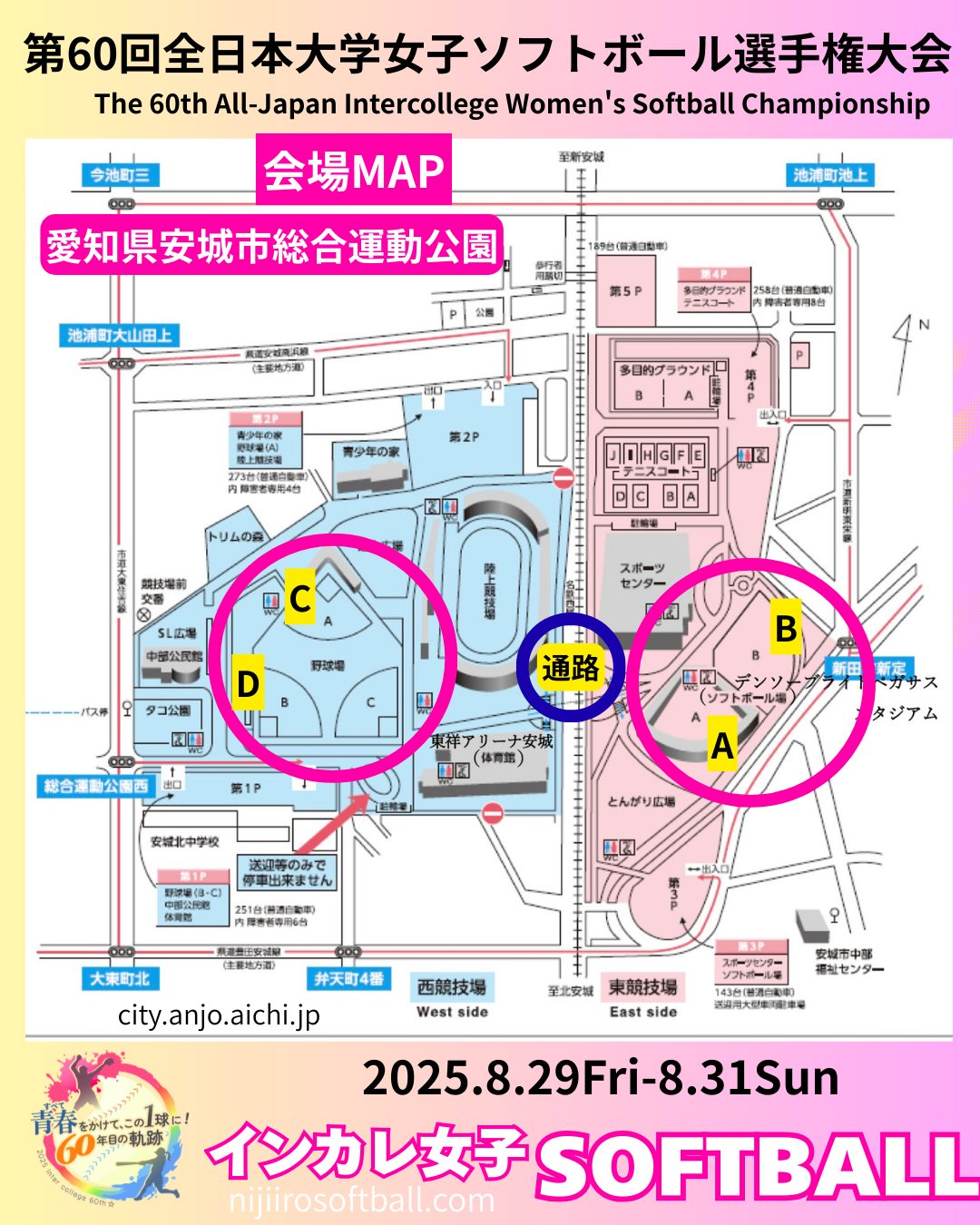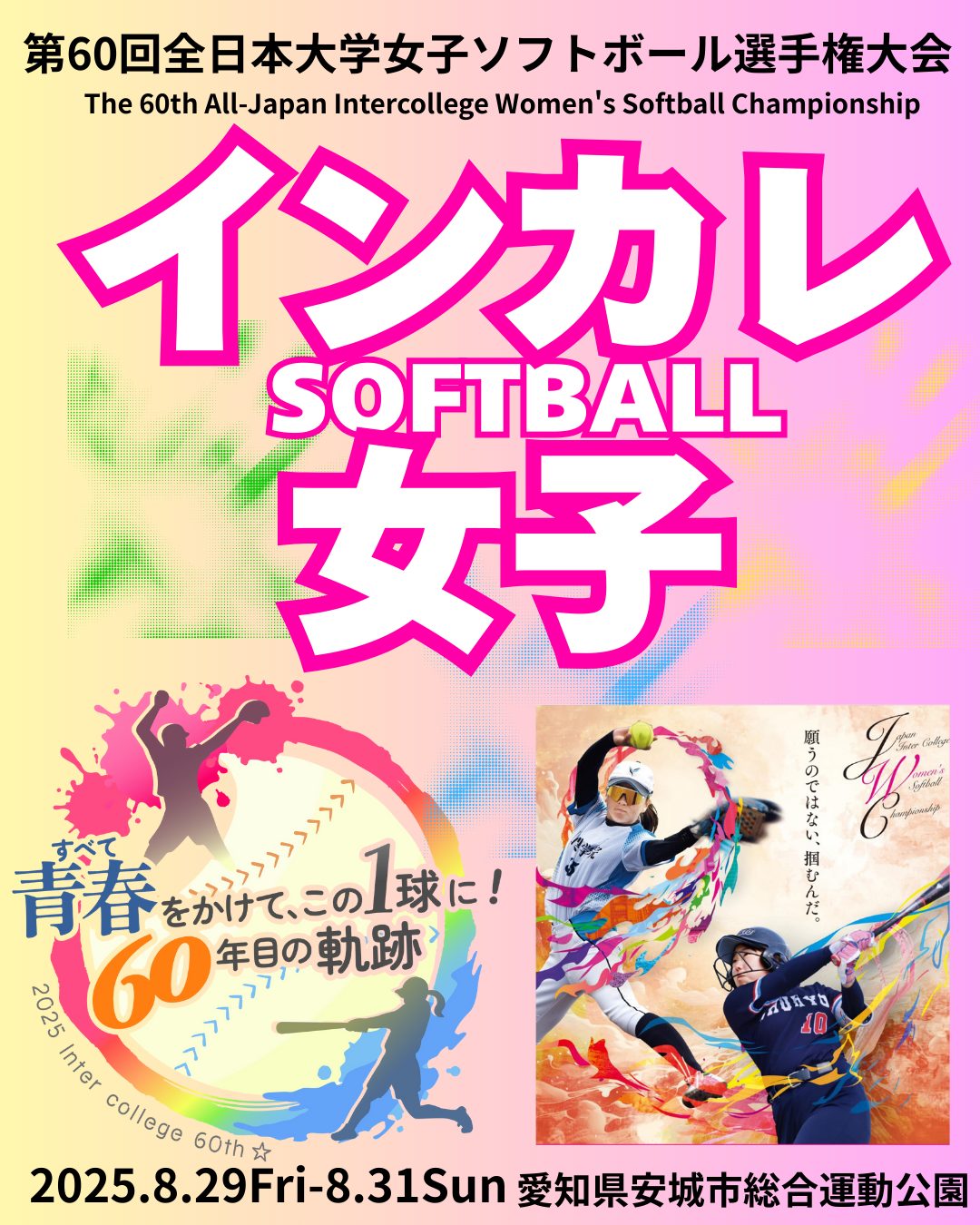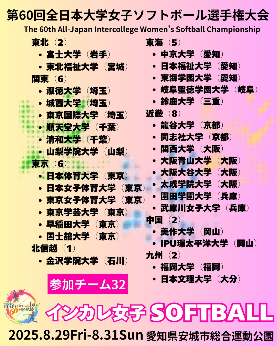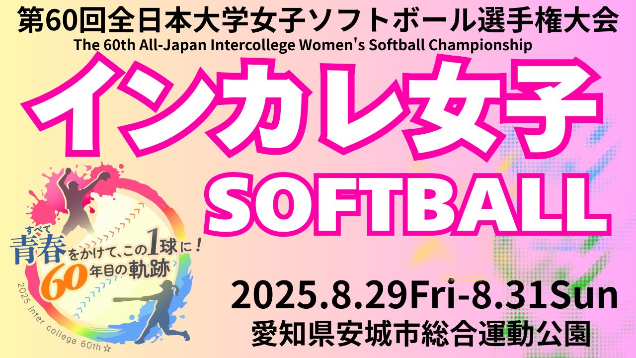 今年もこの季節がやってきました。2025年8/29〜8/31まで愛知県安城市で「第60回全日本大学女子ソフトボール選手権大会」が開催されます。各ブロック予選を勝ち抜いてきた32チームが安城に集結します。今年頂点に立つのはどの大学でしょう。一戦一戦目が離せません!