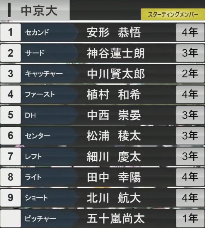 3回2死より中京選手交代