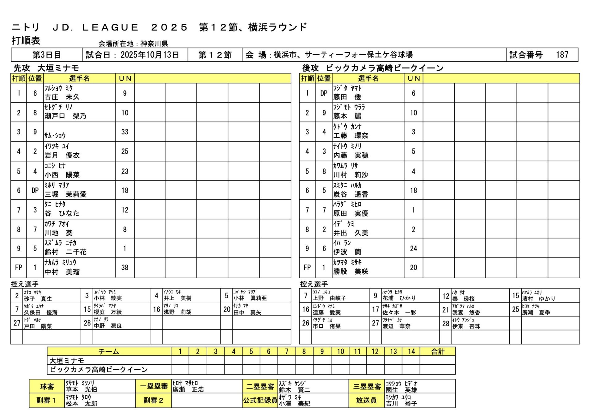 ビックカメラ 8-2 大垣ミナモ JDL第12節横浜ラウンド 2025.10.13 女子ソフトボール試合結果