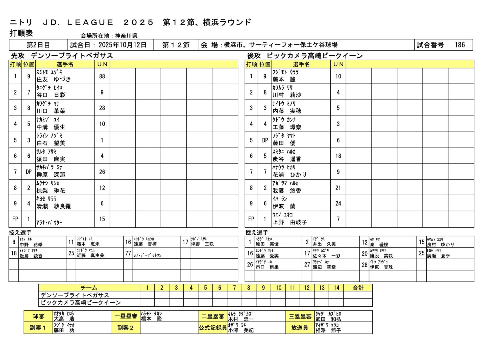 デンソー 6-1ビックカメラ JDL第12節横浜ラウンド 2025.10.12 女子ソフトボール試合結果
