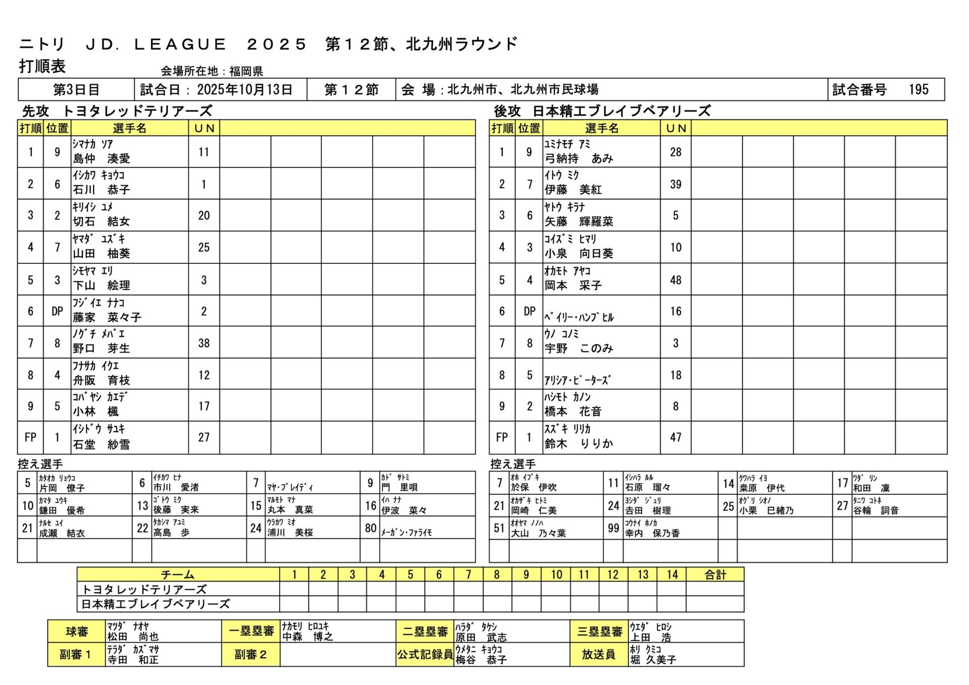 トヨタ 4-3 日本精工 JDL第12節北九州ラウンド 2025.10.13 女子ソフトボール試合結果