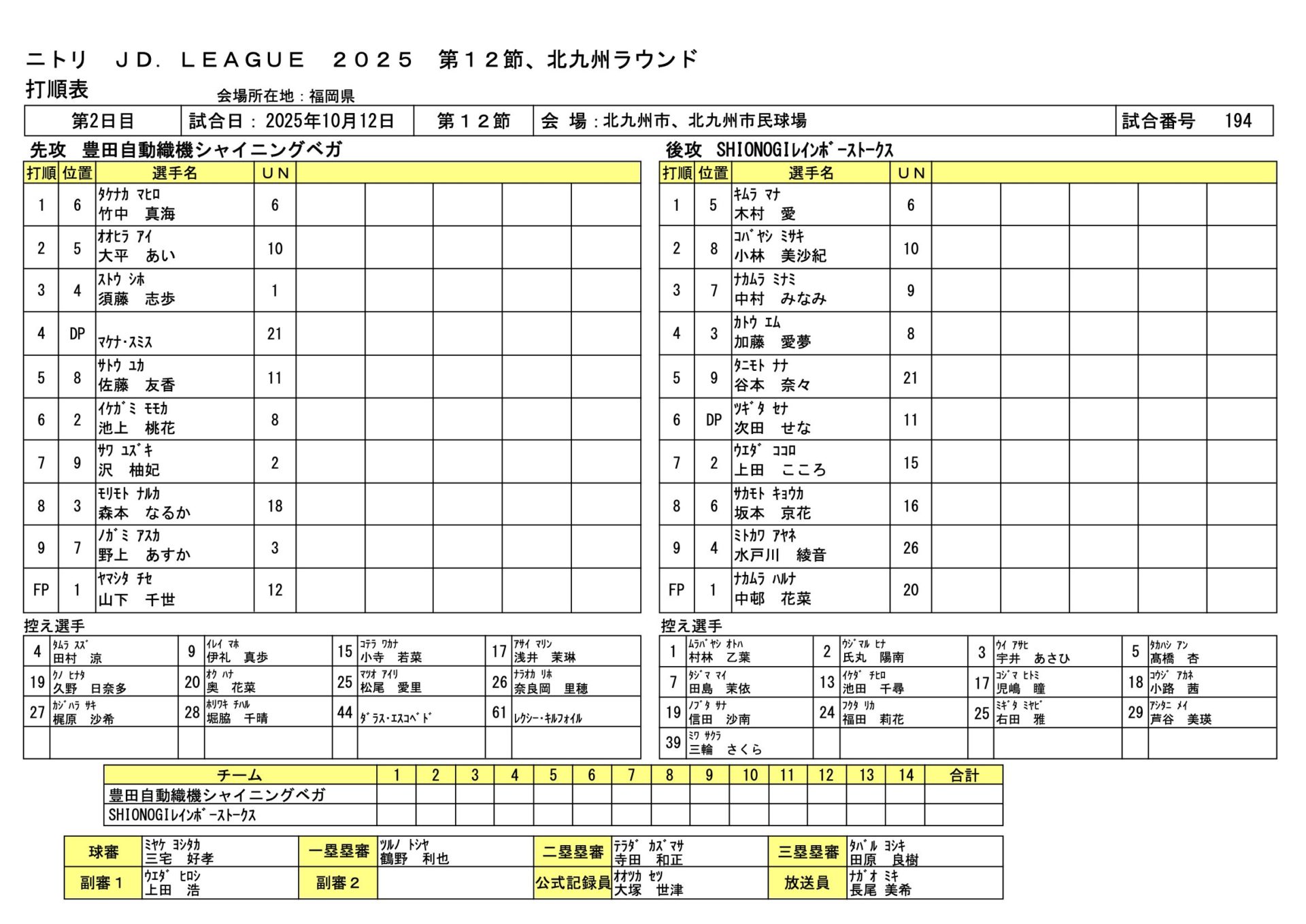 豊田織機 5-1 SHIONOGI JDL第12節北九州ラウンド 2025.10.12 女子ソフトボール試合結果