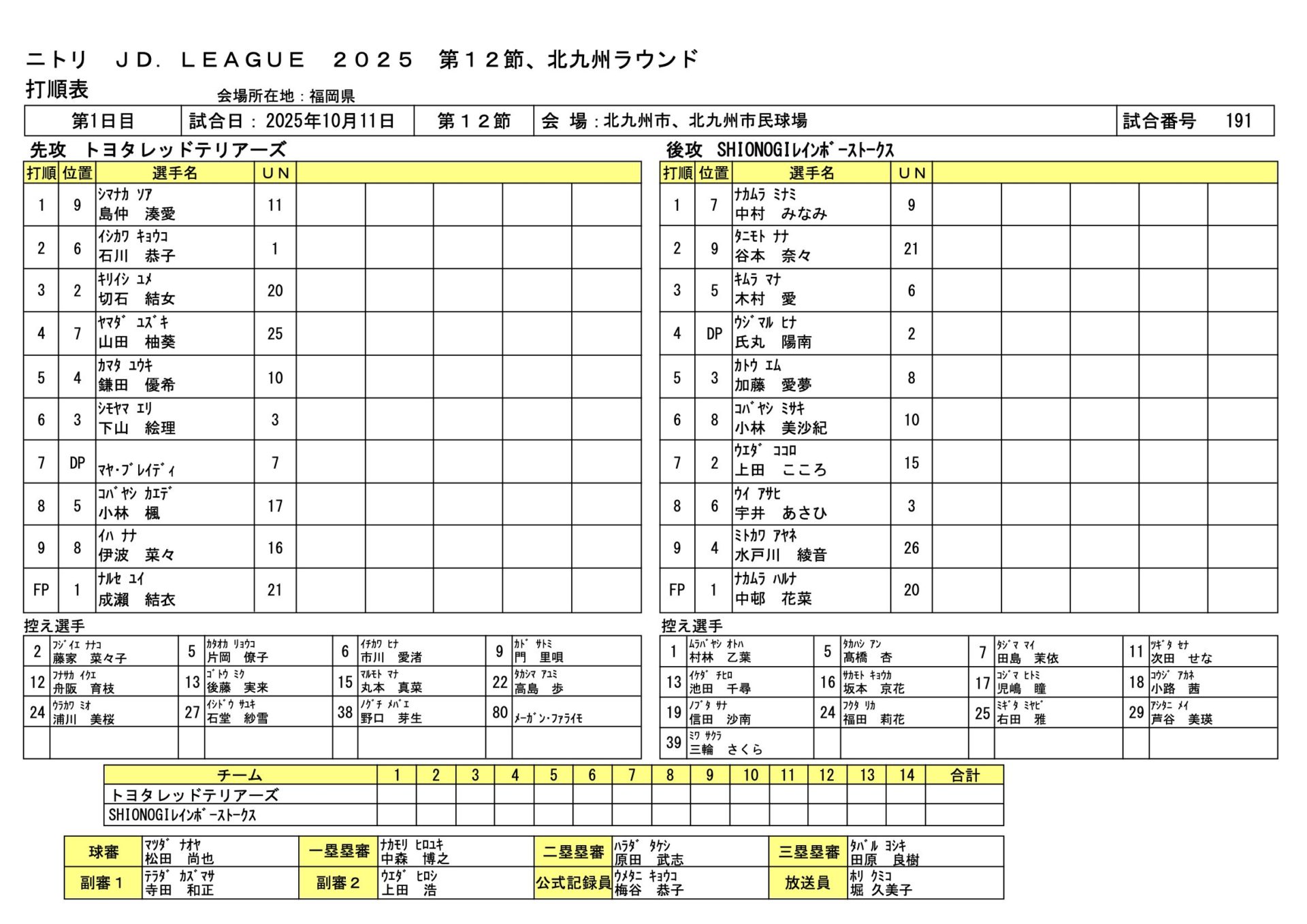 SHIONOGI 6-5 トヨタ JDL第12節北九州ラウンド 2025.10.11 女子ソフトボール試合結果