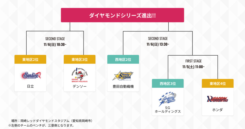 プレーオフは岡崎レッドダイヤモンドスタジアム(愛知県)で11月5日~6日で行われます。