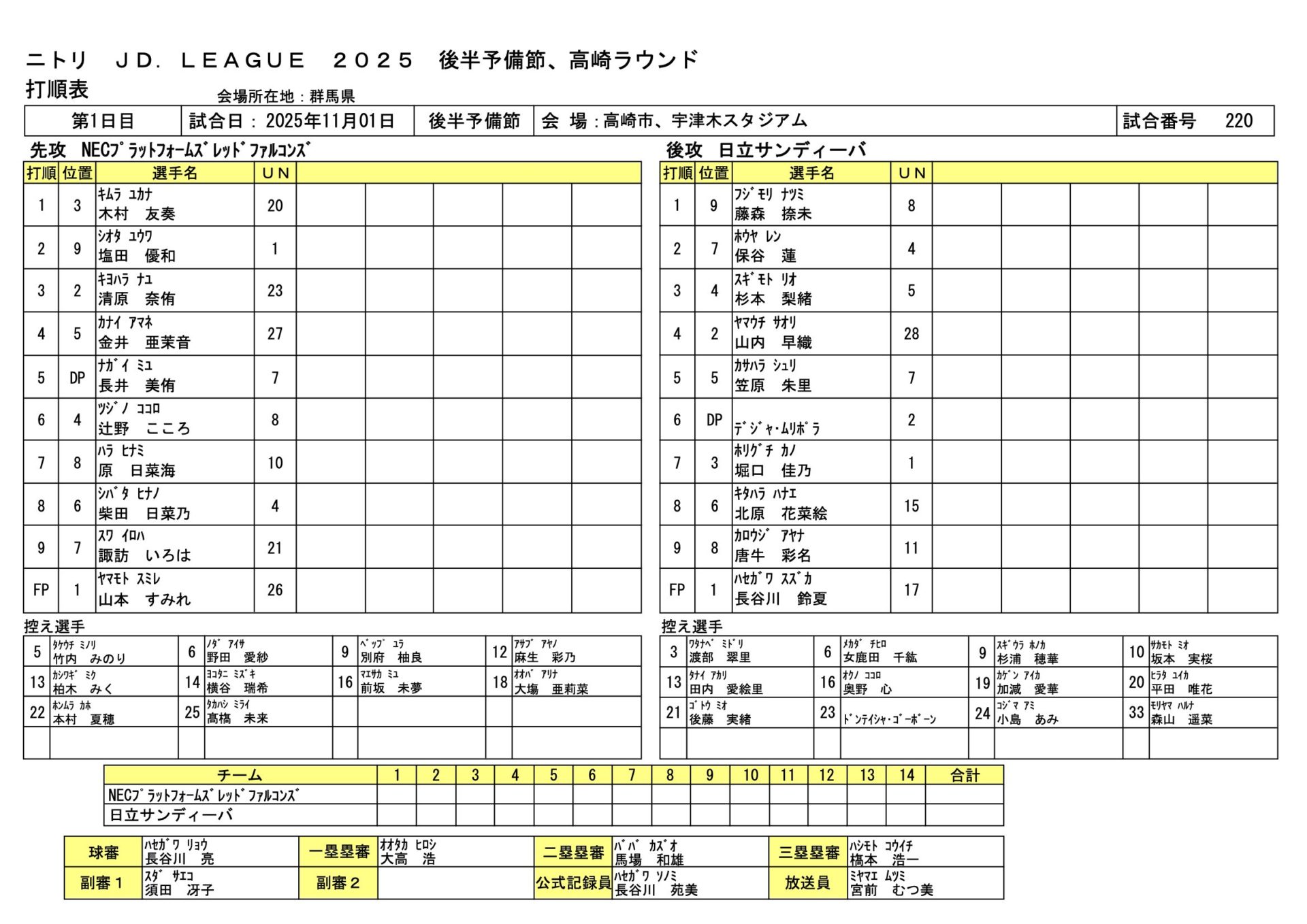 | 日立 | ○長谷川 鈴夏、坂本 実桜、後藤 実緒 - 山内 早織、デジャ・ムリポラ、女鹿田 千紘 |