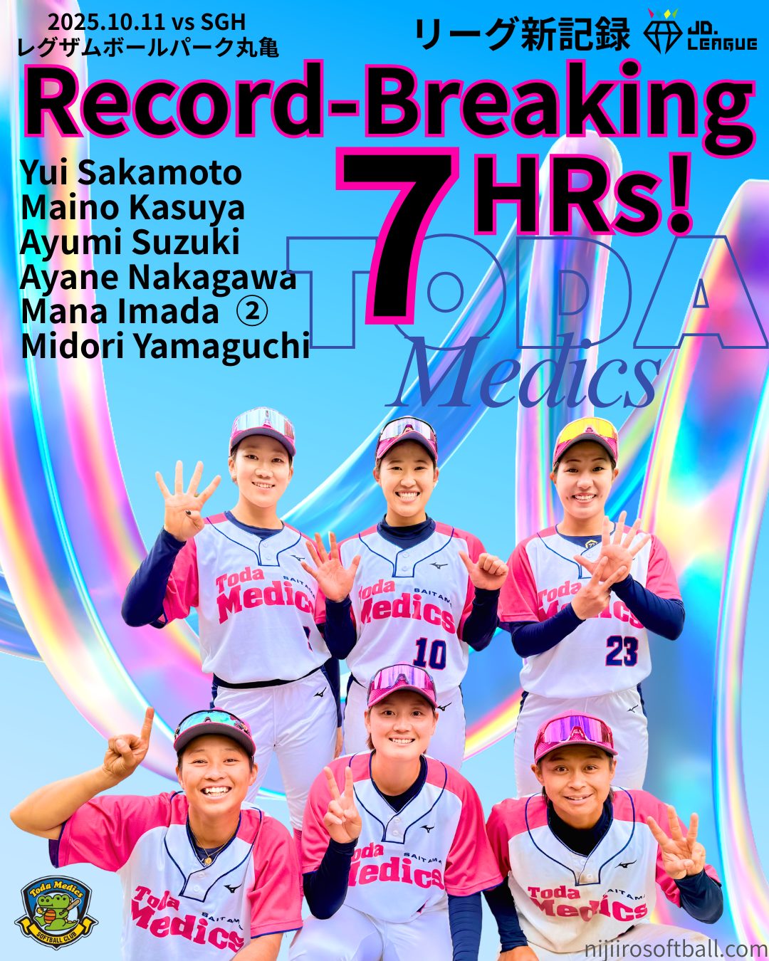 2025年10月11日、香川県丸亀市のレグザムボールパーク丸亀で行われた JDリーグ第12節・丸亀ラウンド(対SGホールディングスギャラクシースターズ戦) において、戸田中央メディクス埼玉 がチームとして 1試合7本塁打 を放ち、リーグ新記録を樹立しました。