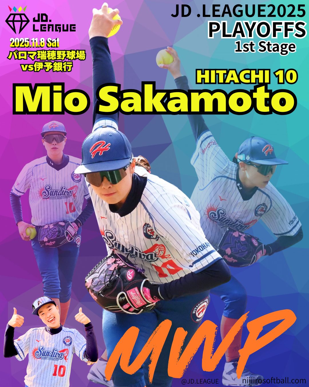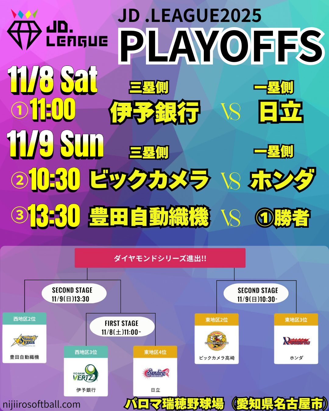 11/8(土)〜11/9(日)にJDリーグプレーオフがパロマ瑞穂野球場(愛知県名古屋市)で開催されます。レギュラーシーズン上位の5チームが集結し、ダイヤモンドシリーズへの出場権2枠を競います。