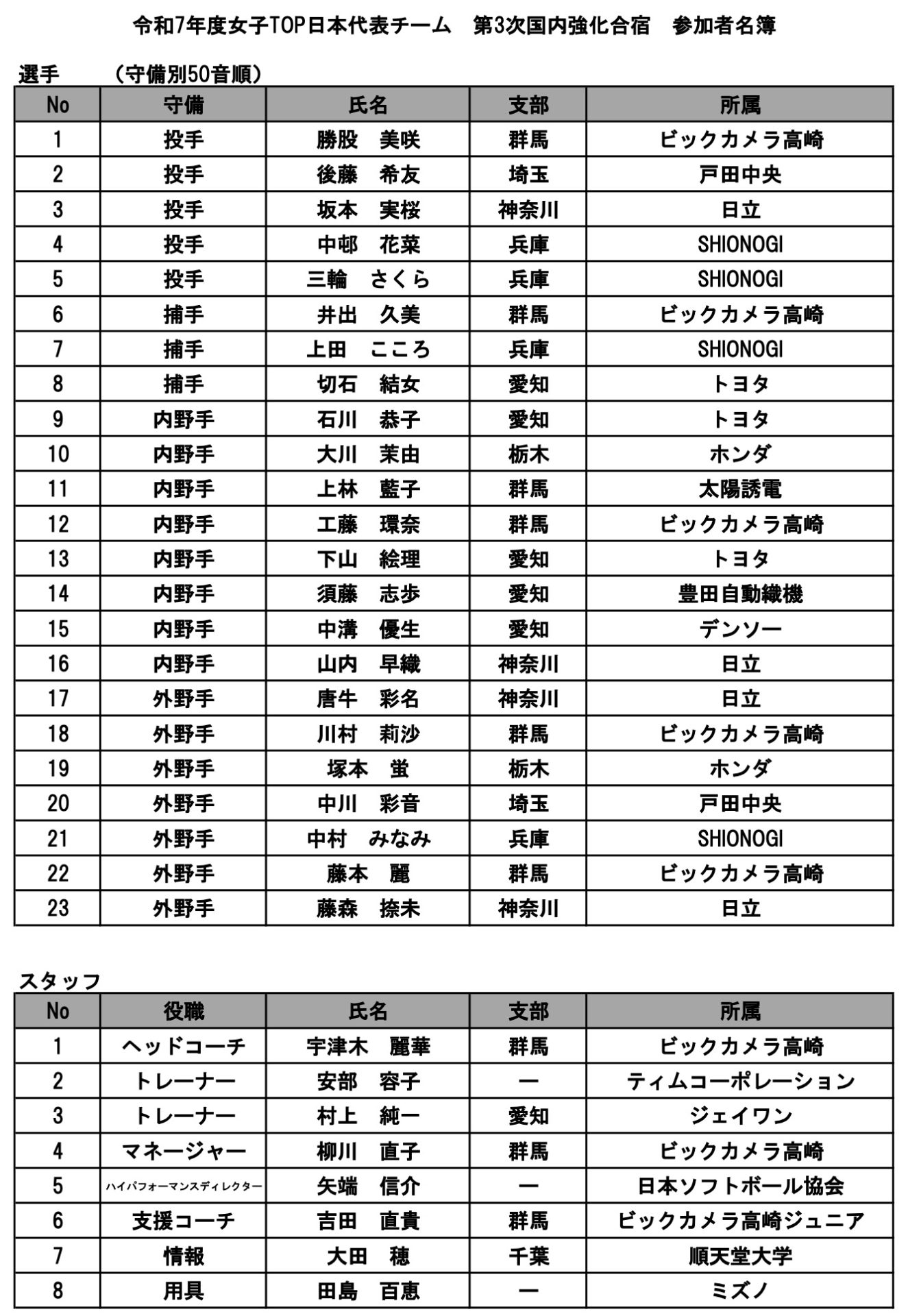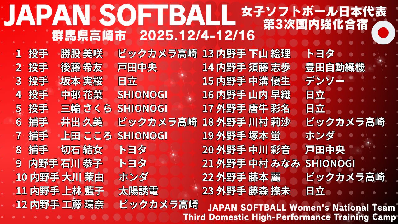 | 2025.12/4-12/16 | 第3次国内強化合宿 | 群馬県高崎市・宇津木スタジアム |