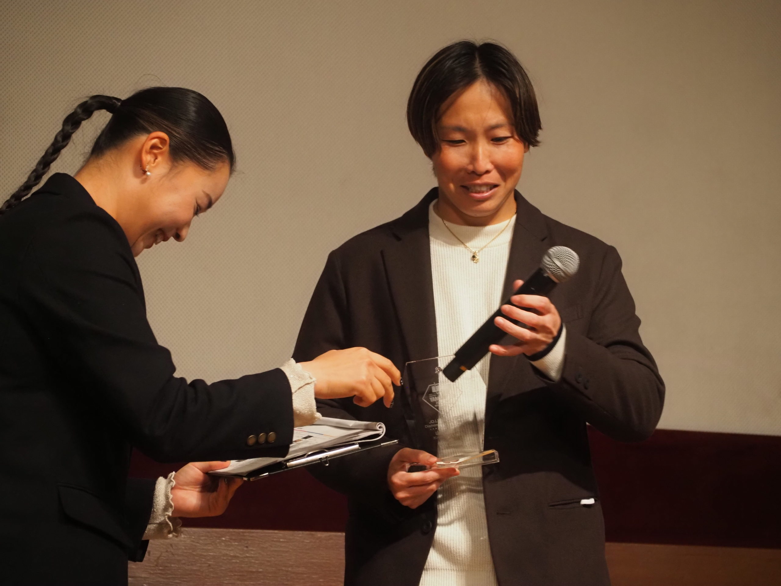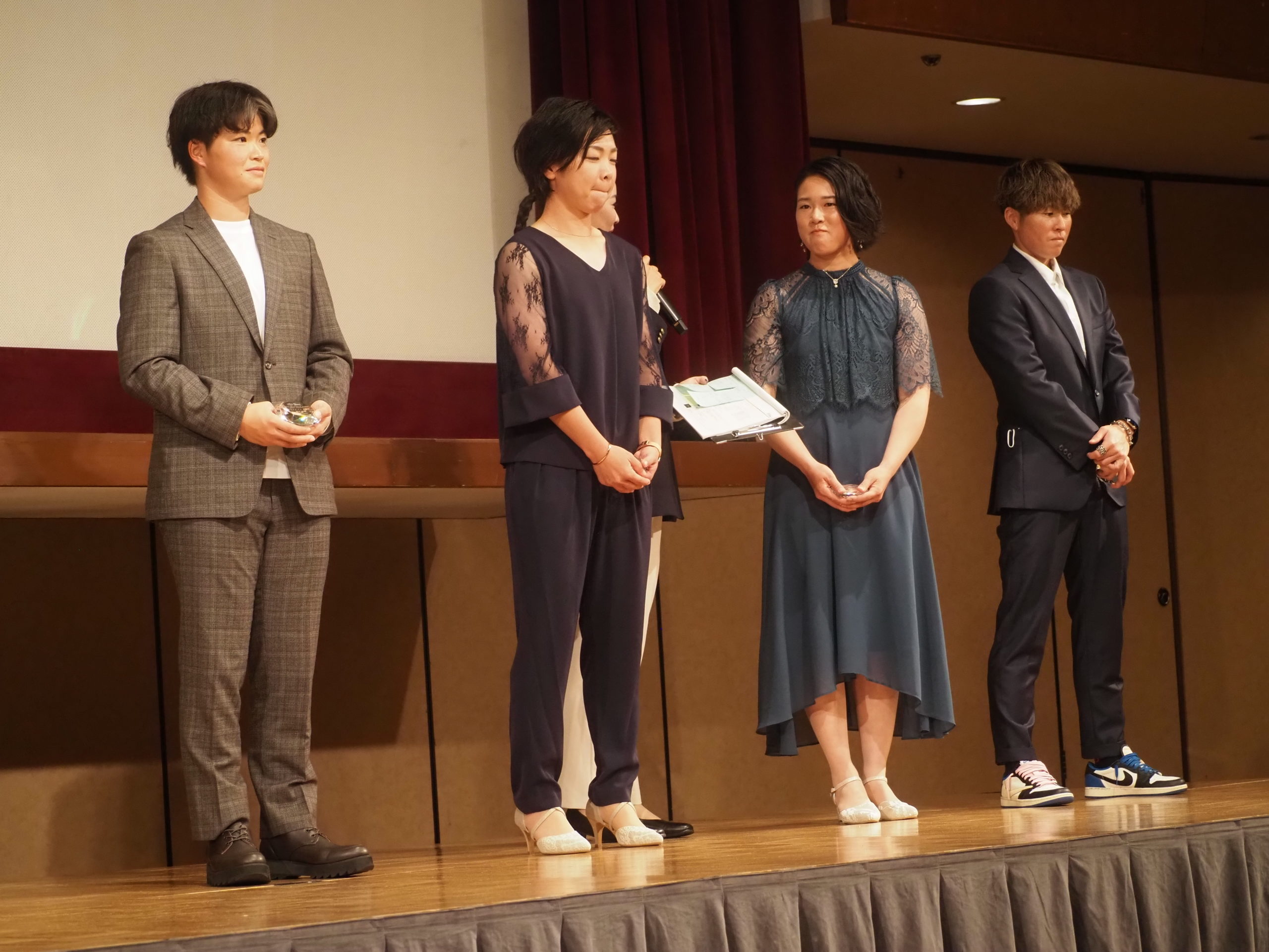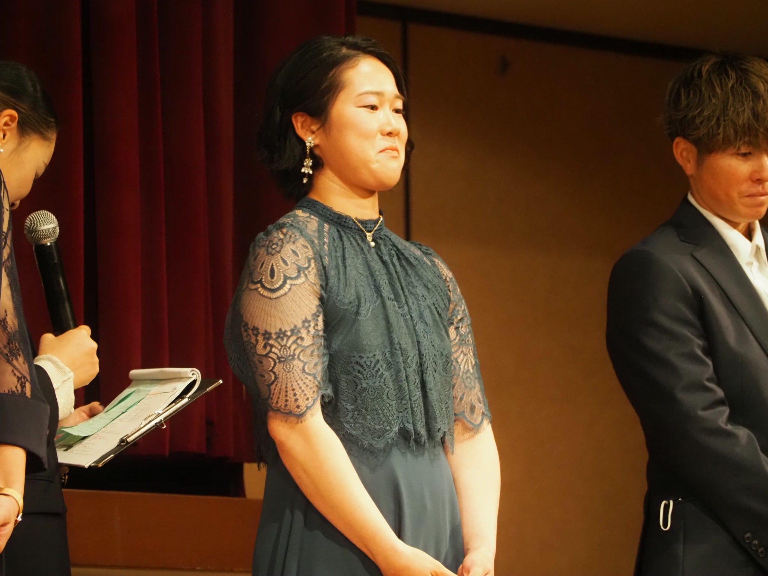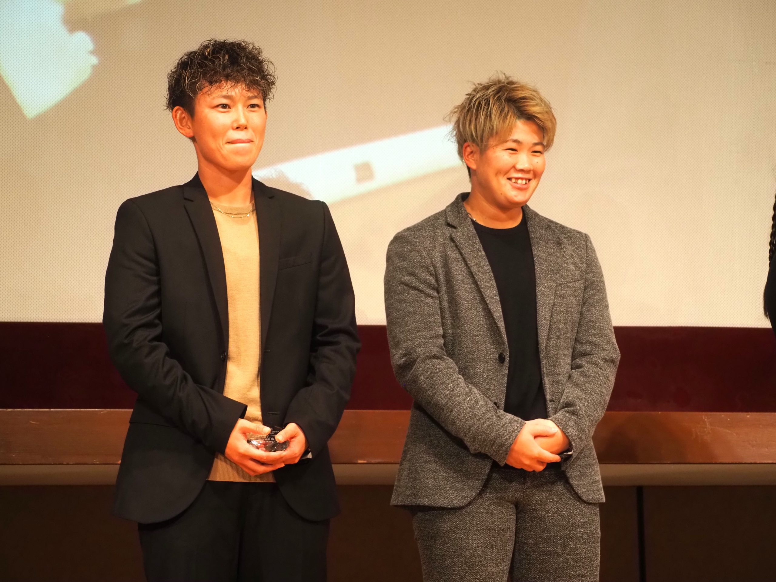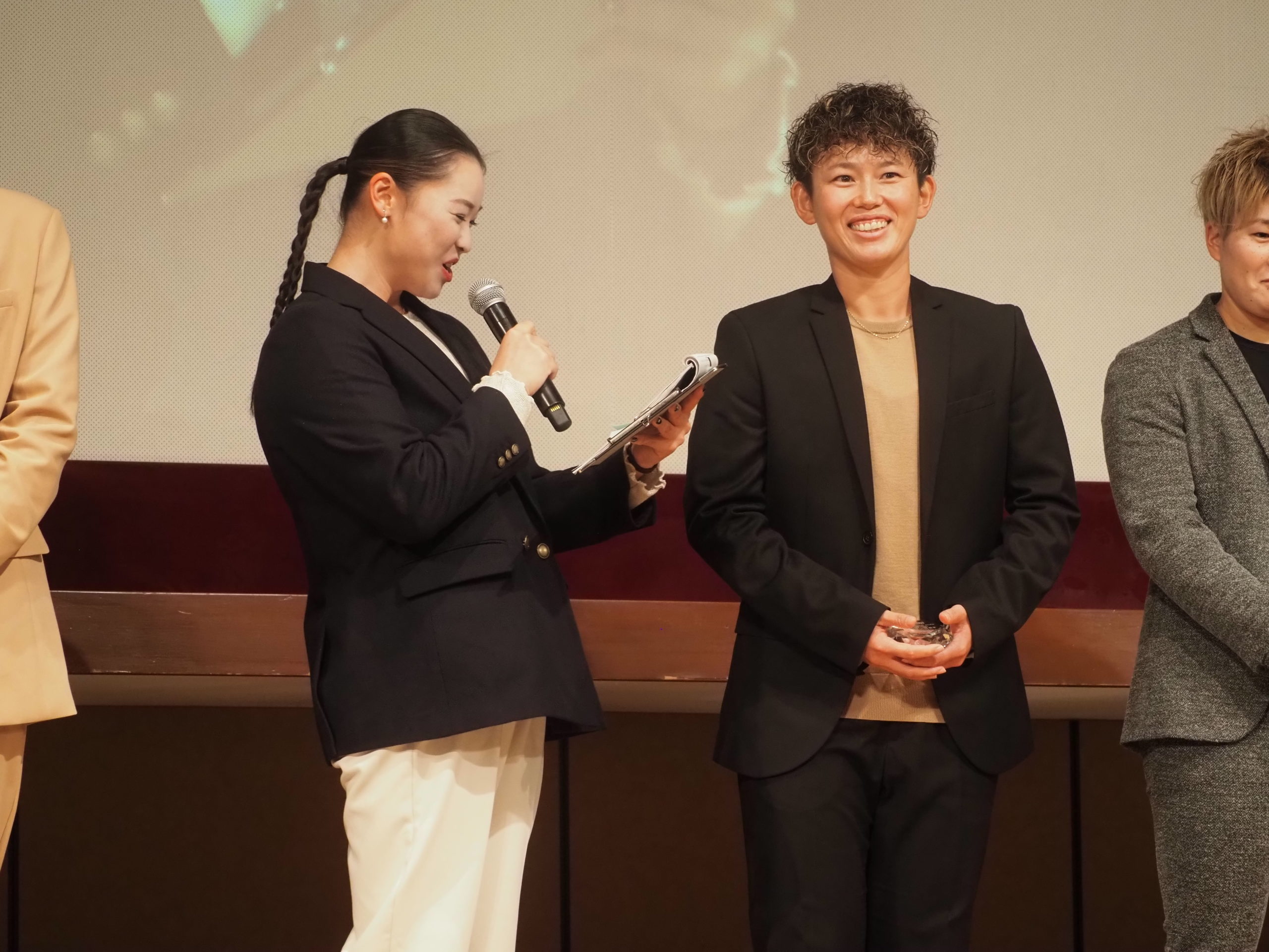 杉浦選手は、12盗塁、松瀬選手は15盗塁でした。杉浦選手は高卒2年目、「塁に出たら走る」という村山監督の方針で、走のスペシャリストとしてランナーが出たら代走として出場し、数々の盗塁を決めてチームの勝利に貢献しました。プレゼンターは、今回会場に来られていた杉浦選手のお父様。1組2名で3万円というスペシャルチケットを購入しての参加。しかし実娘の晴れ舞台に並ぶことができプライスレスな価値があったのではないでしょうか?お父様から質問の来年の目標については、「今シーズンの記録を上回り、足を生かして走攻守で活躍したい」と答えました。また、松瀬選手は太陽誘電からの移籍1年目。大学同期の床次マネージャーの支えもあり新チームでも大活躍。「来年は、今年の記録を上回り2年連続盗塁王を獲ることと足を生かして勝利に貢献したい」と話しました。インタビュアーの須藤麻里子選手(大垣ミナモ)は「お二人とも明るいチームの中で、気づいたらセカンドベースにいる。来年も足を生かしたプレーを魅せていただけることでしょう」とコメントしました。
