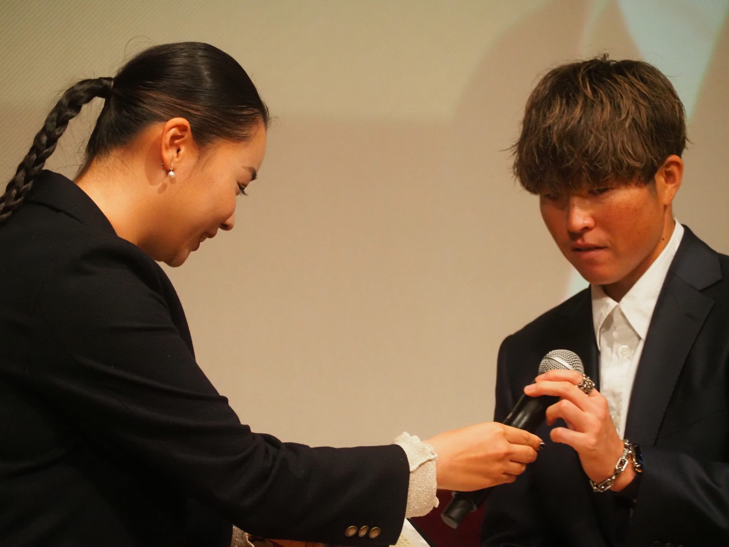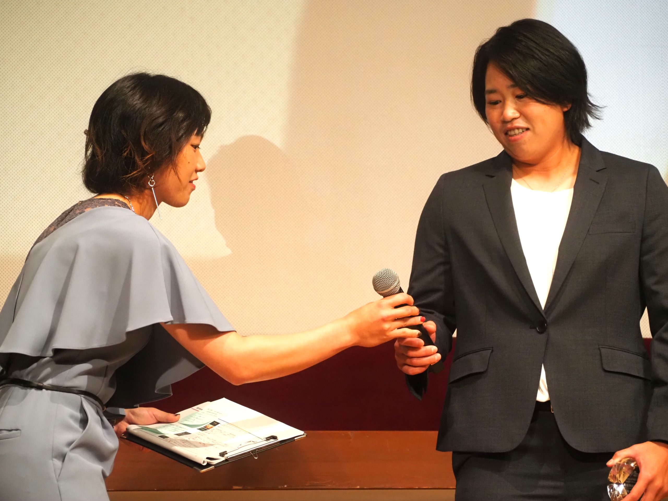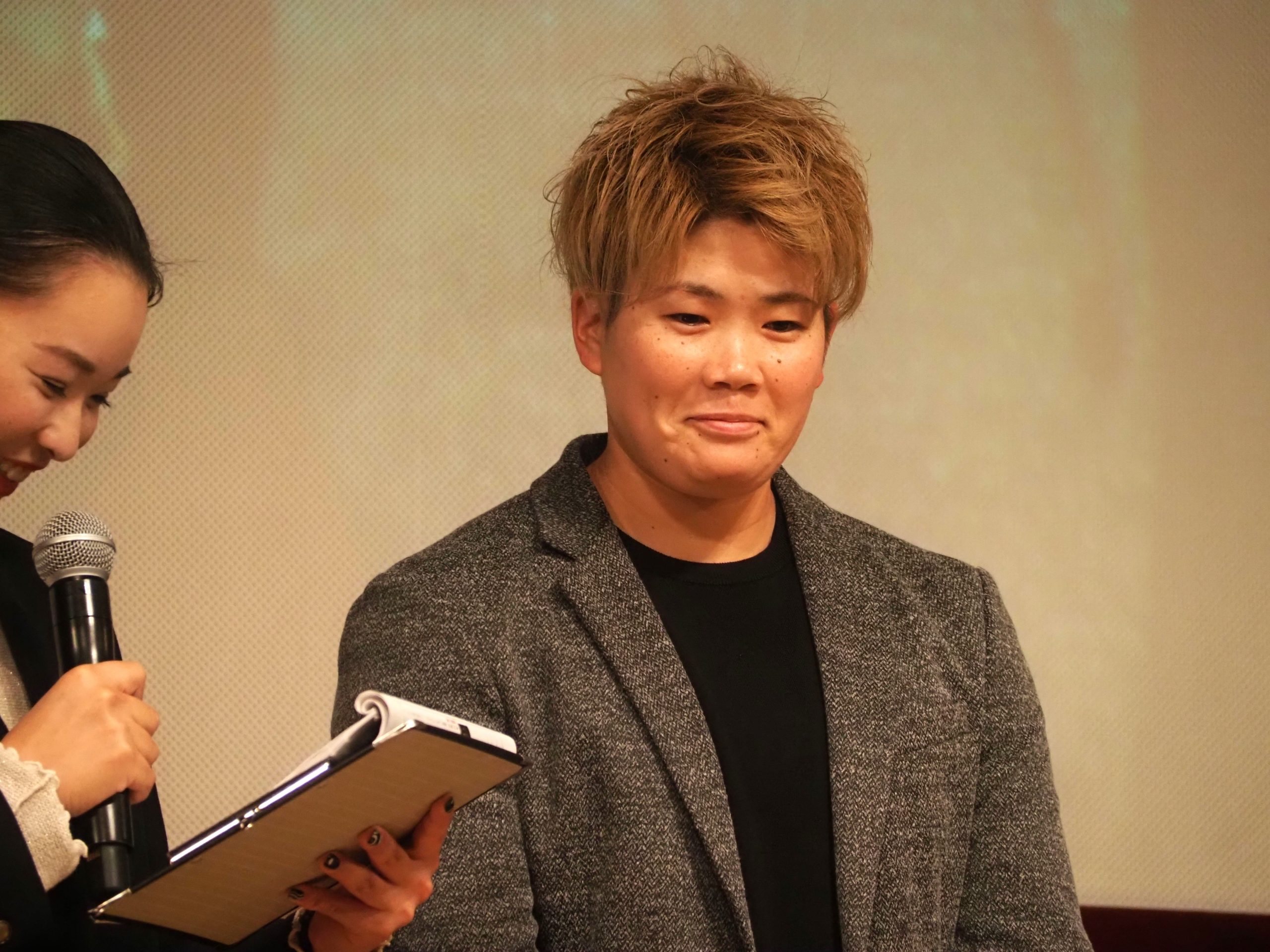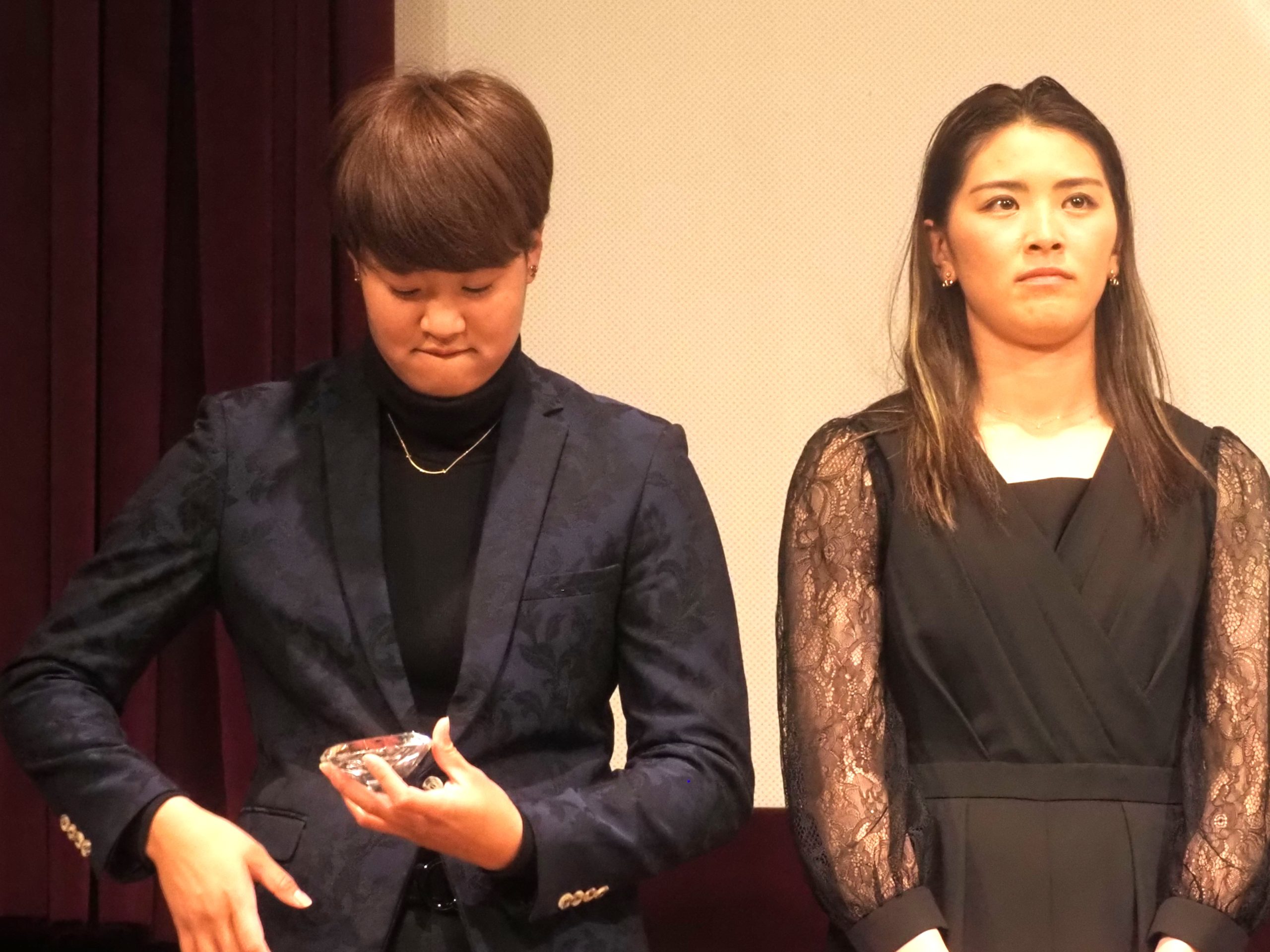 杉浦選手は、12盗塁、松瀬選手は15盗塁でした。杉浦選手は高卒2年目、「塁に出たら走る」という村山監督の方針で、走のスペシャリストとしてランナーが出たら代走として出場し、数々の盗塁を決めてチームの勝利に貢献しました。プレゼンターは、今回会場に来られていた杉浦選手のお父様。1組2名で3万円というスペシャルチケットを購入しての参加。しかし実娘の晴れ舞台に並ぶことができプライスレスな価値があったのではないでしょうか?お父様から質問の来年の目標については、「今シーズンの記録を上回り、足を生かして走攻守で活躍したい」と答えました。また、松瀬選手は太陽誘電からの移籍1年目。大学同期の床次マネージャーの支えもあり新チームでも大活躍。「来年は、今年の記録を上回り2年連続盗塁王を獲ることと足を生かして勝利に貢献したい」と話しました。インタビュアーの須藤麻里子選手(大垣ミナモ)は「お二人とも明るいチームの中で、気づいたらセカンドベースにいる。来年も足を生かしたプレーを魅せていただけることでしょう」とコメントしました。