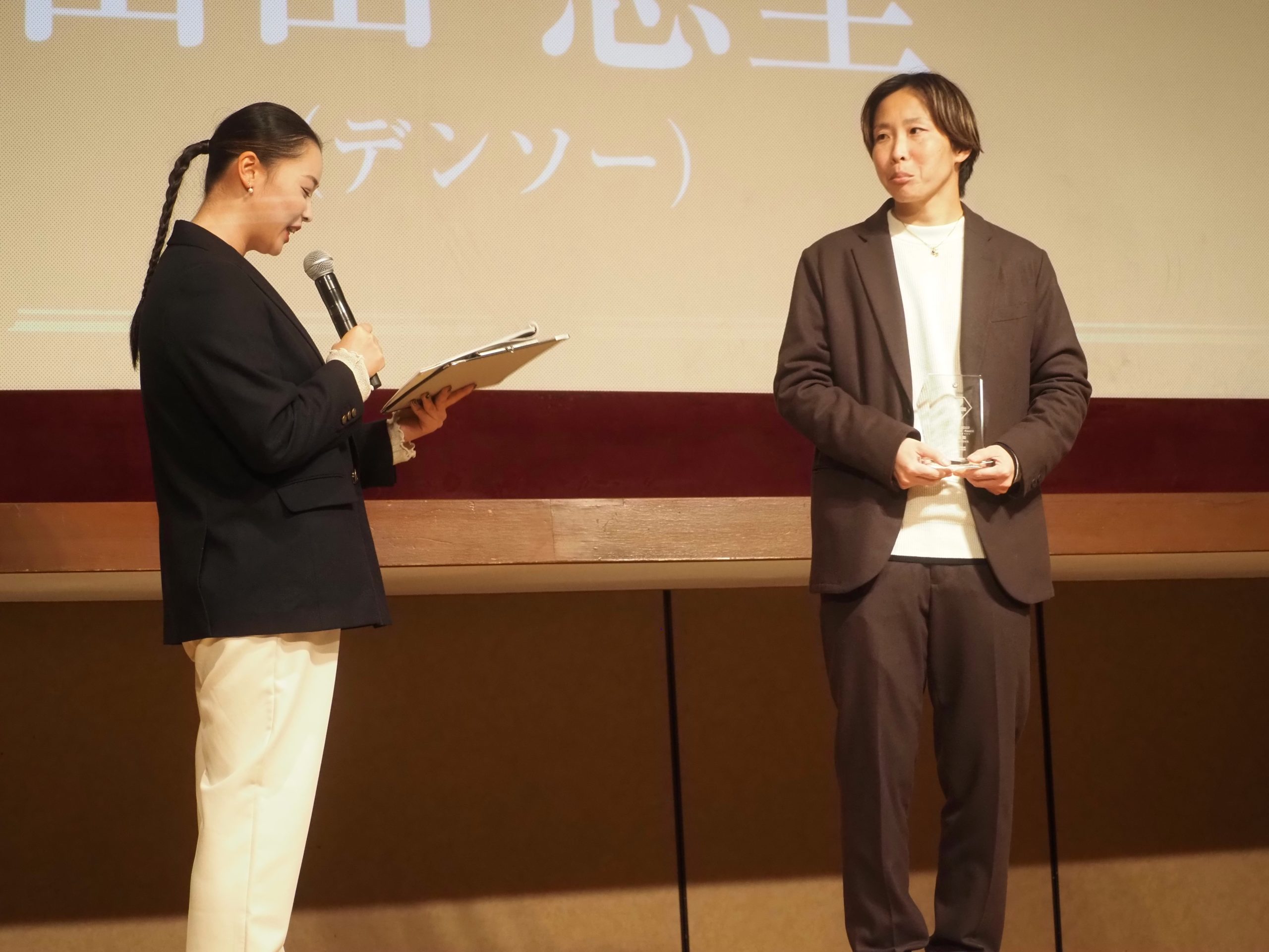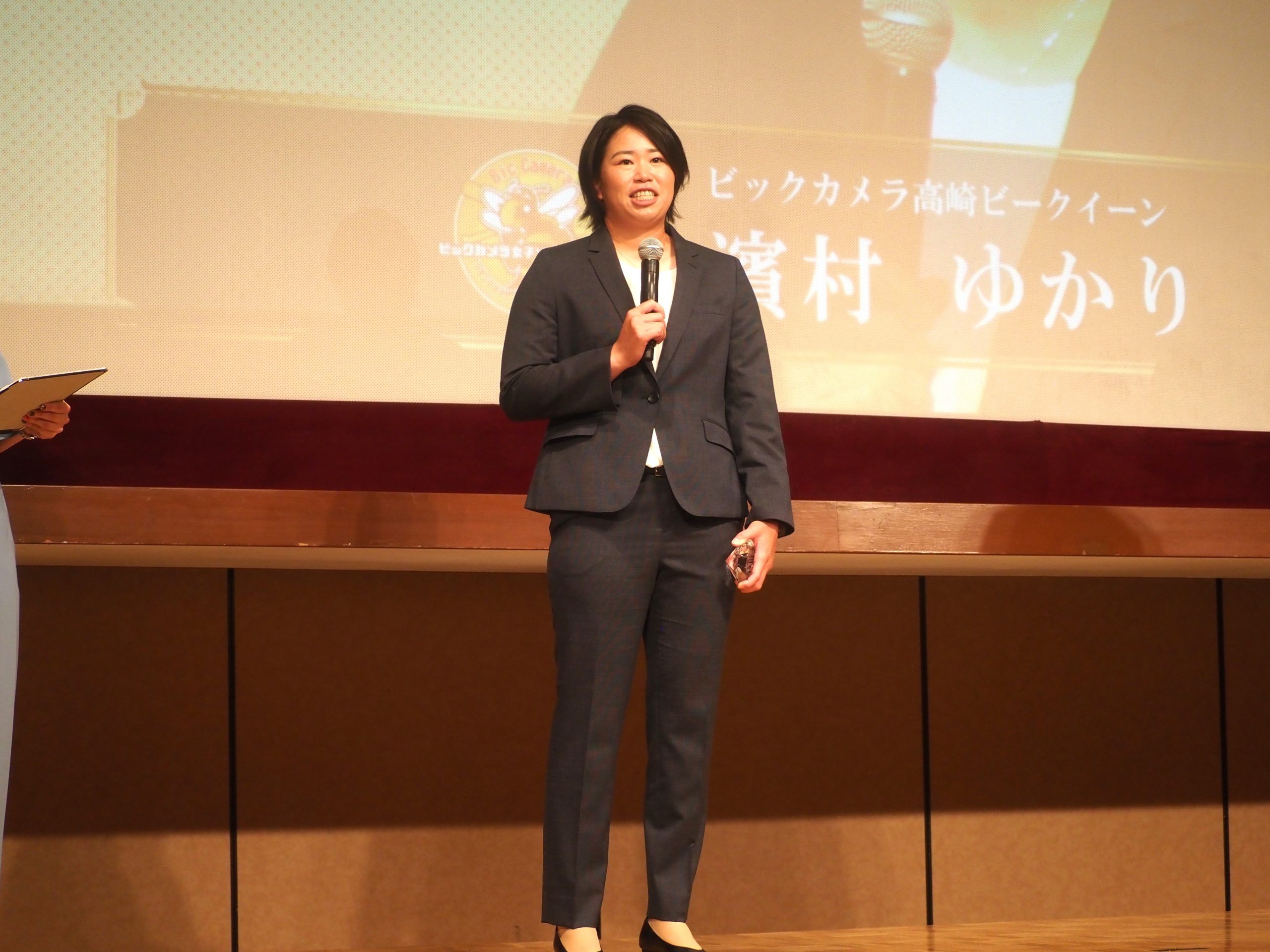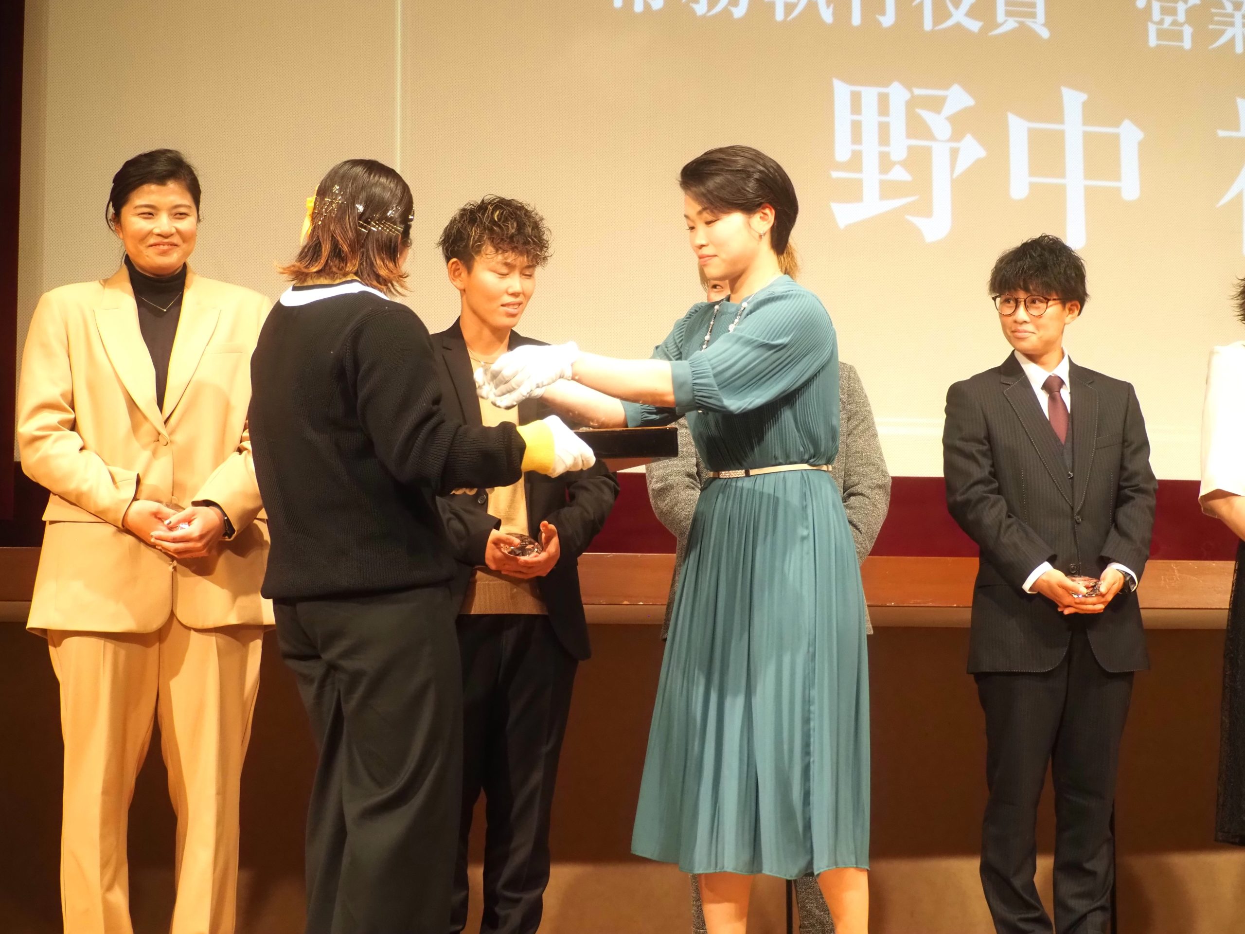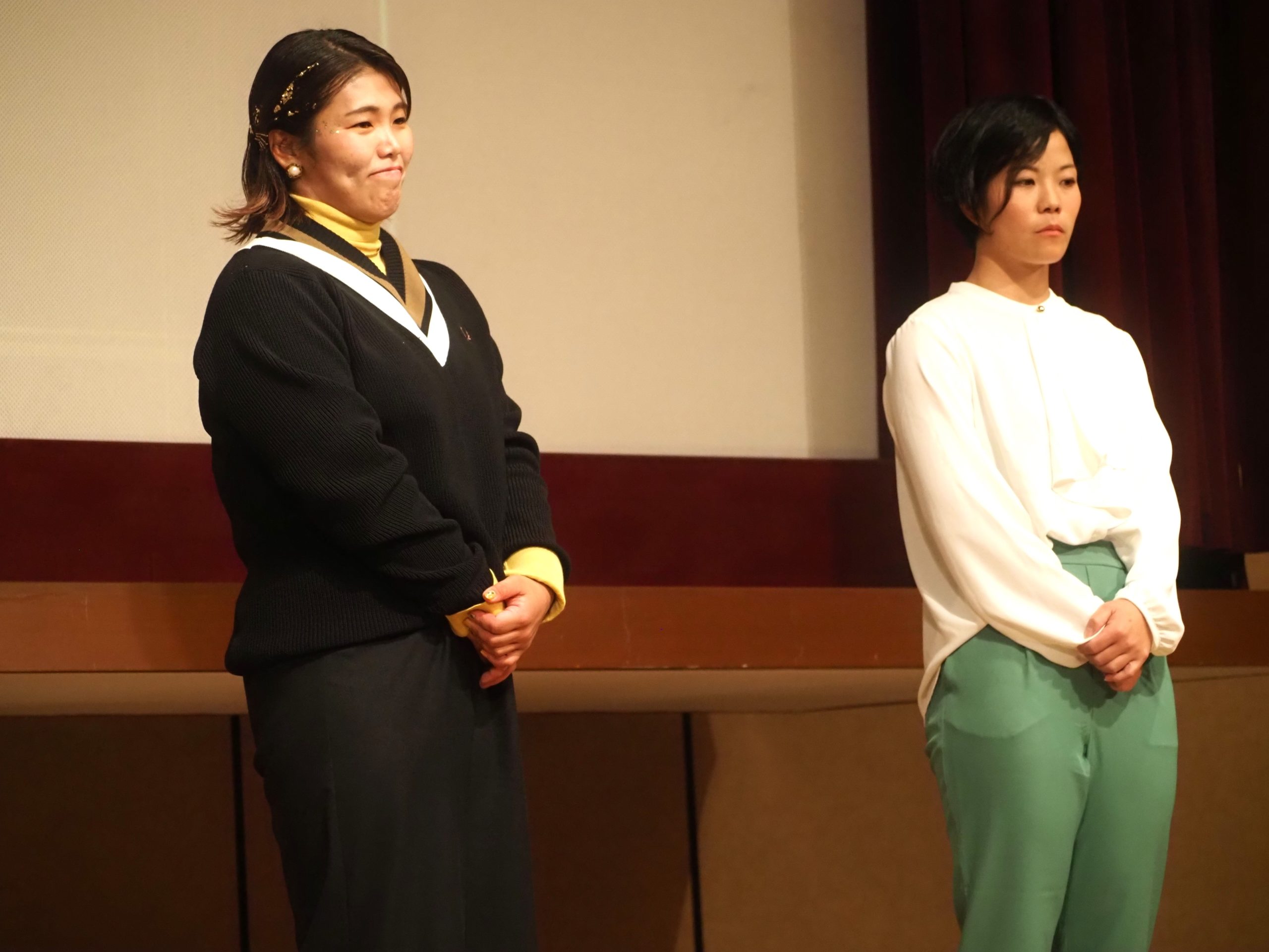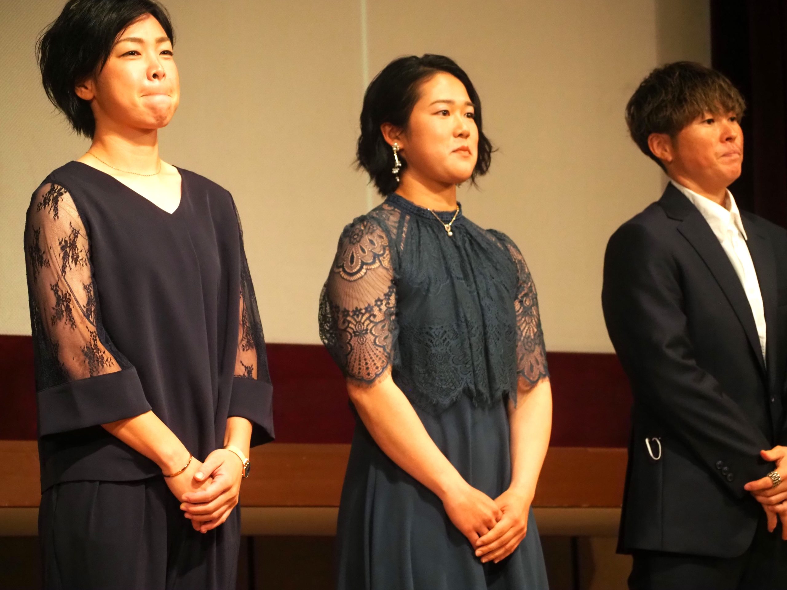 杉浦選手は、12盗塁、松瀬選手は15盗塁でした。杉浦選手は高卒2年目、「塁に出たら走る」という村山監督の方針で、走のスペシャリストとしてランナーが出たら代走として出場し、数々の盗塁を決めてチームの勝利に貢献しました。プレゼンターは、今回会場に来られていた杉浦選手のお父様。1組2名で3万円というスペシャルチケットを購入しての参加。しかし実娘の晴れ舞台に並ぶことができプライスレスな価値があったのではないでしょうか?お父様から質問の来年の目標については、「今シーズンの記録を上回り、足を生かして走攻守で活躍したい」と答えました。また、松瀬選手は太陽誘電からの移籍1年目。大学同期の床次マネージャーの支えもあり新チームでも大活躍。「来年は、今年の記録を上回り2年連続盗塁王を獲ることと足を生かして勝利に貢献したい」と話しました。インタビュアーの須藤麻里子選手(大垣ミナモ)は「お二人とも明るいチームの中で、気づいたらセカンドベースにいる。来年も足を生かしたプレーを魅せていただけることでしょう」とコメントしました。