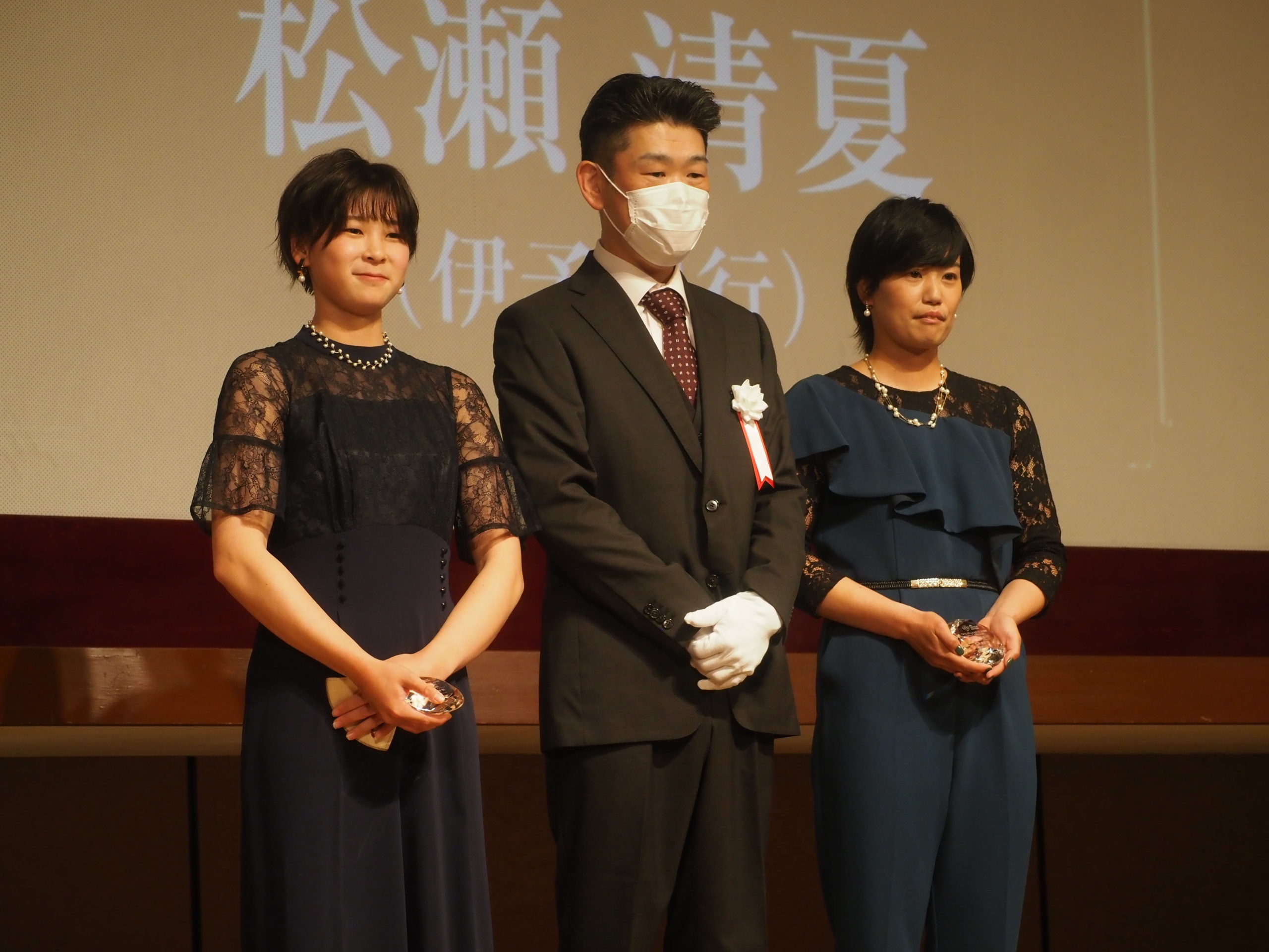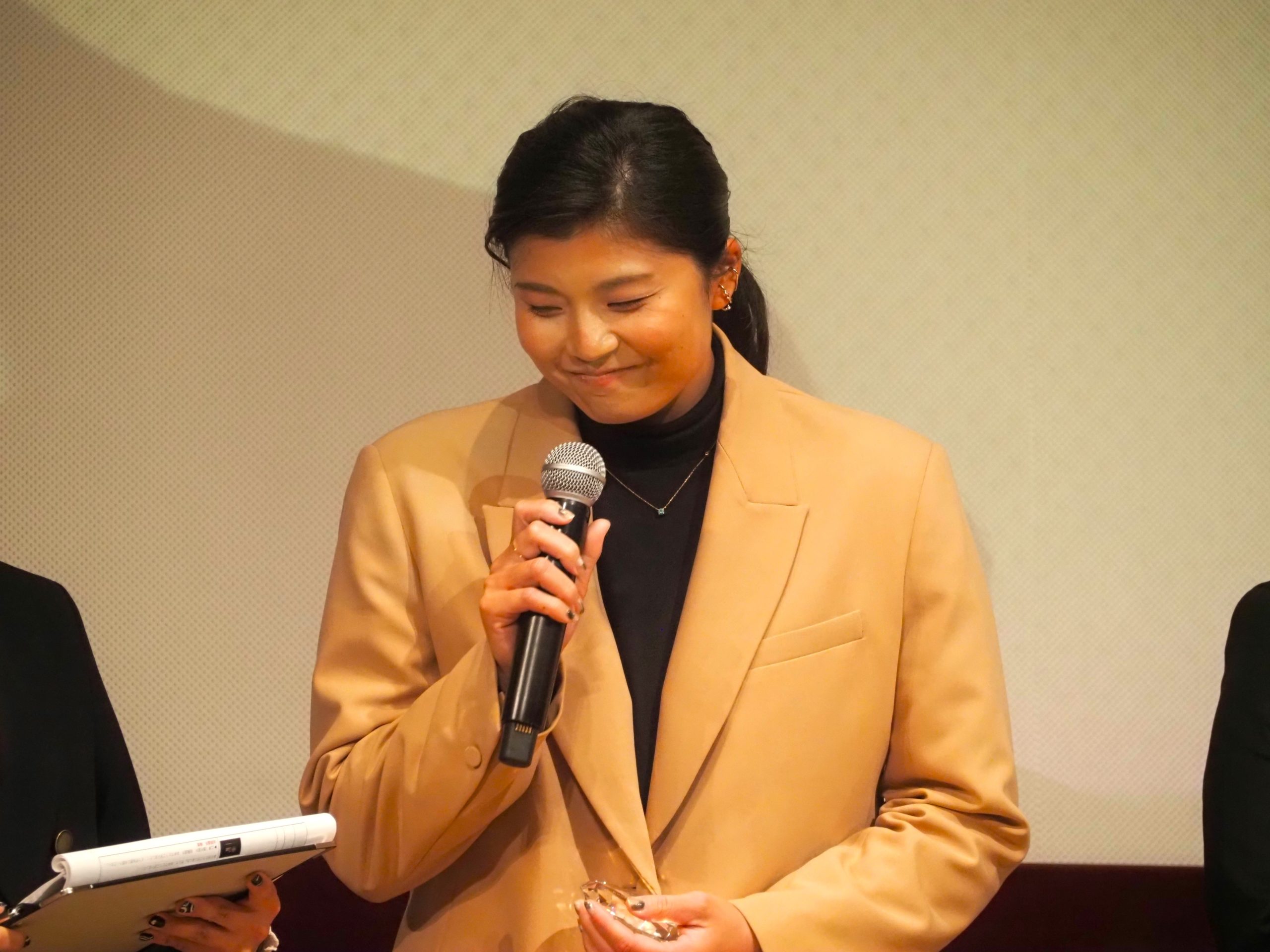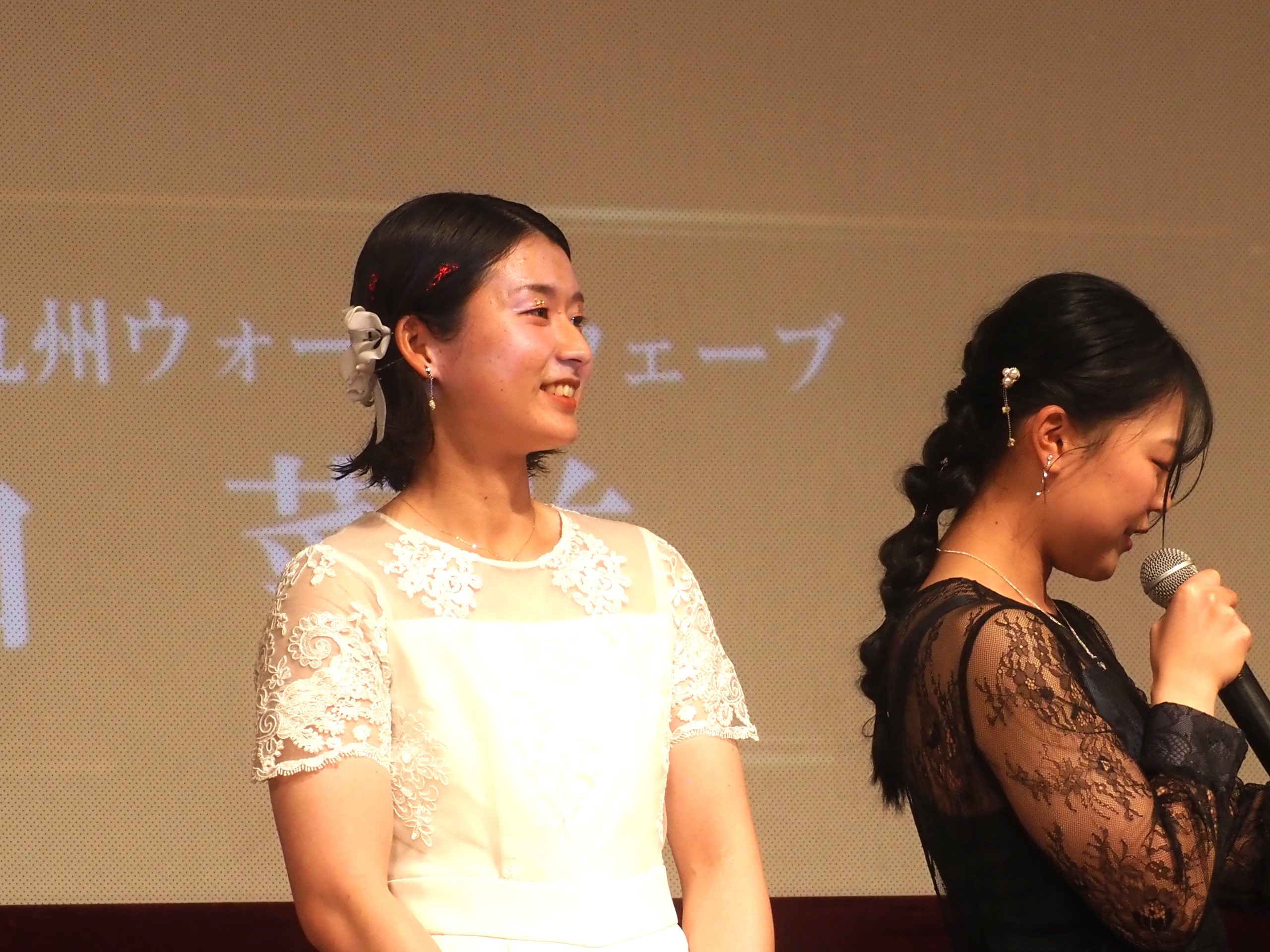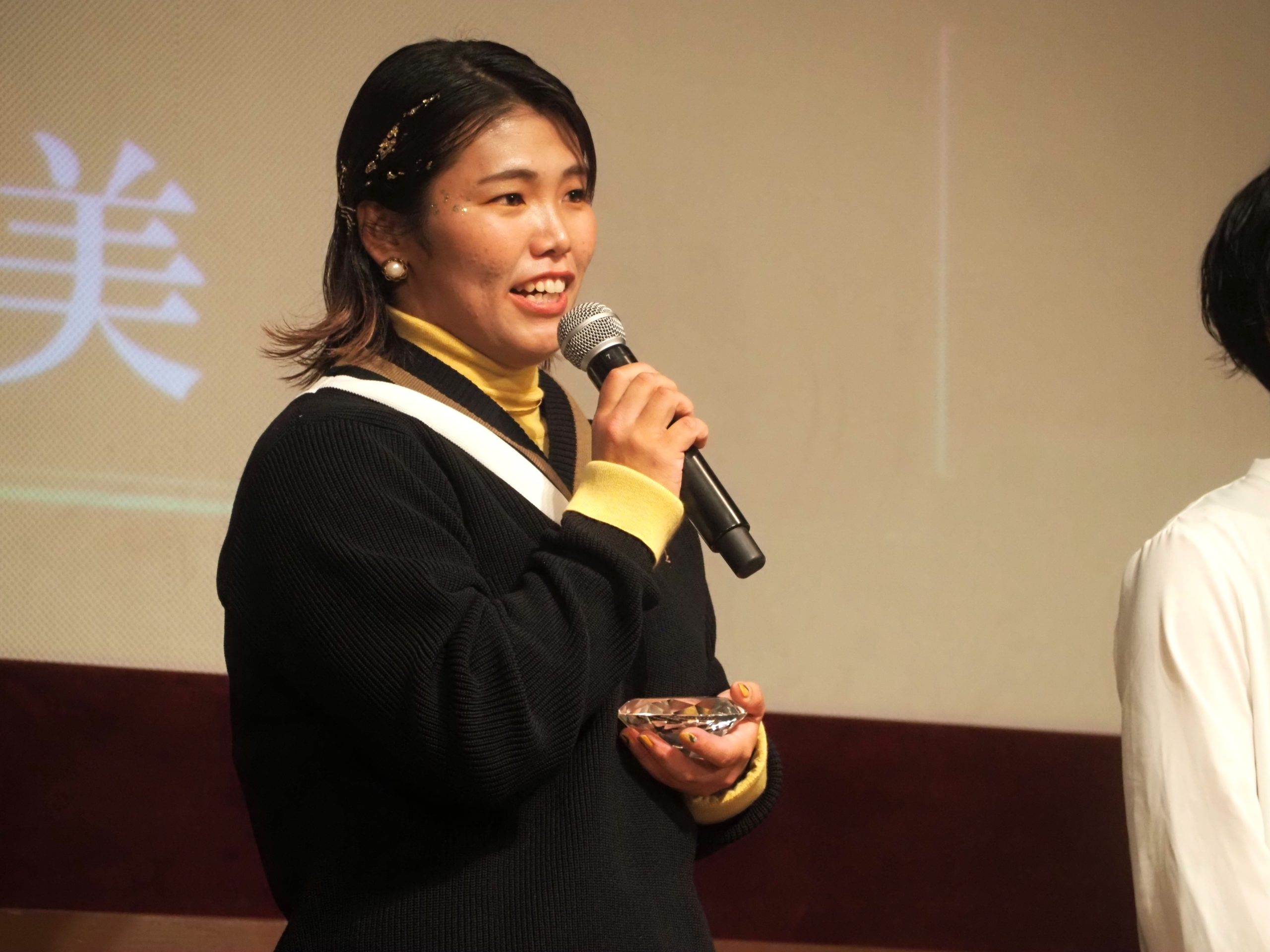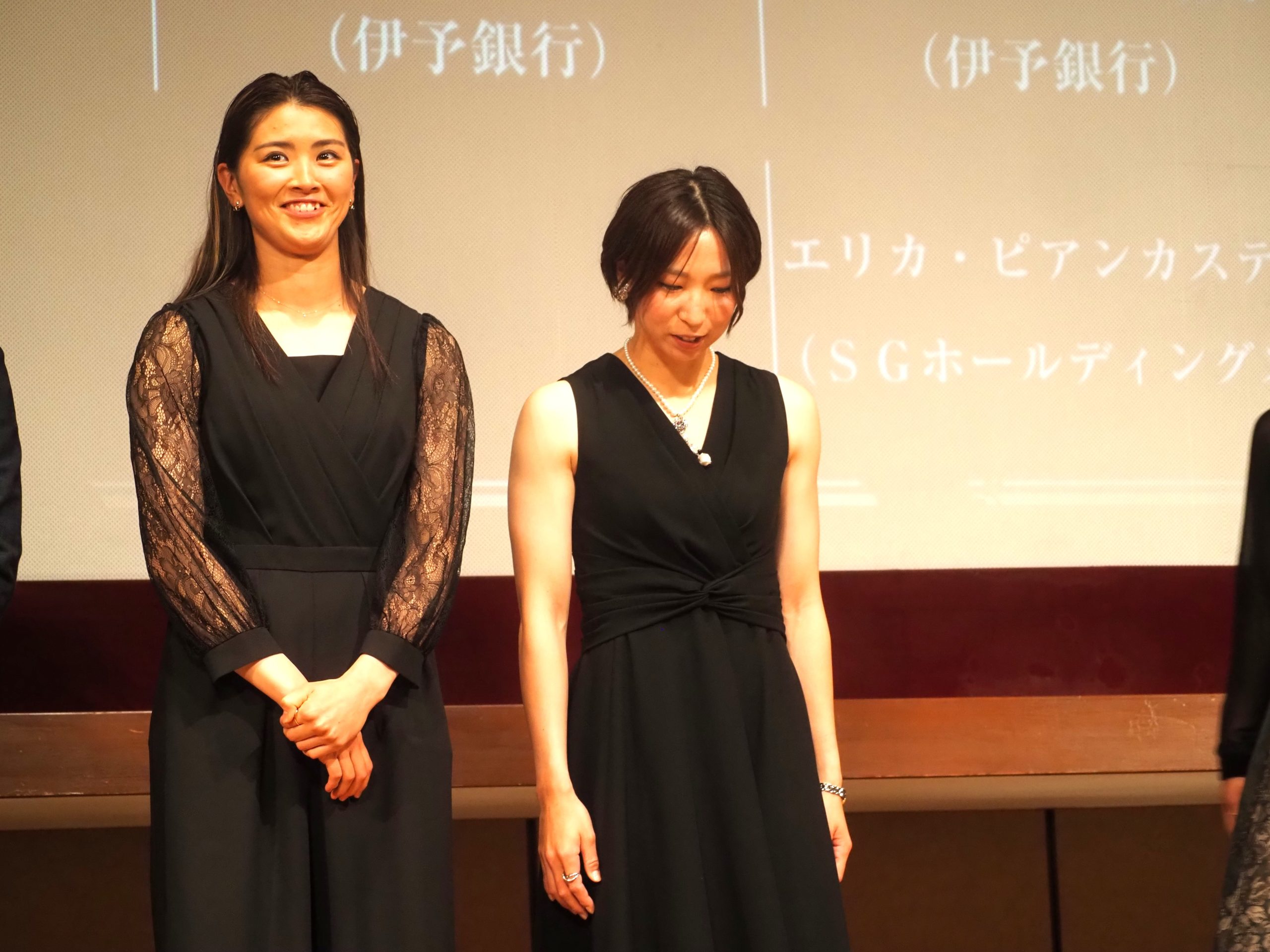杉浦選手は、12盗塁、松瀬選手は15盗塁でした。杉浦選手は高卒2年目、「塁に出たら走る」という村山監督の方針で、走のスペシャリストとしてランナーが出たら代走として出場し、数々の盗塁を決めてチームの勝利に貢献しました。プレゼンターは、今回会場に来られていた杉浦選手のお父様。1組2名で3万円というスペシャルチケットを購入しての参加。しかし実娘の晴れ舞台に並ぶことができプライスレスな価値があったのではないでしょうか?お父様から質問の来年の目標については、「今シーズンの記録を上回り、足を生かして走攻守で活躍したい」と答えました。また、松瀬選手は太陽誘電からの移籍1年目。大学同期の床次マネージャーの支えもあり新チームでも大活躍。「来年は、今年の記録を上回り2年連続盗塁王を獲ることと足を生かして勝利に貢献したい」と話しました。インタビュアーの須藤麻里子選手(大垣ミナモ)は「お二人とも明るいチームの中で、気づいたらセカンドベースにいる。来年も足を生かしたプレーを魅せていただけることでしょう」とコメントしました。