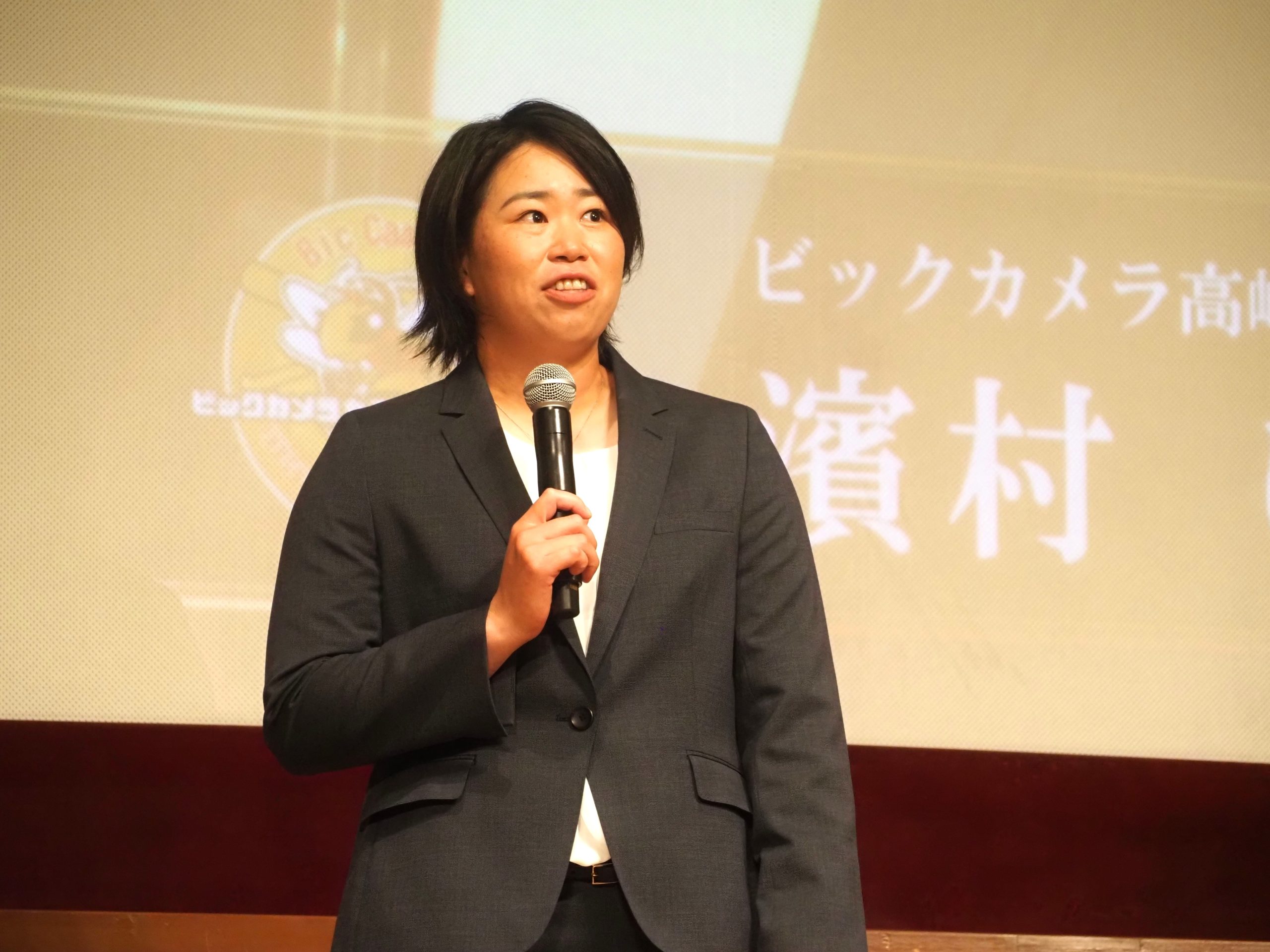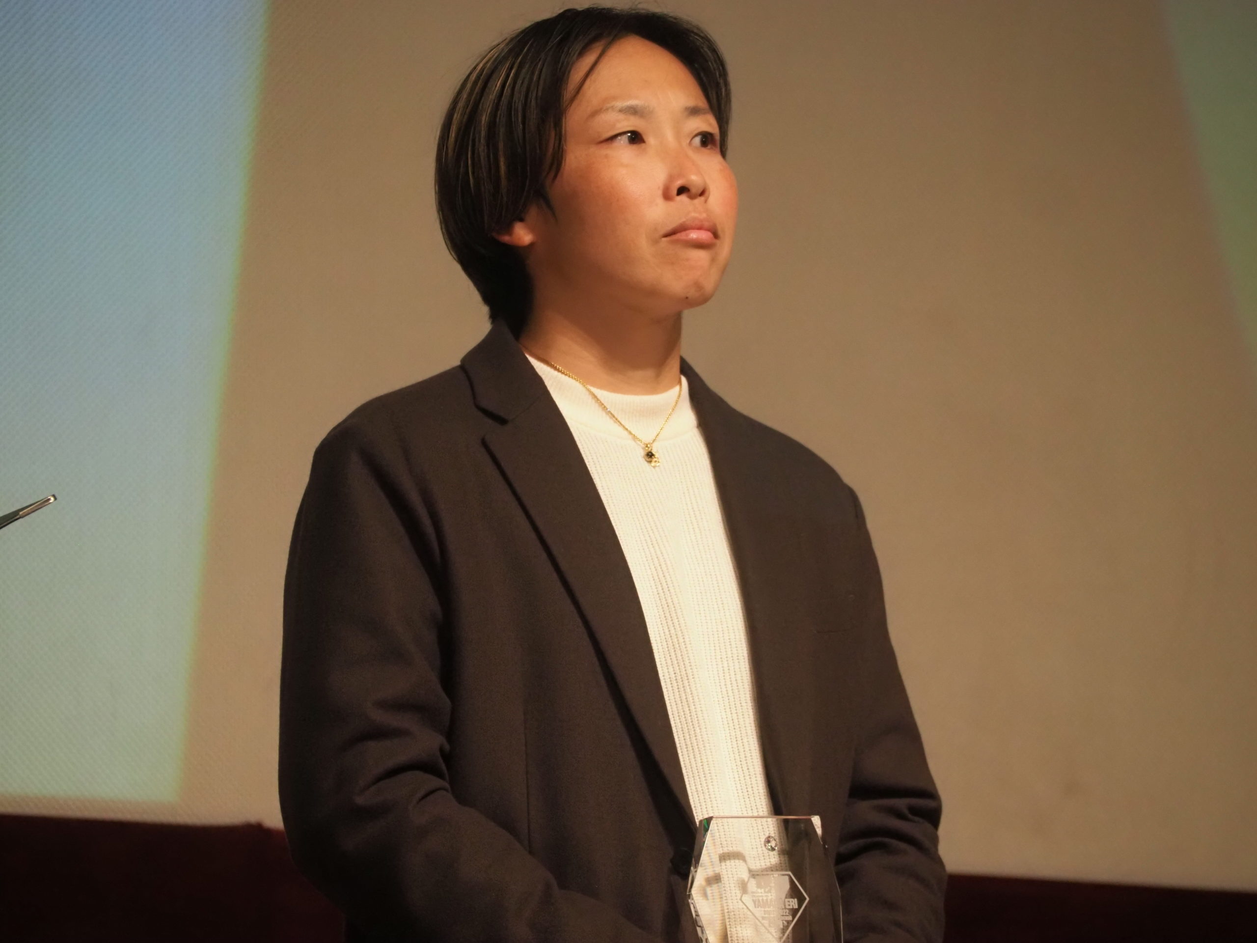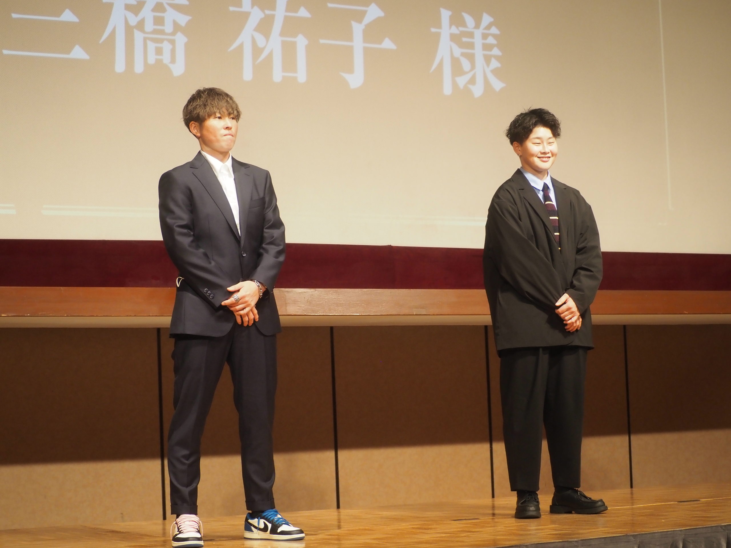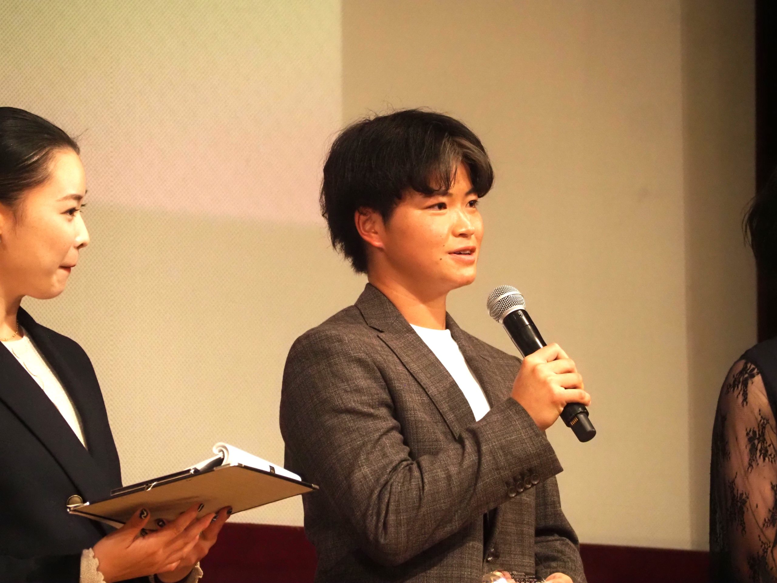 杉浦選手は、12盗塁、松瀬選手は15盗塁でした。杉浦選手は高卒2年目、「塁に出たら走る」という村山監督の方針で、走のスペシャリストとしてランナーが出たら代走として出場し、数々の盗塁を決めてチームの勝利に貢献しました。プレゼンターは、今回会場に来られていた杉浦選手のお父様。1組2名で3万円というスペシャルチケットを購入しての参加。しかし実娘の晴れ舞台に並ぶことができプライスレスな価値があったのではないでしょうか?お父様から質問の来年の目標については、「今シーズンの記録を上回り、足を生かして走攻守で活躍したい」と答えました。また、松瀬選手は太陽誘電からの移籍1年目。大学同期の床次マネージャーの支えもあり新チームでも大活躍。「来年は、今年の記録を上回り2年連続盗塁王を獲ることと足を生かして勝利に貢献したい」と話しました。インタビュアーの須藤麻里子選手(大垣ミナモ)は「お二人とも明るいチームの中で、気づいたらセカンドベースにいる。来年も足を生かしたプレーを魅せていただけることでしょう」とコメントしました。