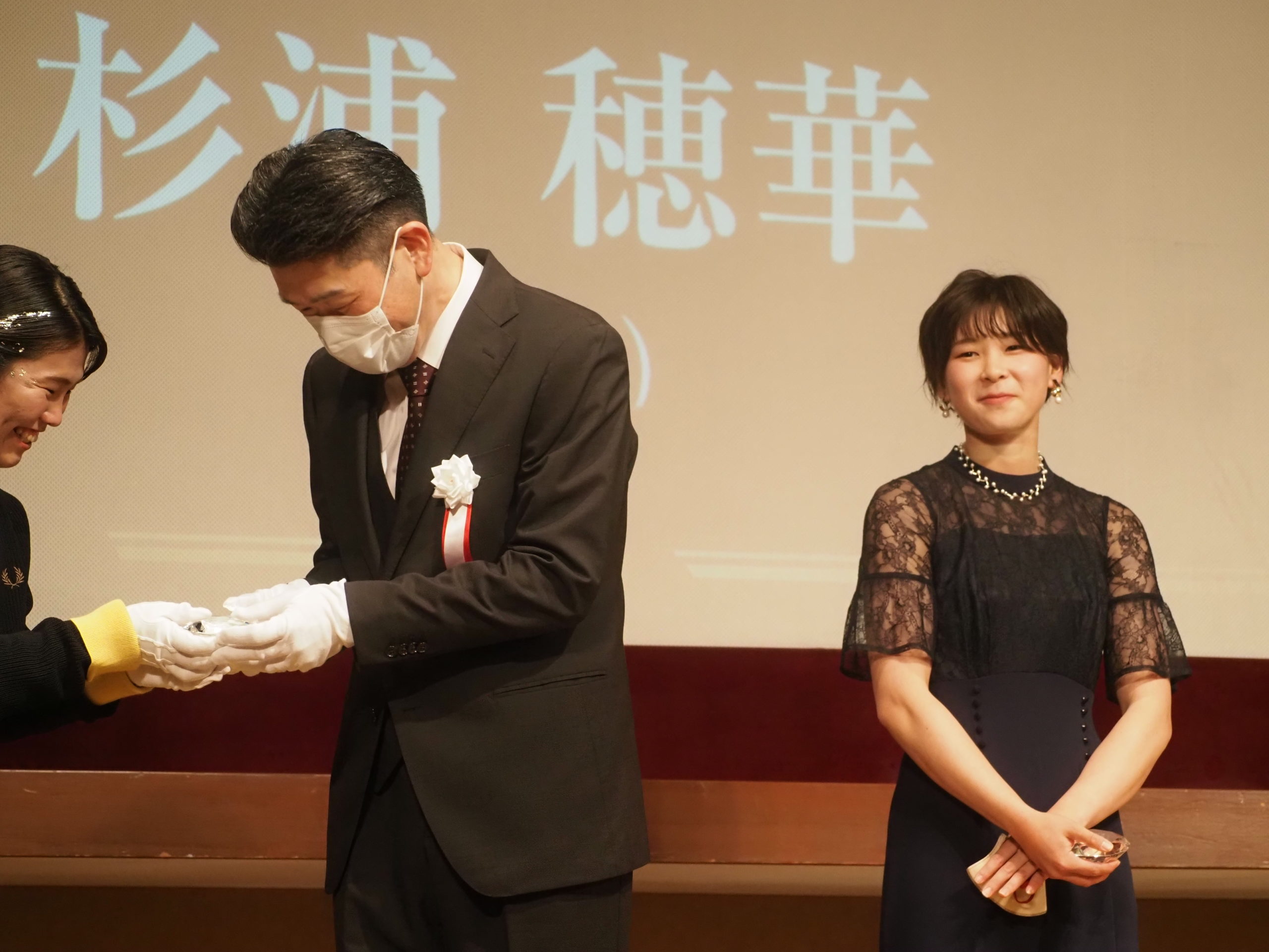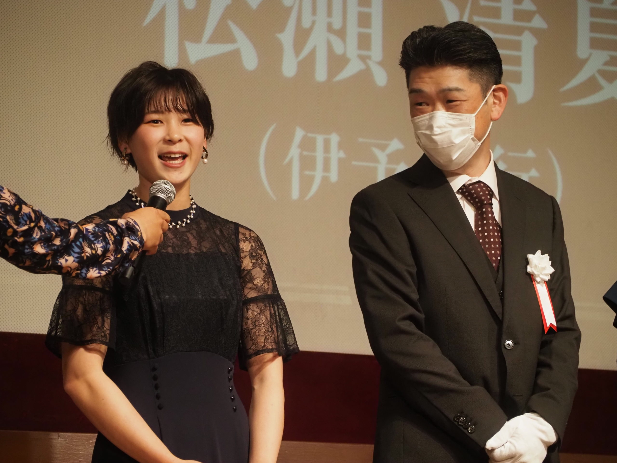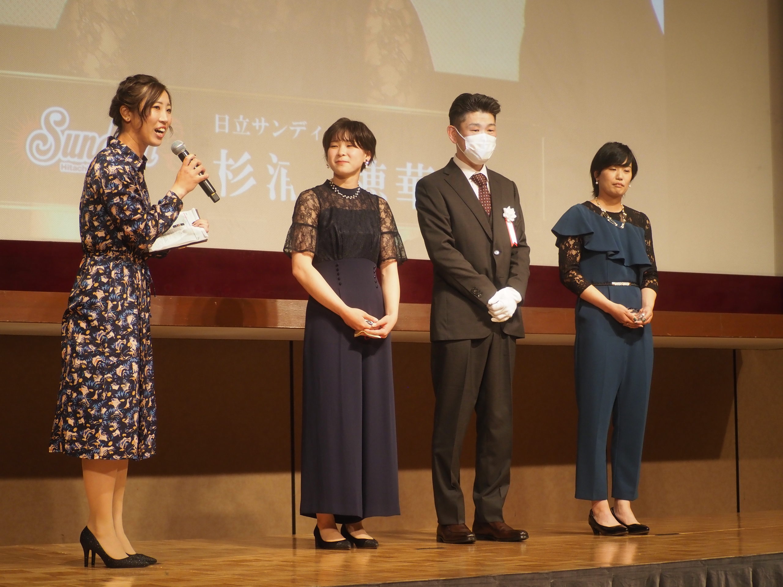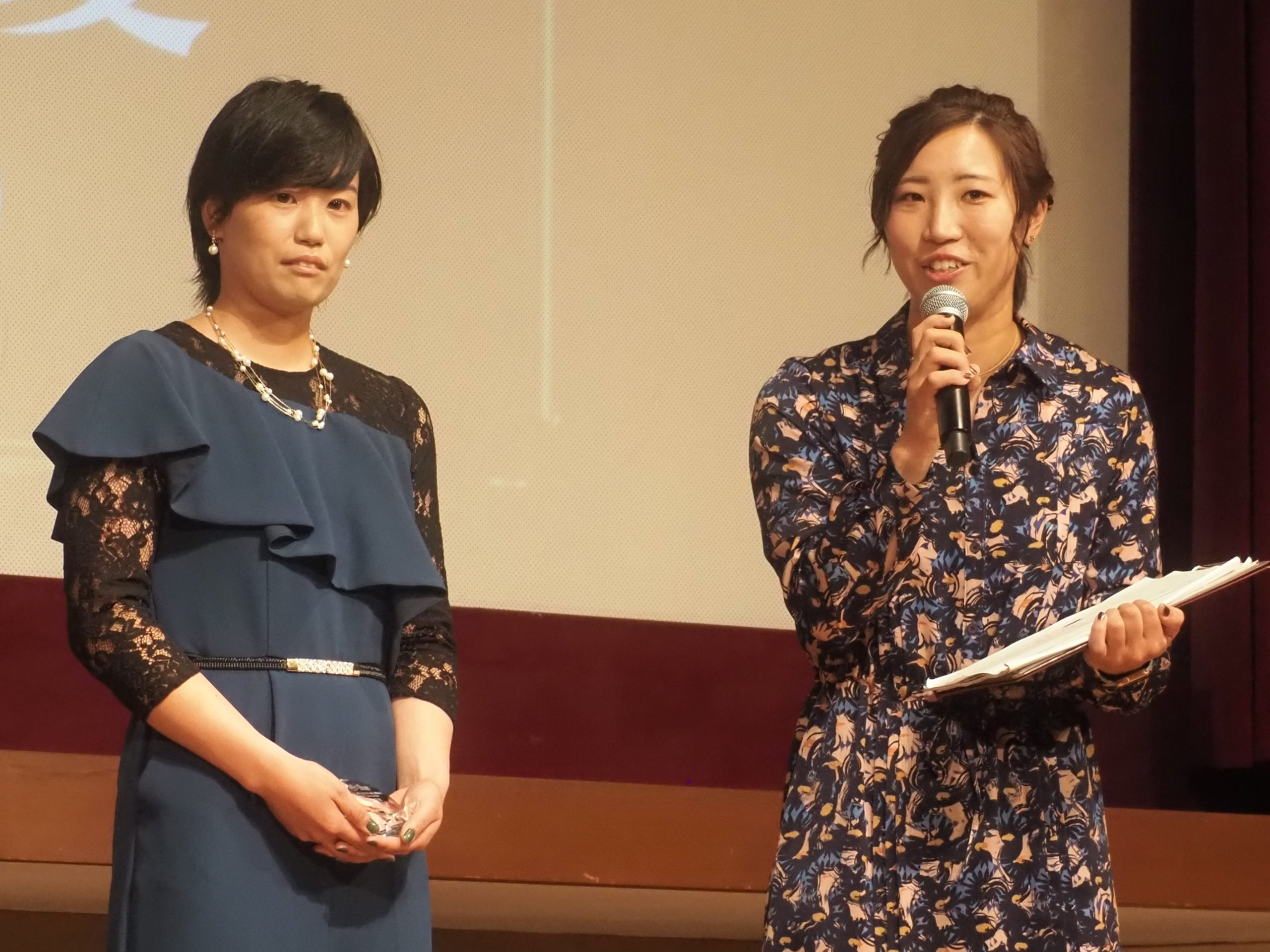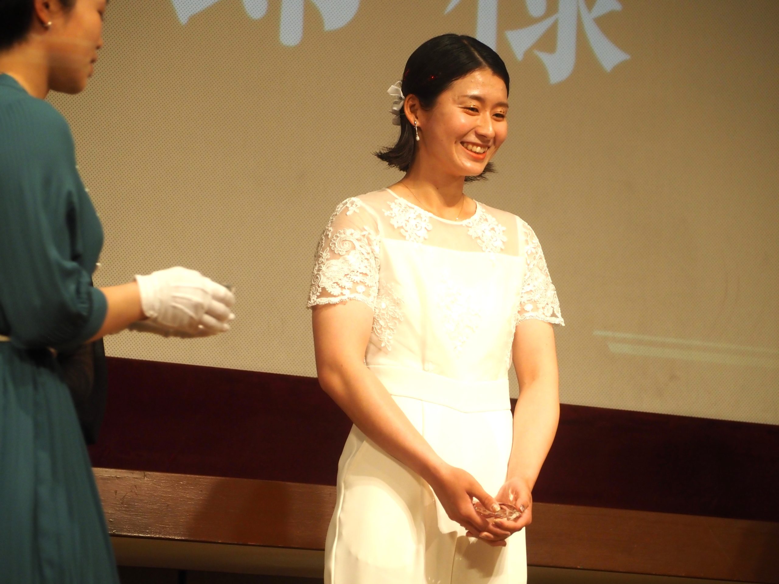 杉浦選手は、12盗塁、松瀬選手は15盗塁でした。杉浦選手は高卒2年目、「塁に出たら走る」という村山監督の方針で、走のスペシャリストとしてランナーが出たら代走として出場し、数々の盗塁を決めてチームの勝利に貢献しました。プレゼンターは、今回会場に来られていた杉浦選手のお父様。1組2名で3万円というスペシャルチケットを購入しての参加。しかし実娘の晴れ舞台に並ぶことができプライスレスな価値があったのではないでしょうか?お父様から質問の来年の目標については、「今シーズンの記録を上回り、足を生かして走攻守で活躍したい」と答えました。また、松瀬選手は太陽誘電からの移籍1年目。大学同期の床次マネージャーの支えもあり新チームでも大活躍。「来年は、今年の記録を上回り2年連続盗塁王を獲ることと足を生かして勝利に貢献したい」と話しました。インタビュアーの須藤麻里子選手(大垣ミナモ)は「お二人とも明るいチームの中で、気づいたらセカンドベースにいる。来年も足を生かしたプレーを魅せていただけることでしょう」とコメントしました。