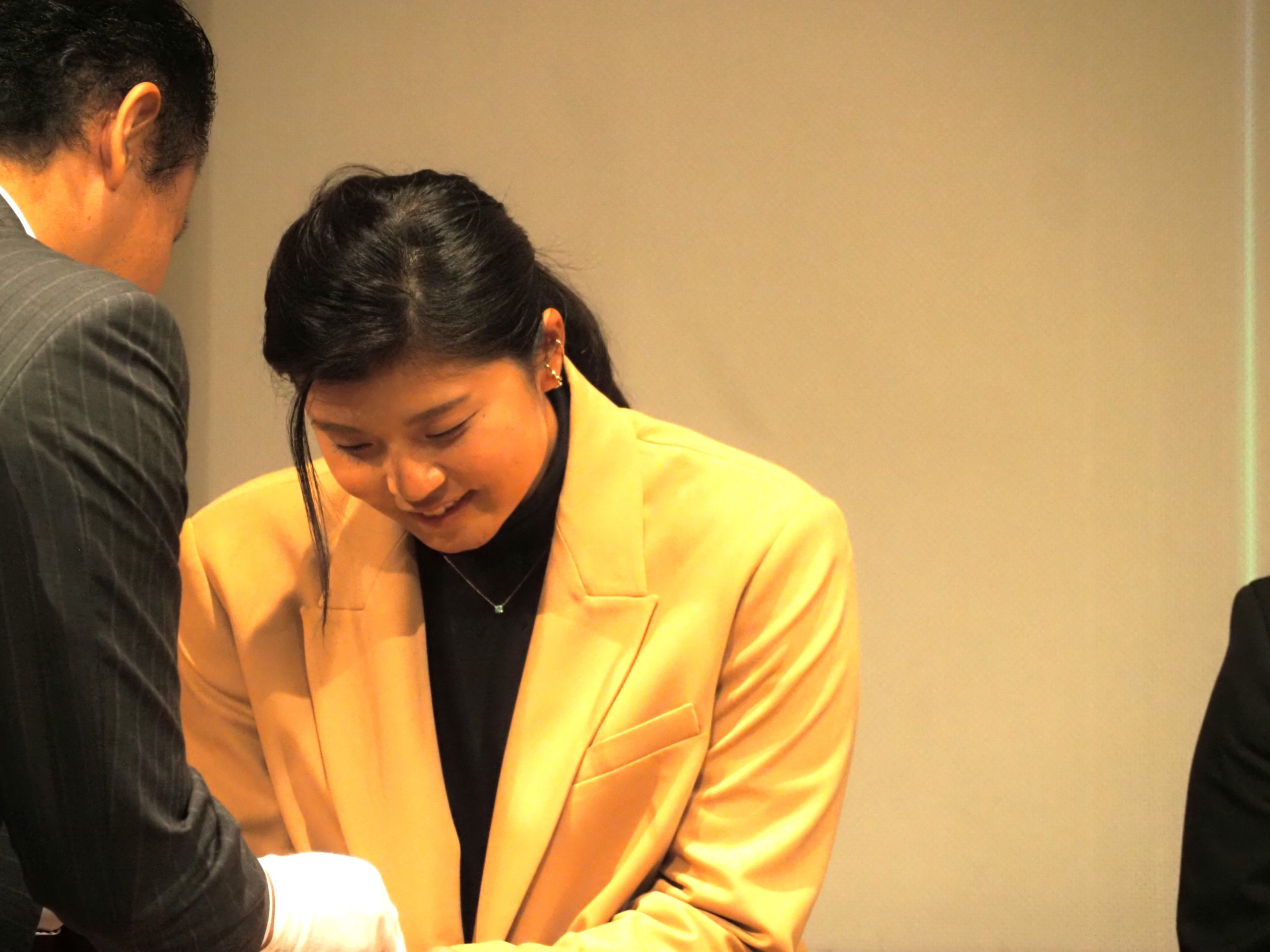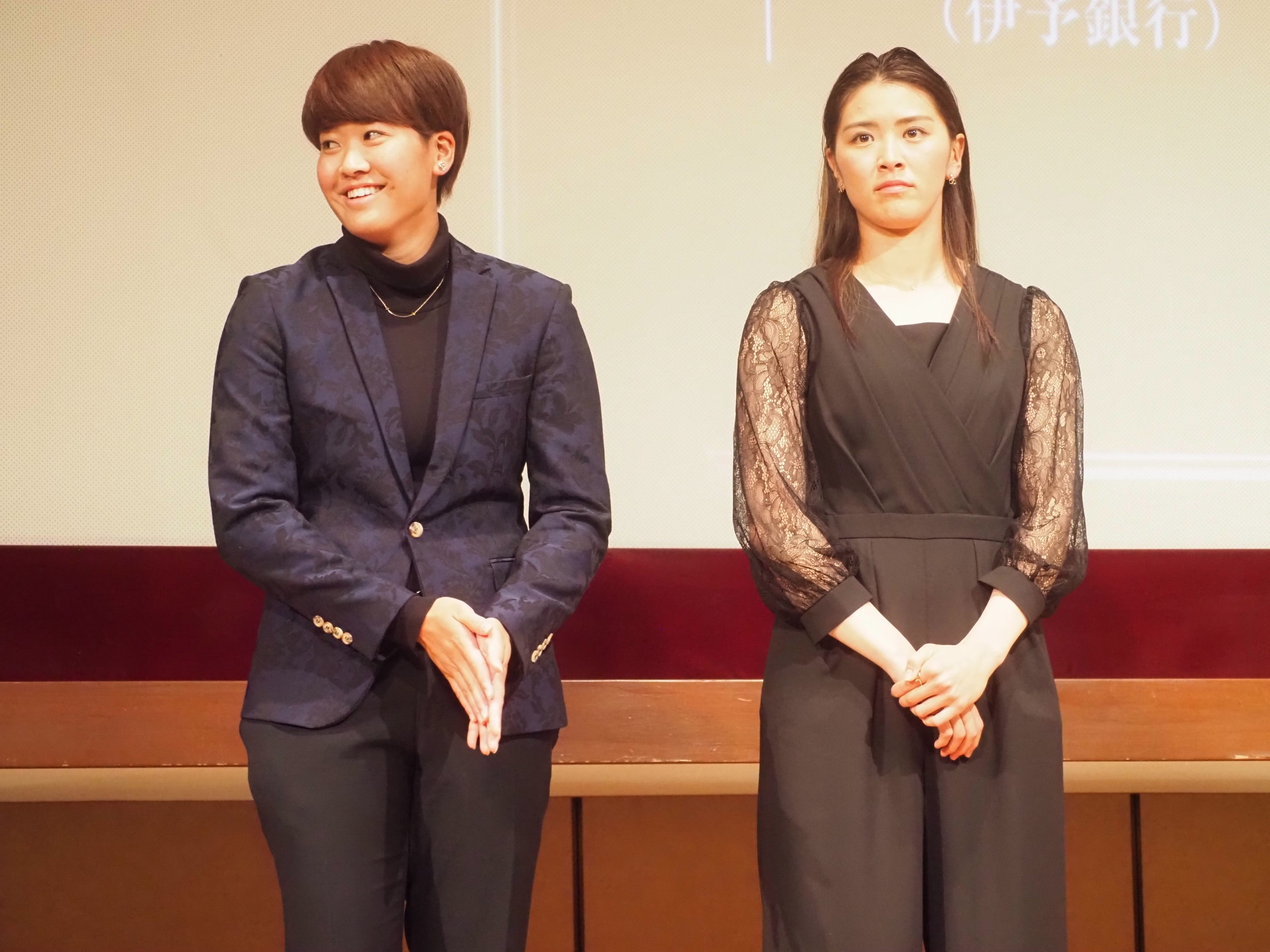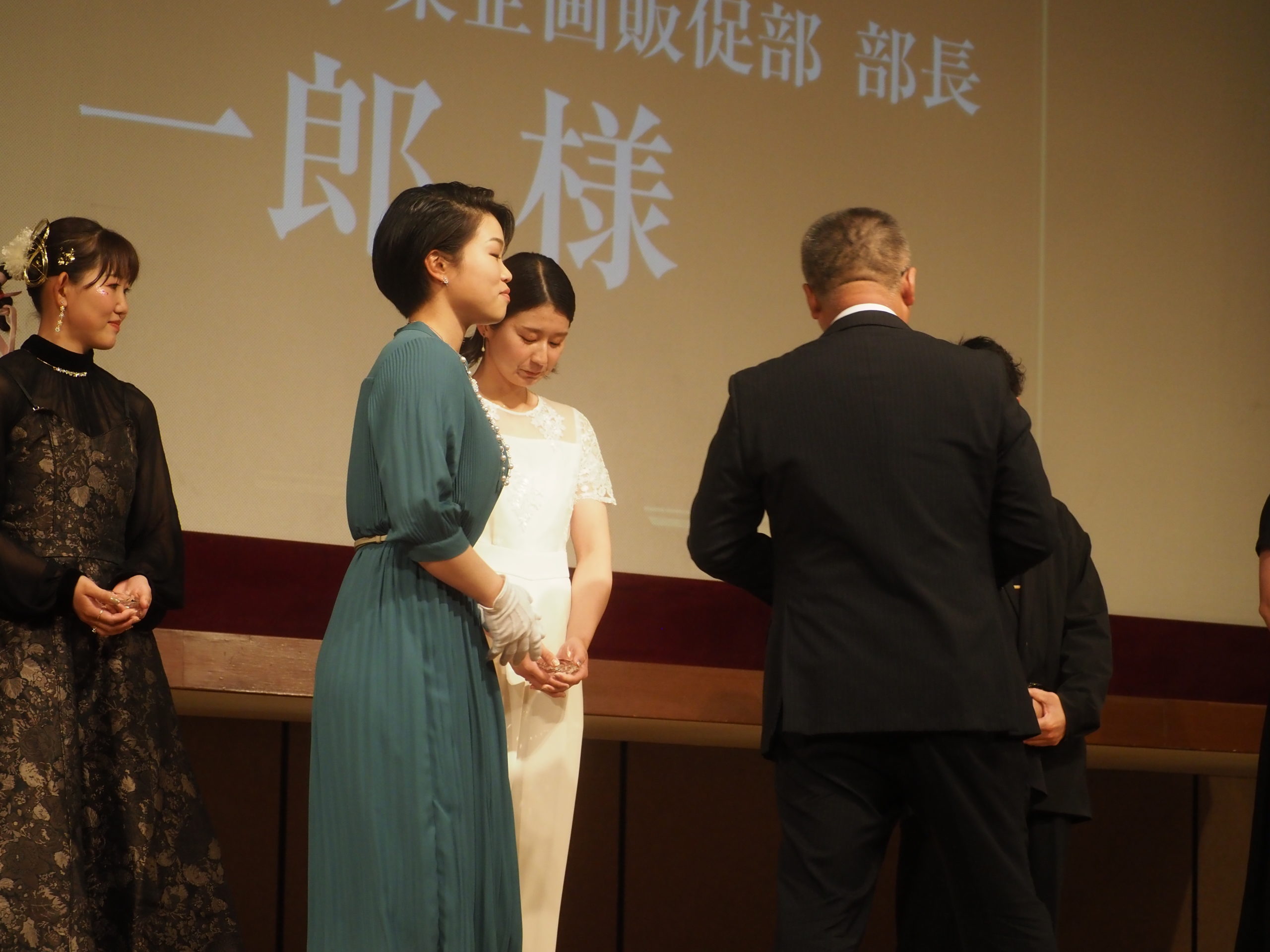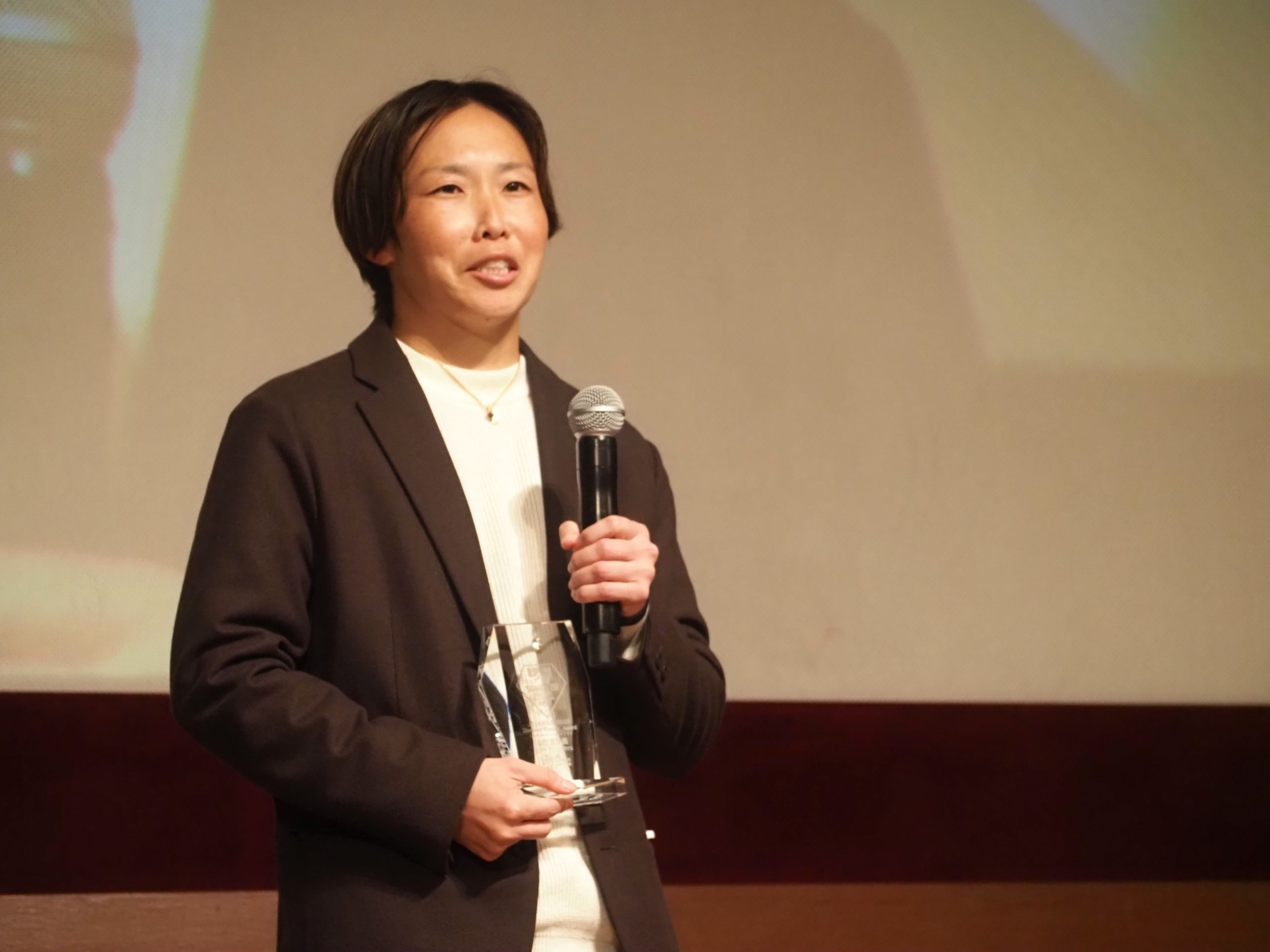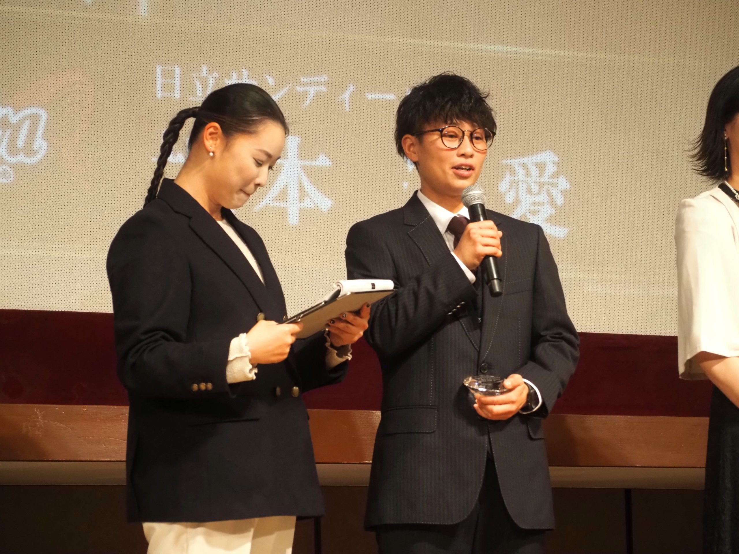 杉浦選手は、12盗塁、松瀬選手は15盗塁でした。杉浦選手は高卒2年目、「塁に出たら走る」という村山監督の方針で、走のスペシャリストとしてランナーが出たら代走として出場し、数々の盗塁を決めてチームの勝利に貢献しました。プレゼンターは、今回会場に来られていた杉浦選手のお父様。1組2名で3万円というスペシャルチケットを購入しての参加。しかし実娘の晴れ舞台に並ぶことができプライスレスな価値があったのではないでしょうか?お父様から質問の来年の目標については、「今シーズンの記録を上回り、足を生かして走攻守で活躍したい」と答えました。また、松瀬選手は太陽誘電からの移籍1年目。大学同期の床次マネージャーの支えもあり新チームでも大活躍。「来年は、今年の記録を上回り2年連続盗塁王を獲ることと足を生かして勝利に貢献したい」と話しました。インタビュアーの須藤麻里子選手(大垣ミナモ)は「お二人とも明るいチームの中で、気づいたらセカンドベースにいる。来年も足を生かしたプレーを魅せていただけることでしょう」とコメントしました。