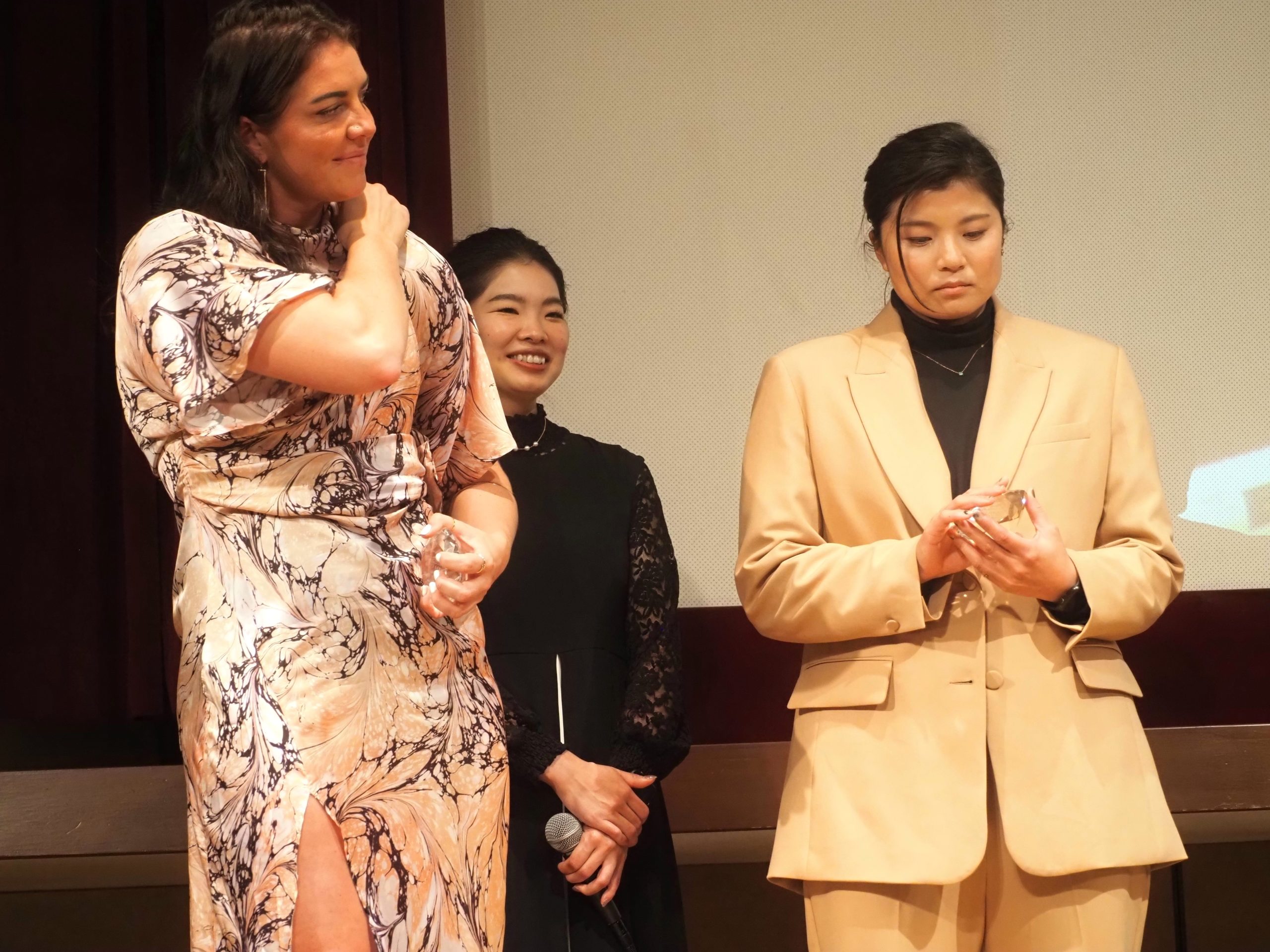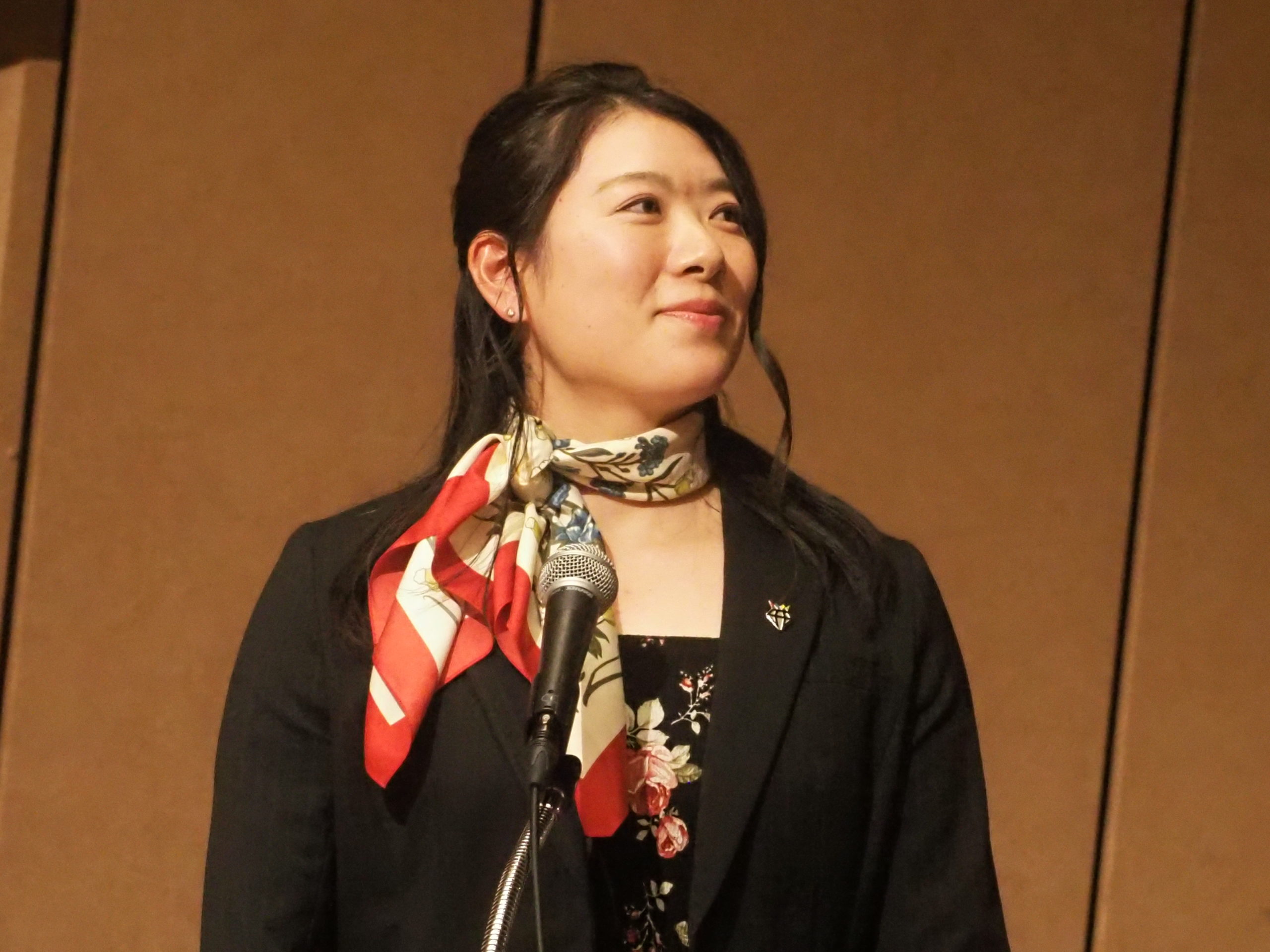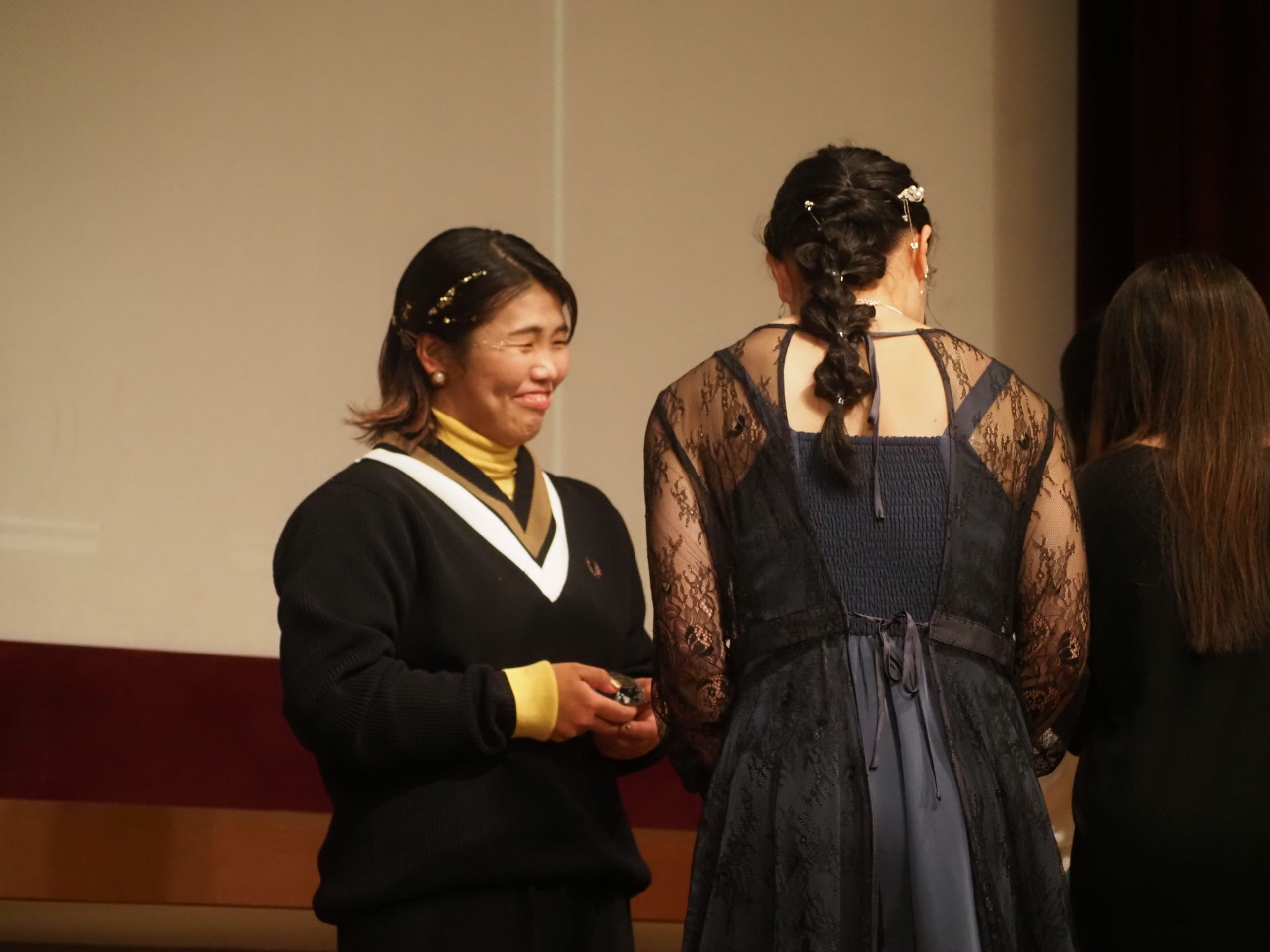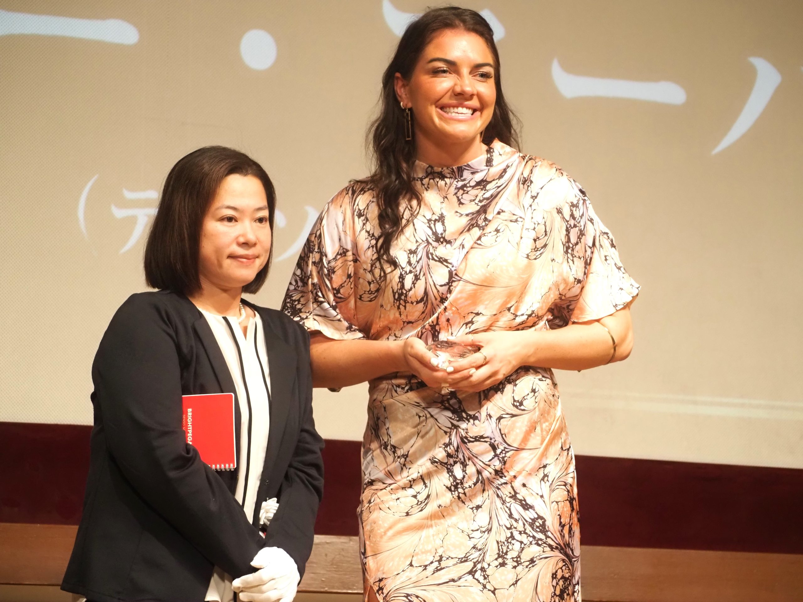 杉浦選手は、12盗塁、松瀬選手は15盗塁でした。杉浦選手は高卒2年目、「塁に出たら走る」という村山監督の方針で、走のスペシャリストとしてランナーが出たら代走として出場し、数々の盗塁を決めてチームの勝利に貢献しました。プレゼンターは、今回会場に来られていた杉浦選手のお父様。1組2名で3万円というスペシャルチケットを購入しての参加。しかし実娘の晴れ舞台に並ぶことができプライスレスな価値があったのではないでしょうか?お父様から質問の来年の目標については、「今シーズンの記録を上回り、足を生かして走攻守で活躍したい」と答えました。また、松瀬選手は太陽誘電からの移籍1年目。大学同期の床次マネージャーの支えもあり新チームでも大活躍。「来年は、今年の記録を上回り2年連続盗塁王を獲ることと足を生かして勝利に貢献したい」と話しました。インタビュアーの須藤麻里子選手(大垣ミナモ)は「お二人とも明るいチームの中で、気づいたらセカンドベースにいる。来年も足を生かしたプレーを魅せていただけることでしょう」とコメントしました。