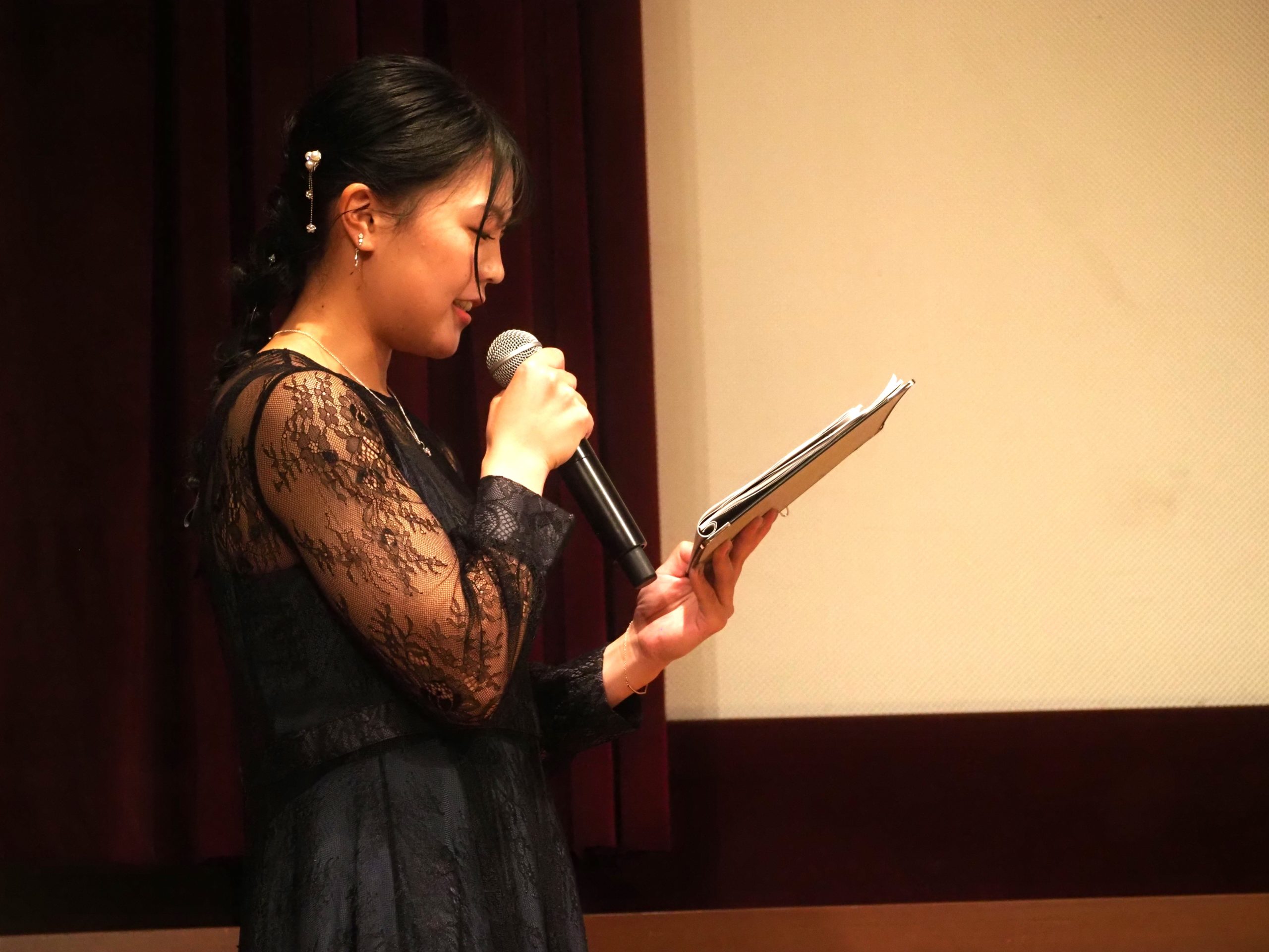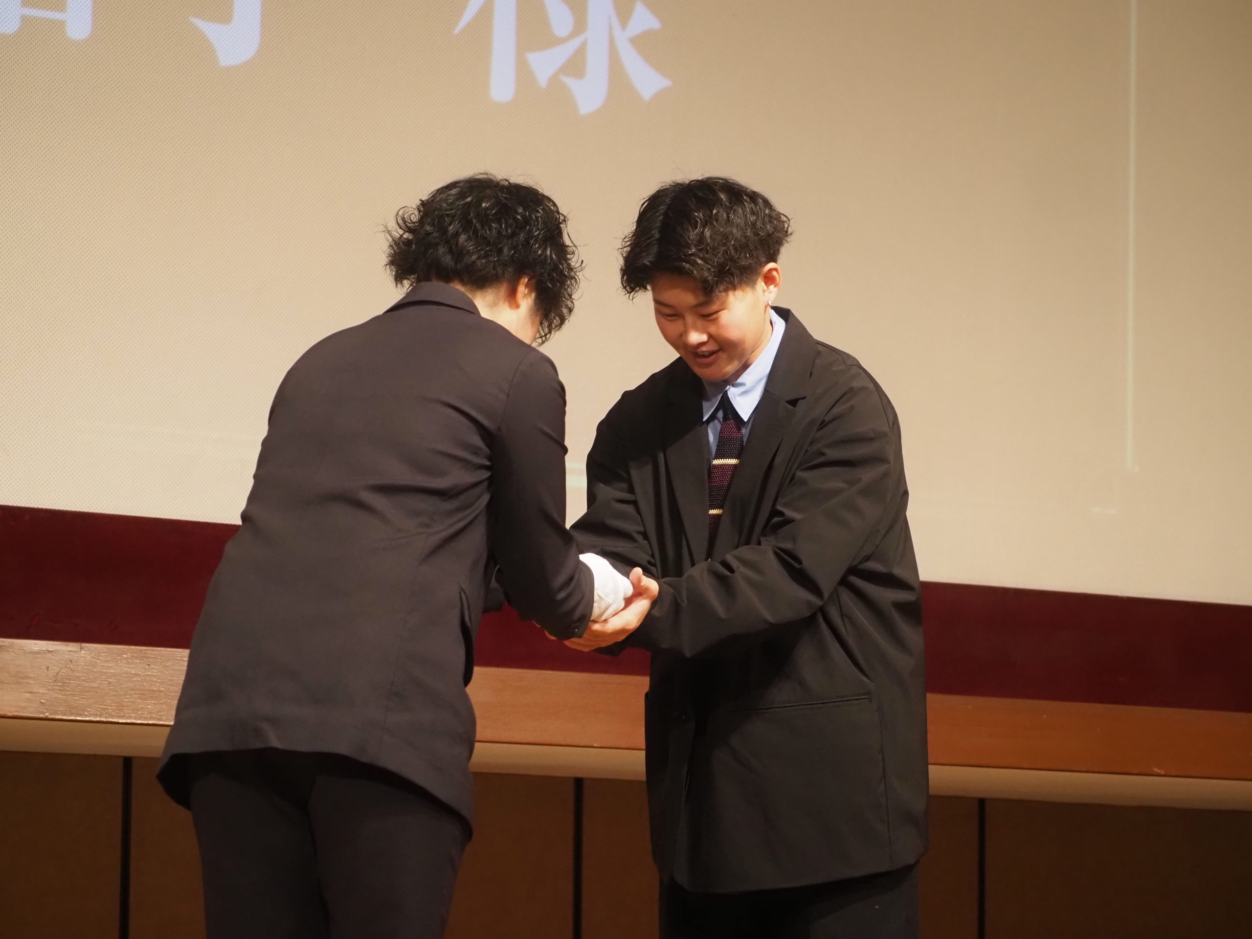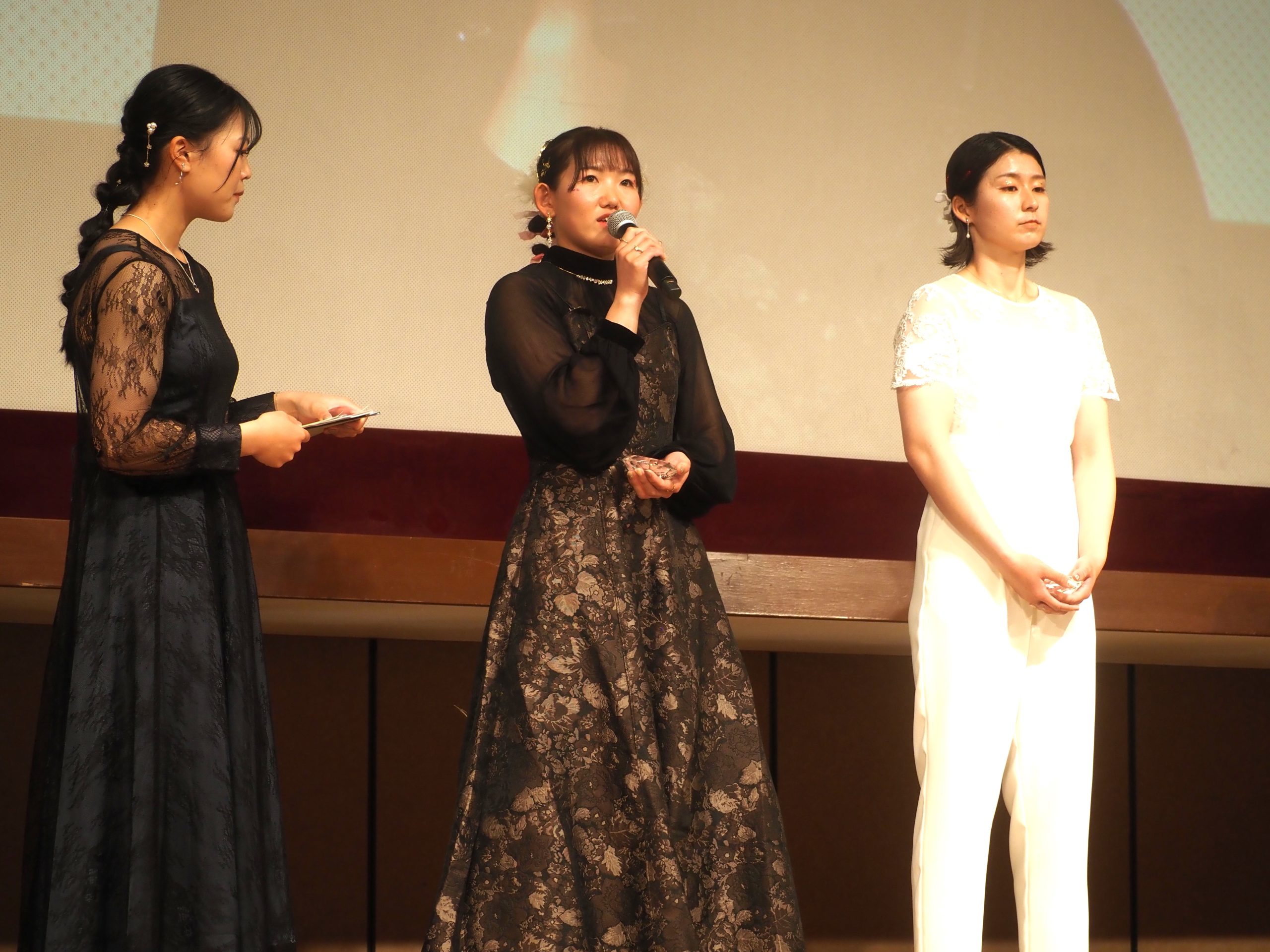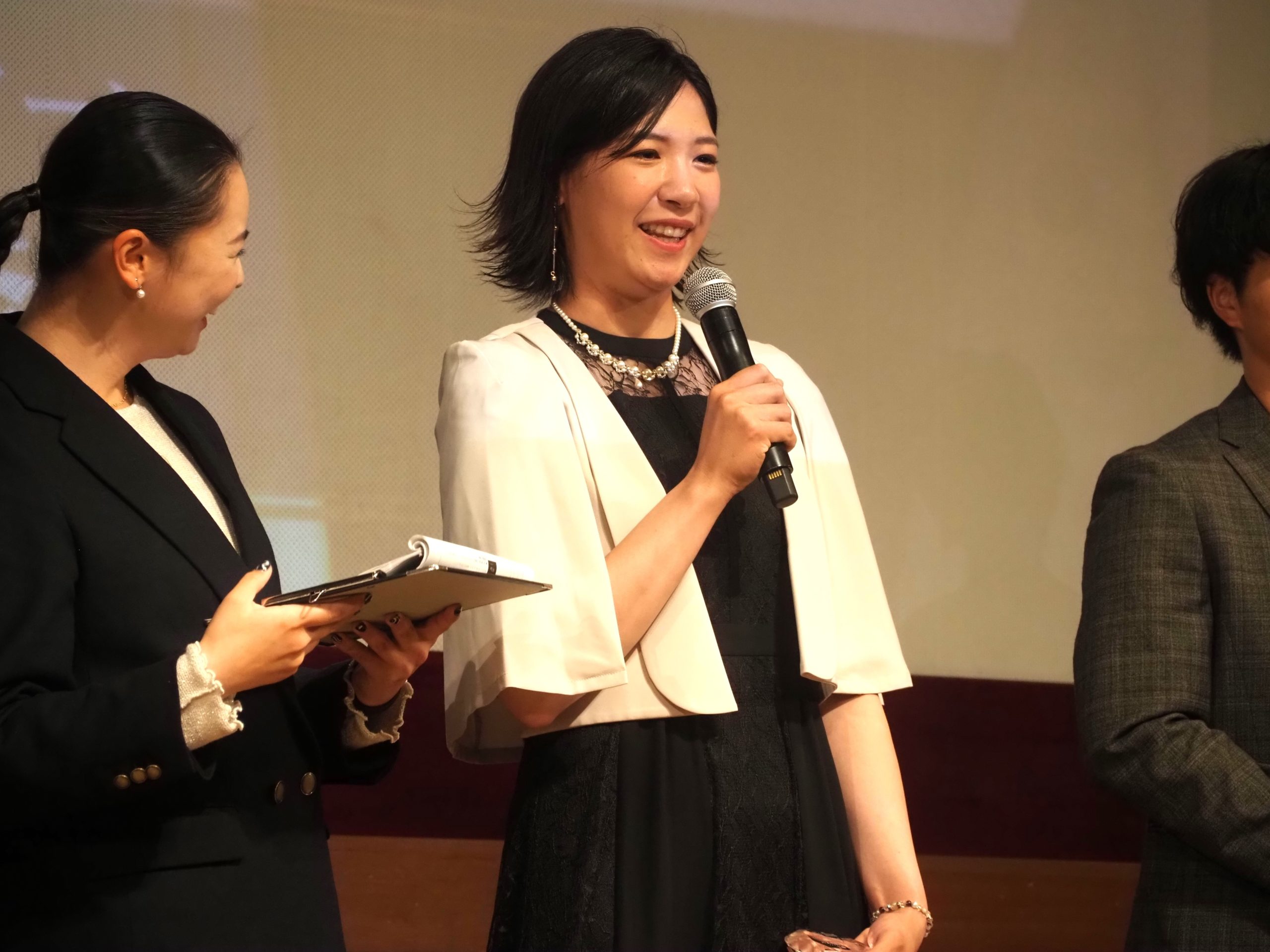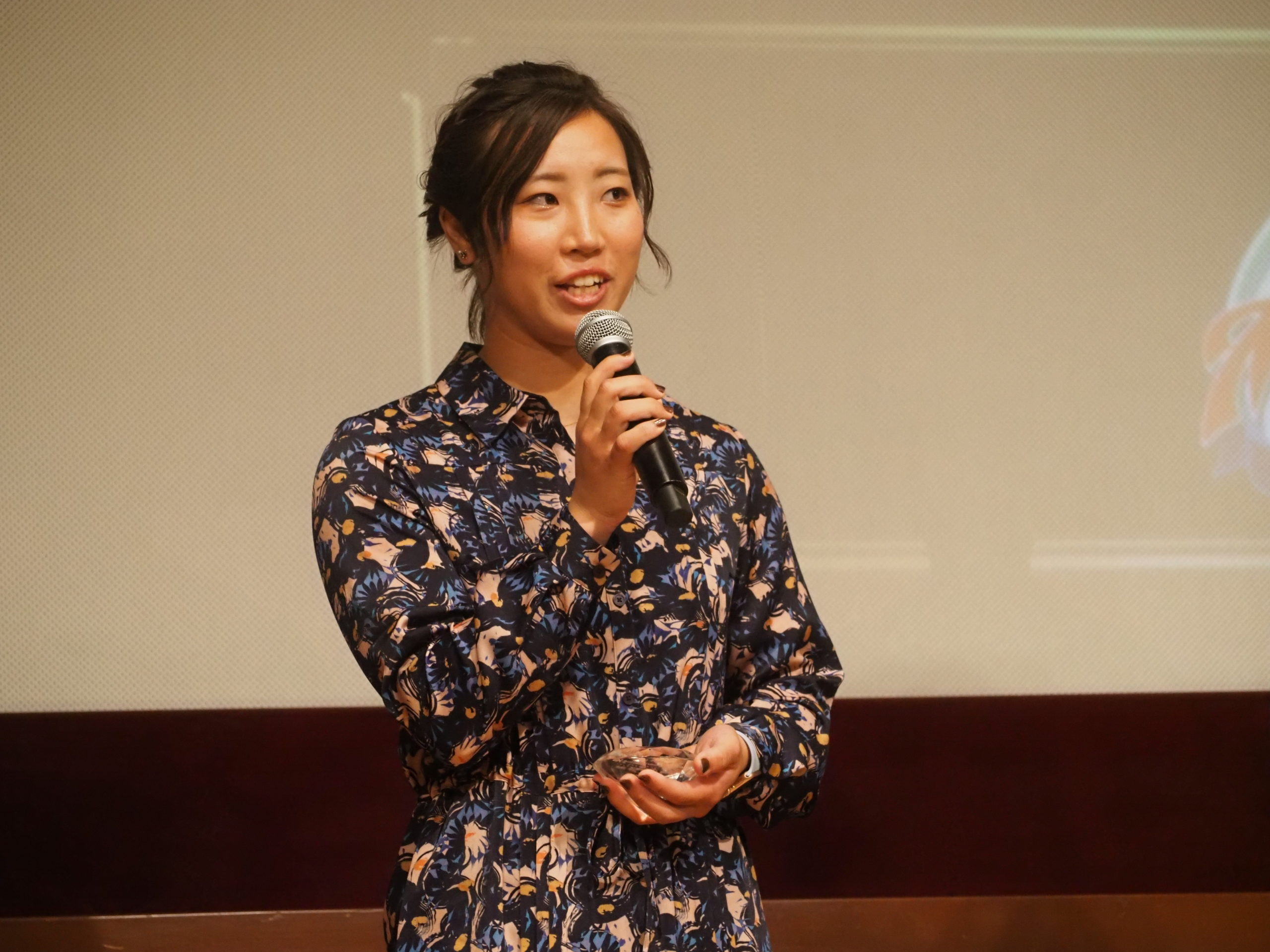 杉浦選手は、12盗塁、松瀬選手は15盗塁でした。杉浦選手は高卒2年目、「塁に出たら走る」という村山監督の方針で、走のスペシャリストとしてランナーが出たら代走として出場し、数々の盗塁を決めてチームの勝利に貢献しました。プレゼンターは、今回会場に来られていた杉浦選手のお父様。1組2名で3万円というスペシャルチケットを購入しての参加。しかし実娘の晴れ舞台に並ぶことができプライスレスな価値があったのではないでしょうか?お父様から質問の来年の目標については、「今シーズンの記録を上回り、足を生かして走攻守で活躍したい」と答えました。また、松瀬選手は太陽誘電からの移籍1年目。大学同期の床次マネージャーの支えもあり新チームでも大活躍。「来年は、今年の記録を上回り2年連続盗塁王を獲ることと足を生かして勝利に貢献したい」と話しました。インタビュアーの須藤麻里子選手(大垣ミナモ)は「お二人とも明るいチームの中で、気づいたらセカンドベースにいる。来年も足を生かしたプレーを魅せていただけることでしょう」とコメントしました。