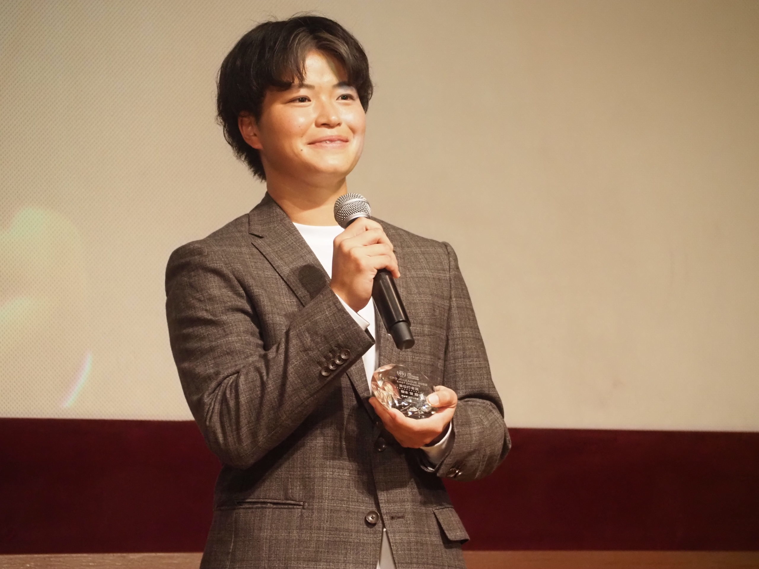 最多打点賞は、東地区はビックカメラ高崎の藤田倭選手(打点33点)、西地区はSGホールディングスのErika Piancastelli選手とタカギ北九州の樋口菜美選手(打点26点)でした。エリカ・ピアンカステリ選手はイタリア代表で東京オリンピックにも出場している選手です。日本でのプレーは1年目のシーズンでした。今回は既に帰国しておりアワードは欠席でした。プレゼンターは、JDリーグ表彰委員でもあるベースボールマガジン社の三橋祐子氏。いつも隣で写真を撮っている方がプレゼンターとして舞台に上がり個人的にとても驚きました。インタビュアーは坂本実桜選手。「打席の中で考えていることとシーズンを通しての感想は?」の質問に対し、藤田選手は「打席の中では頭をシンプルにし迷いなくスイングすることを心掛けている。今シーズンを終えて、チームが優勝し、自分も個人賞が獲れてうれしく思う。」と答えました。また樋口選手には「バッティングの秘訣とルーティン」について質問し、「センター返しを意識している。ルーティンは朝ランニング、素振り、お風呂に入ること。」と答えていました。最後にピッチャーの坂本選手は「2人とも素晴らしいバッターなので投げていてとても怖いと思っていた。」と話しました。