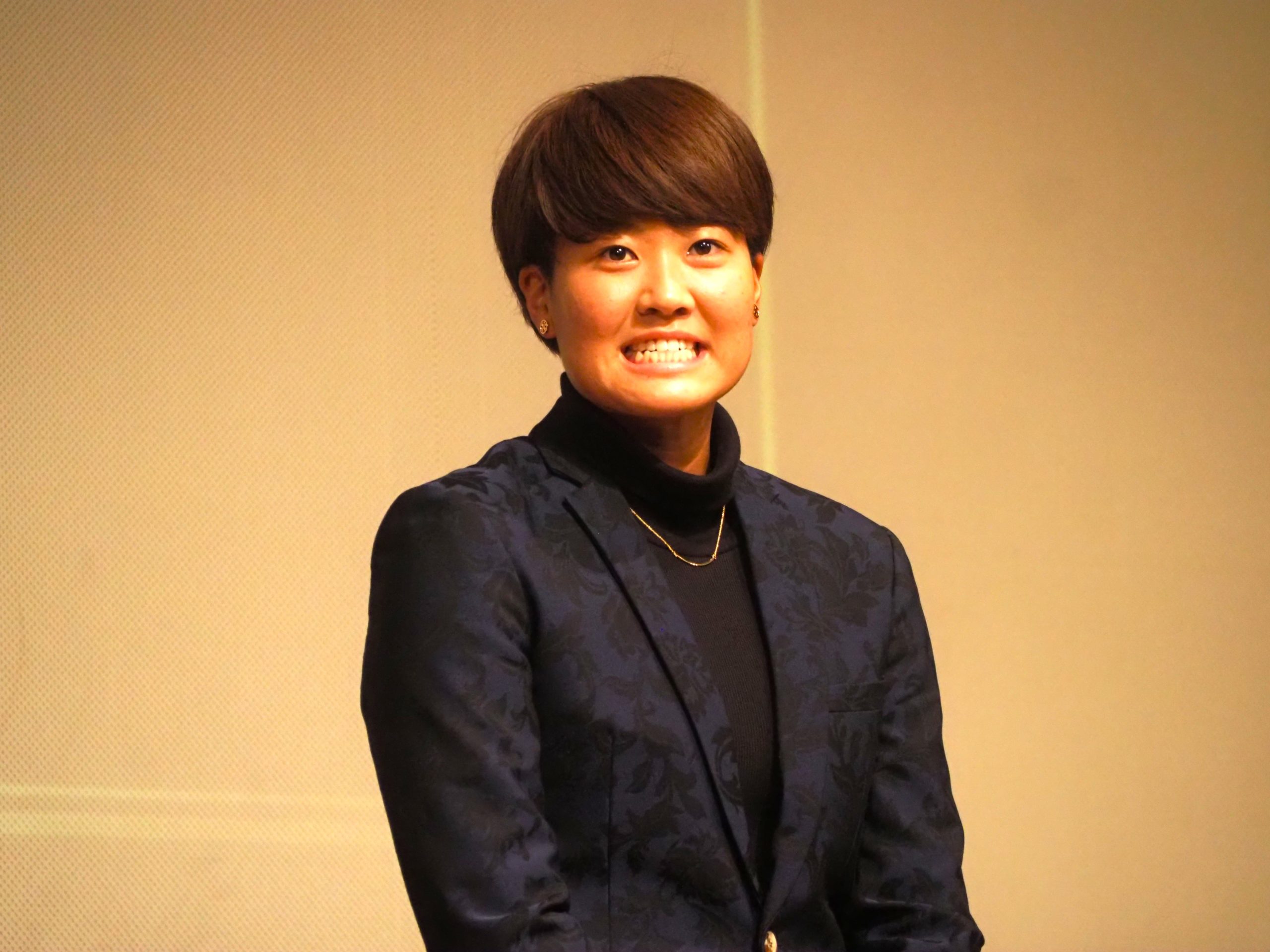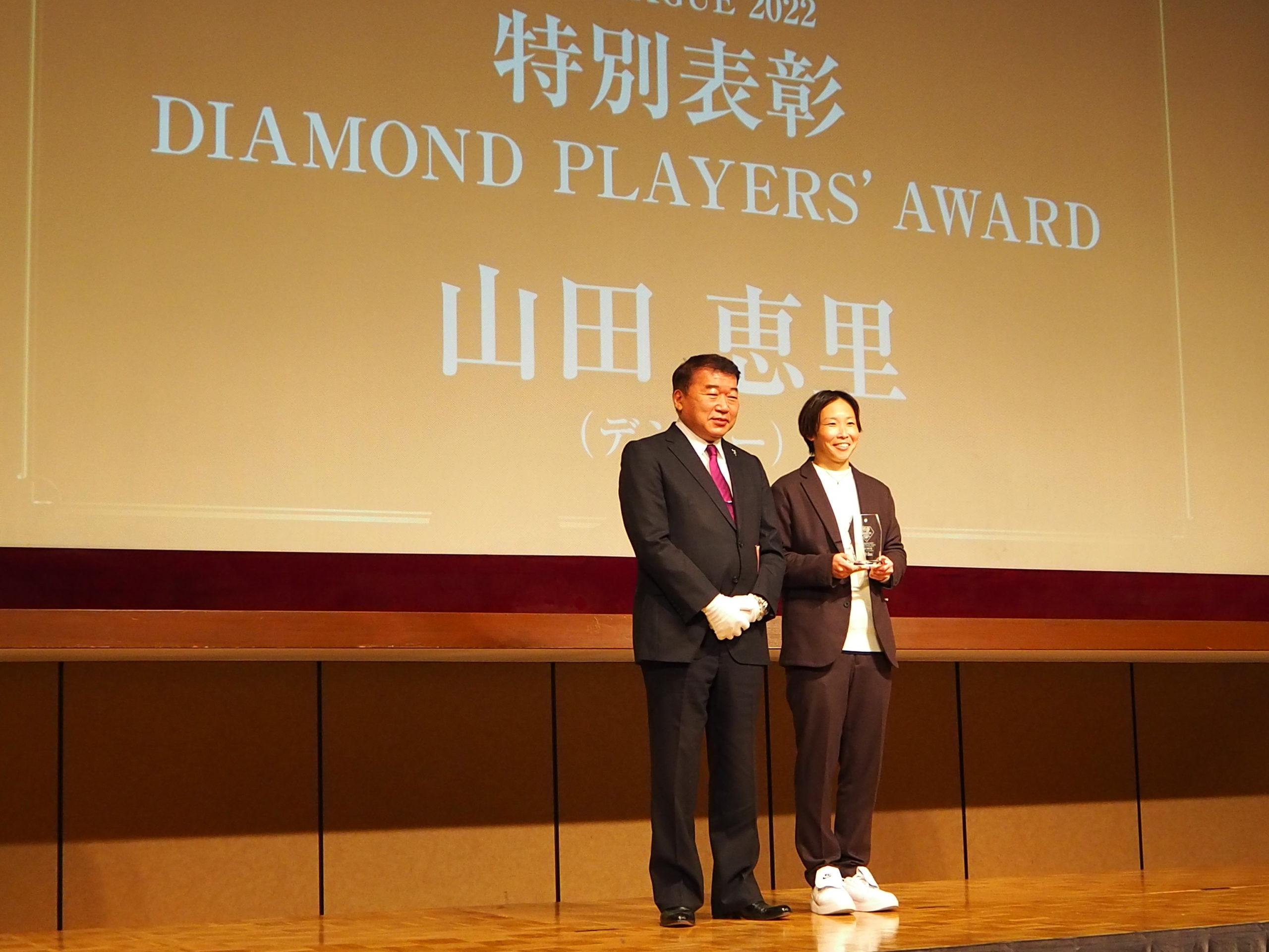 山田恵里選手は2002年より日本リーグでプレーし、首位打者賞5回、本塁打王1回、打点王1回、全1502打席461安打をマーク、通算打率3.73という素晴らしい記録を残しました。通算21年間プレーし今シーズンをもって現役引退を発表しました。プレゼンターはJDリーグ島田利正チェアマン。インタビュアーは坂本実桜選手。