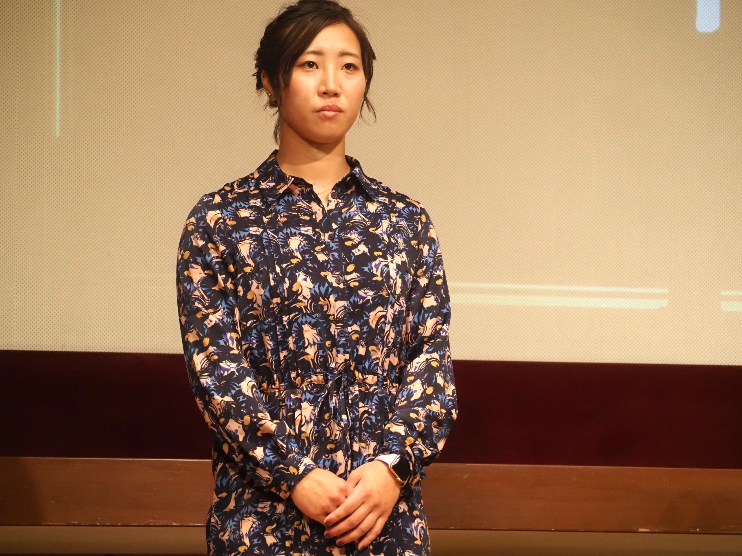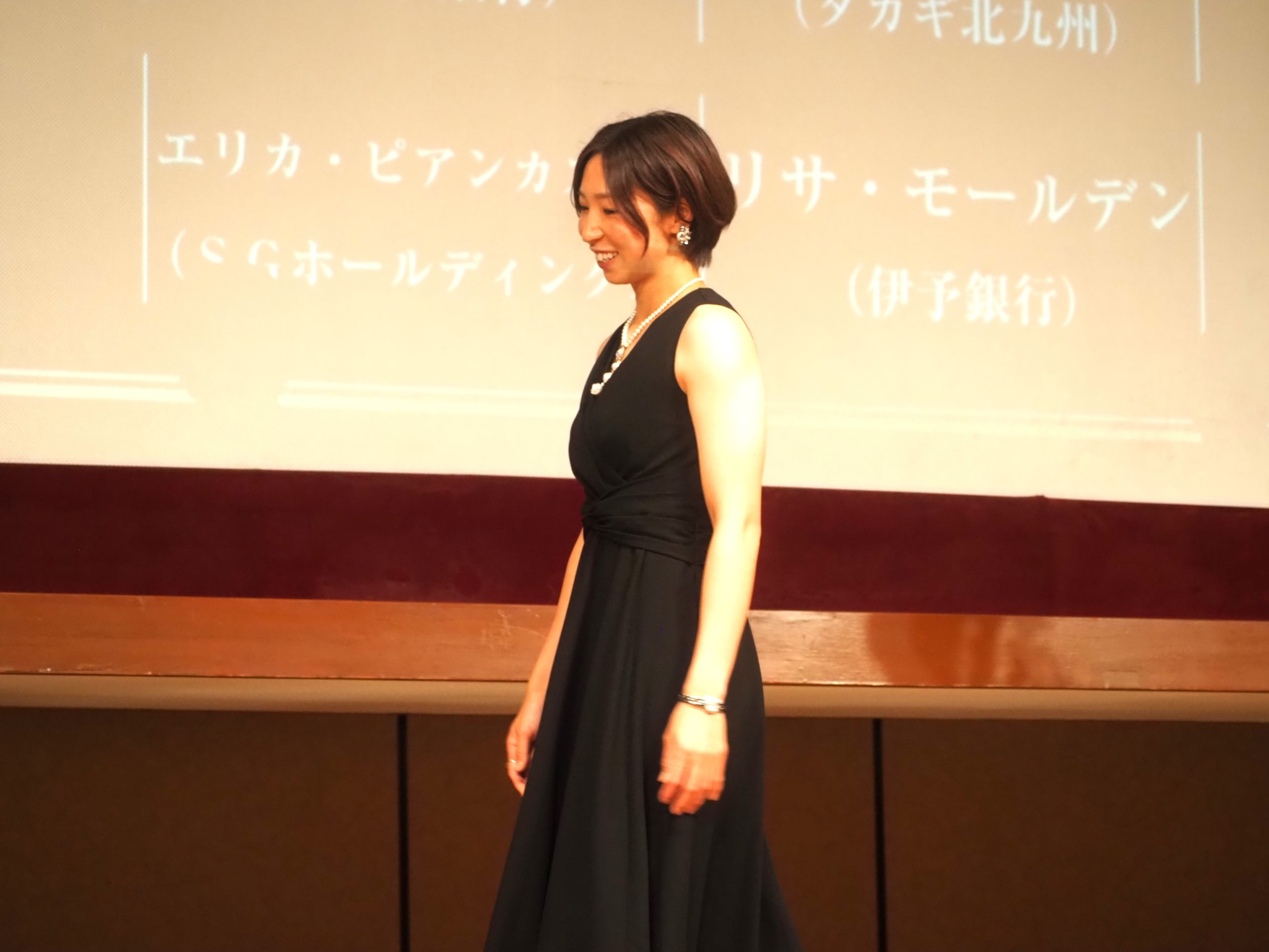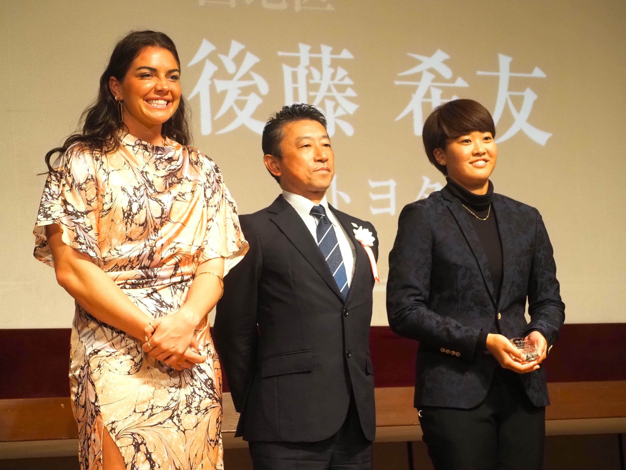 インタビュアーは後藤明日香選手。後藤希友選手には、アボット選手が退団され来シーズンは主軸となると思うが意気込みを聞きました。「モニカは14年間トヨタを支えてきた。自分もあと10年トヨタを支えられるように頑張りたい」切石選手にはひとりひとりのピッチャーに対してどんなリードを考えているか?「トヨタはいいピッチャーが沢山いるので、話をしながらそのピッチャーに合わせた考え方に合わせるようにしている」鎌田選手には走攻守が備わった選手だと思うが来シーズンに向けた意気込みは?「このような賞をいただけたことは個人的には嬉しいが、決勝トーナメントを通じて大事なところで打てないと最後は勝てないことを思い知った悔しいシーズンだったので来シーズンは今年の自分の成績を超えることとチームの結果と両方達成できるように頑張りたい」川口選手には来年に向けた目標や課題を聞きました。「個人的には来年も個人賞が獲れるようにもっと頑張ることとチームとしては来年こそは決勝トーナメンに進めるように全力で伊予銀行らしく頑張りたいと思う」辻井選手は祖父母が会場に来ているとのことで率直な気持ちは?「いつも遠いところまで応援に来てくれる祖父母の前でこのような賞が獲れてうれしく思う。今シーズン課題も多く見つかったシーズンになったので来シーズンはその課題を潰してしっかりチームに貢献できるよう頑張っていきたい」樋口選手には今回三冠だが来シーズンの目標は?「自分は長打力が持ち味なので今年と同じように本塁打賞を獲れるようにしたい。そうすると必ず打点もついてくるのでそこを目指して、バッティングをもっと磨きたい。」Lisa Maulden選手には今年を振り返ってどんな一年間だったか?「めっちゃ楽しかった。JDリーグも楽しくてすごいリーグ。来年も応援よろしくお願いします」と日本語で答えました。来年の活躍が楽しみですね。と後藤明日香選手のインタビューを締めました。尚、StacyPorter選手、Bubba Nickles選手、Erika Piancastelli選手は既に帰国しているため欠席でした。