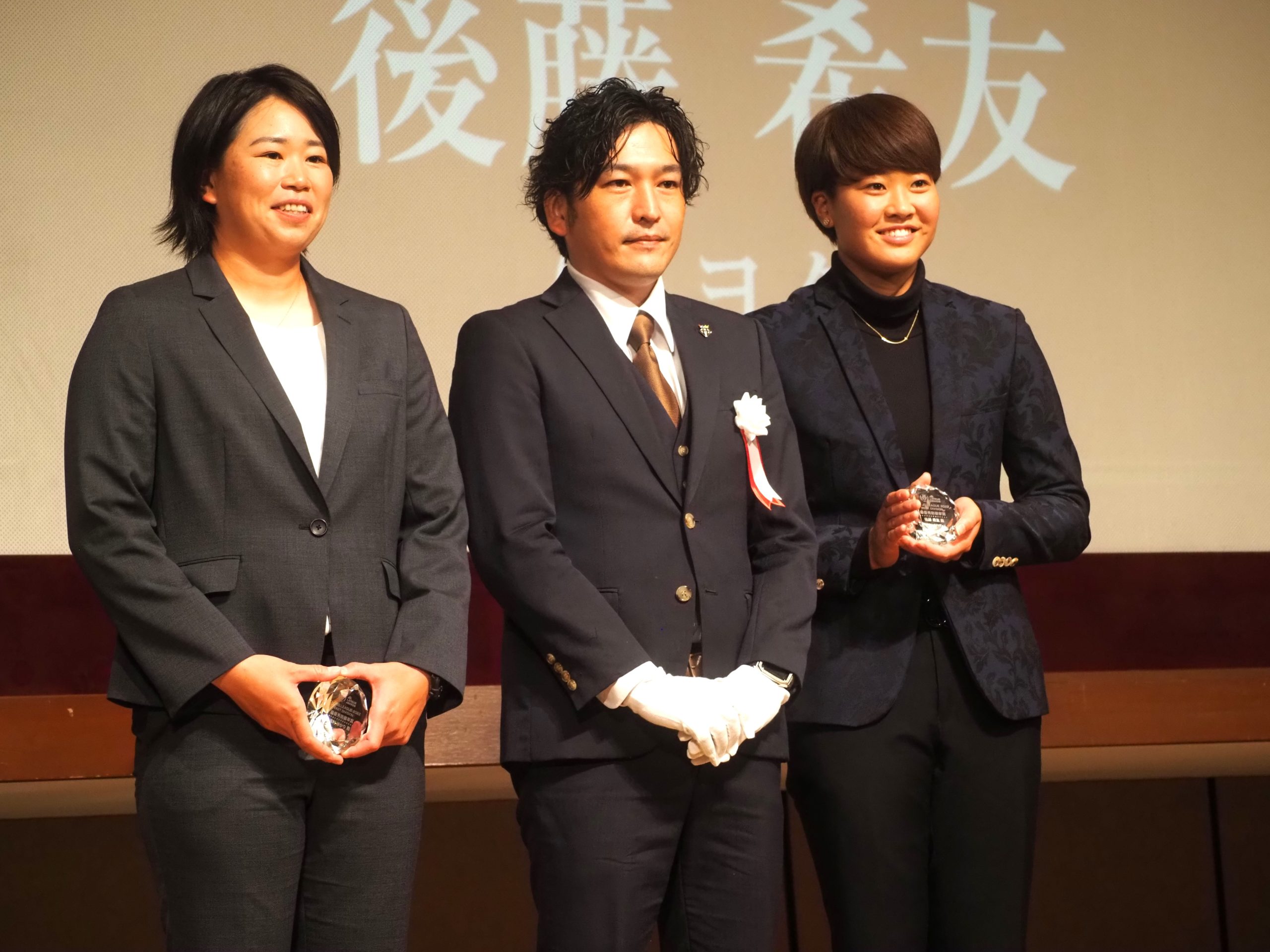 最優秀防御率賞は、東地区はビックカメラ高崎ビークイーンの濱村ゆかり選手、西地区はトヨタレッドテリアーズの後藤希友選手です。濱村選手は今シーズン21試合に登板し112回を投げて防御率は0.81をマーク。後藤選手は22試合88回2/3イニングを投げ、驚異の防御率0.47をマークし、最多賞に続き投手部門二冠を達成。プレゼンターはJDリーグオフィシャル配信パートナースポーツナビ小用圭一氏。インタビュアーは上村奈美選手。濱村選手は、受賞した感想ついて「最少失点で抑えたいという気持ちで一年間戦ってきたのでこの賞をいただけてすごく嬉しい」またチームが勝つためにシーズンを通して大切にしてきたことに対しては「シーズンと通して粘り強く戦うことを意識してきた」と答えた。後藤選手は、今シーズンの目標につていて「防御率トップを目標にこの一年戦ってきたのでいい結果となった」複数タイトルを獲得という輝かしい成果を残せた理由は「ファンの皆様を始め、JDリーグを支えてくれた沢山の方々のおかげ。またトヨタで4年間やってきたこのチームが一番素晴らしい環境だと思っている。その中で馬場監督を始め秦GMや谷村部長が素晴らしいチームを作り上げてくれたおかげでこういう結果を出すことができたと思う。」最後に「お二人ともマウンドでの姿が堂々としていてとても素晴らしかった。」と上村選手が締めくくりました。