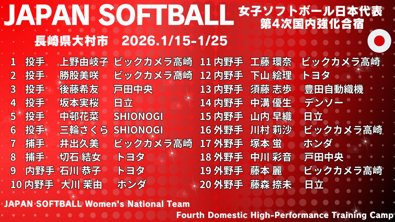 女子ソフトボール日本代表第4次国内強化合宿が2026年1/15〜1/25まで長崎県大村市で行われます。