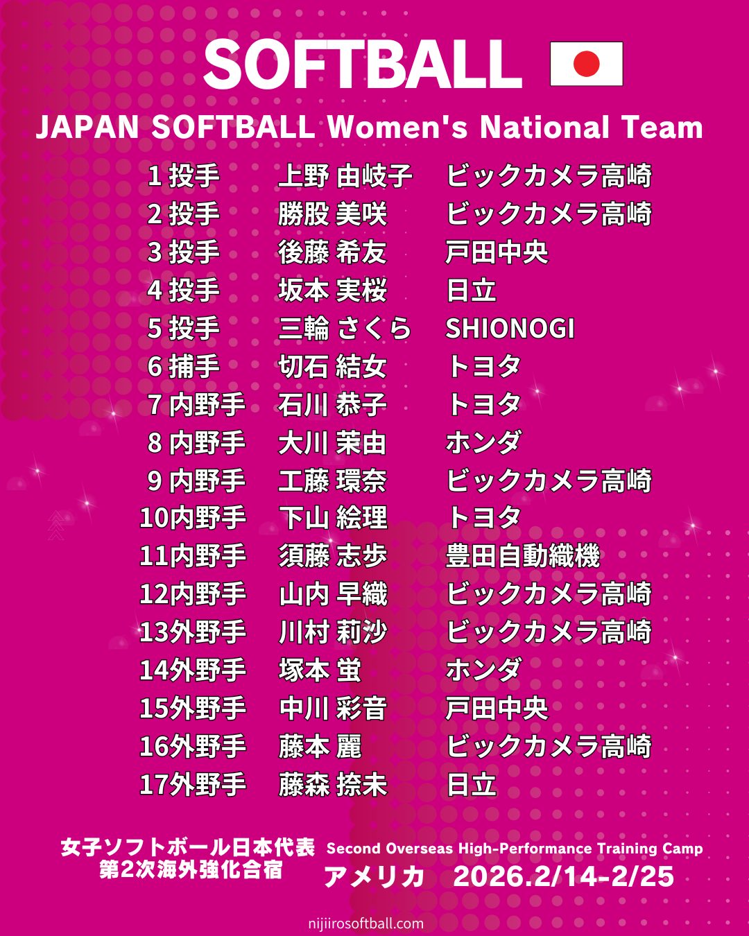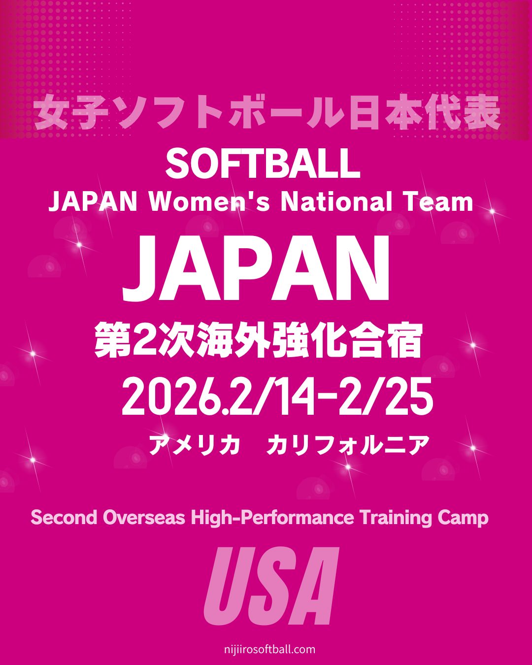 女子ソフトボール日本代表は、第2次海外強化合宿(Second Overseas High-Performance Training Camp)を2026年2月14日から2月25日まで、アメリカ・カリフォルニア州(California, USA)で実施します。