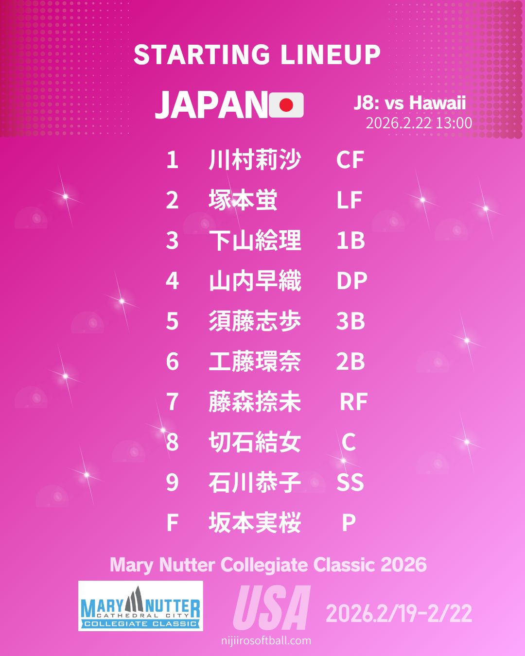 | 1 | #18上野由岐子 Y.UENO | Pitcher |