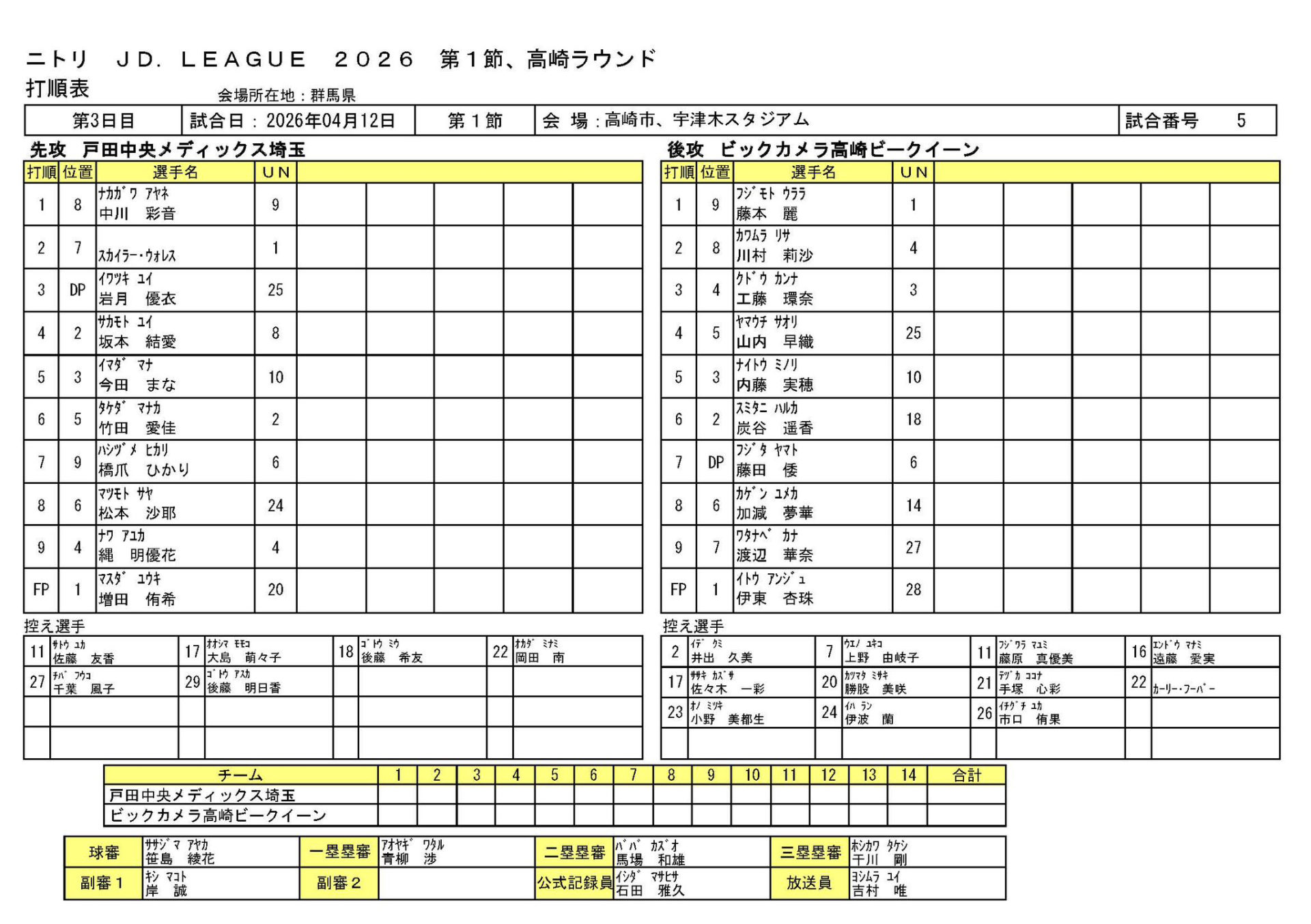 両チームエース上野、後藤は温存
