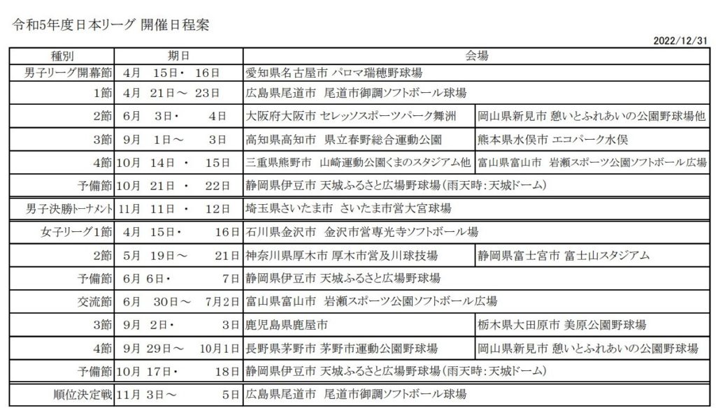 【JSL】日本ソフトボールリーグ日程 2023年度 2023年2月5日 最終更新日時 : 2023年2月5日 nijiiro_jin 日本ソフトボールリーグの日程表です。 2023日本リーグ日程ダウンロード JSリーグ 日本女子リーグ womens_league2023ダウンロード 日本男子リーグ mens_league2023ダウンロード FacebookXBlueskyCopy