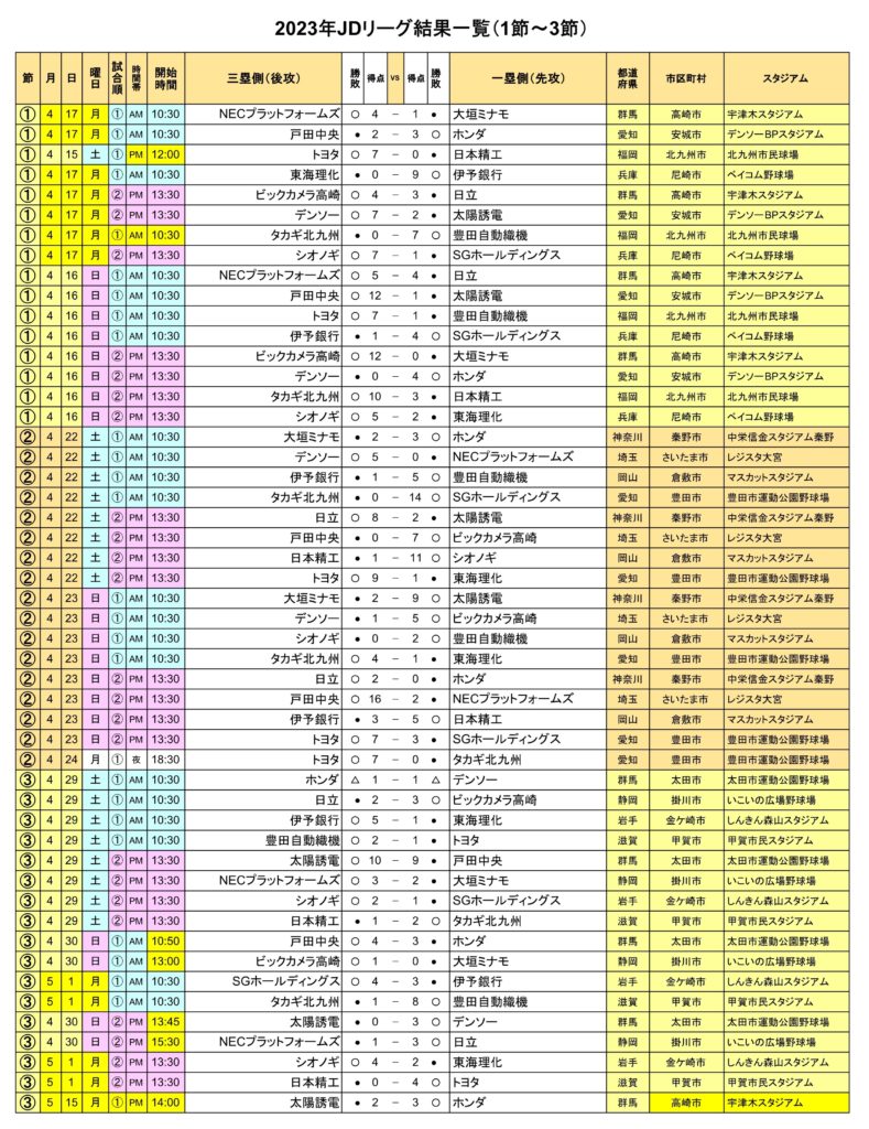 | 4 | 23 | 日 | 10:30 | デンソー | ● | 1 | ー | 5 | 〇 | ビックカメラ | 市口侑果 | 1462 | |