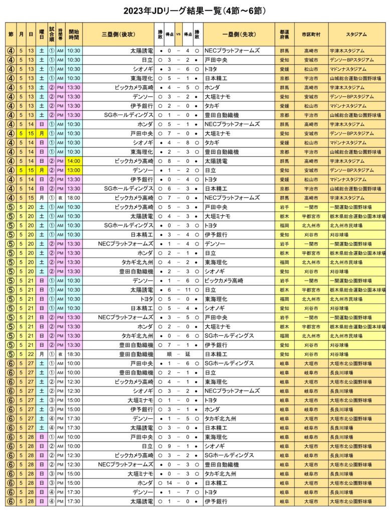 | 5 | 21 | 日 | 10:30 | デンソー | ● | 1 | ー | 6 | 〇 | ビックカメラ | 濱村ゆかり | 473 | |