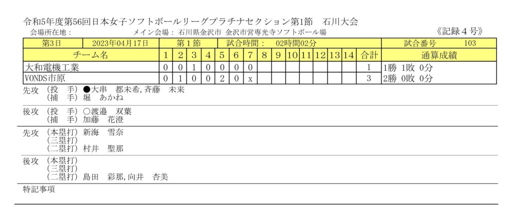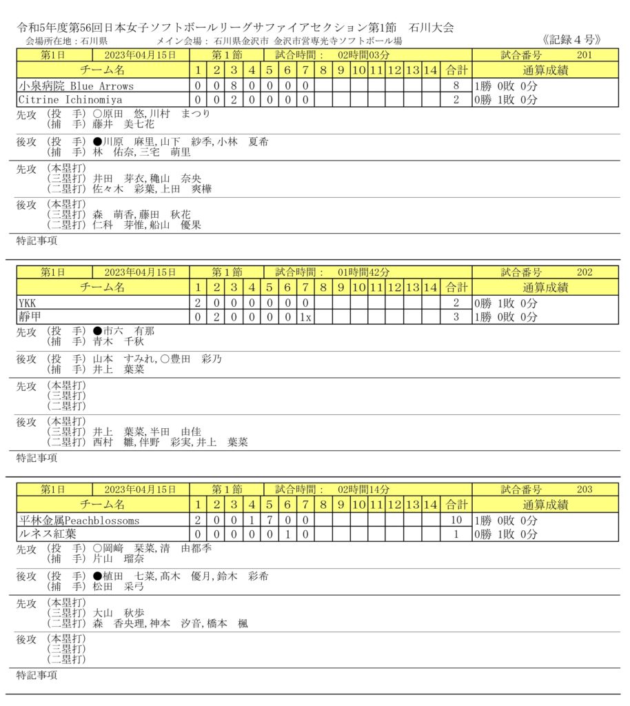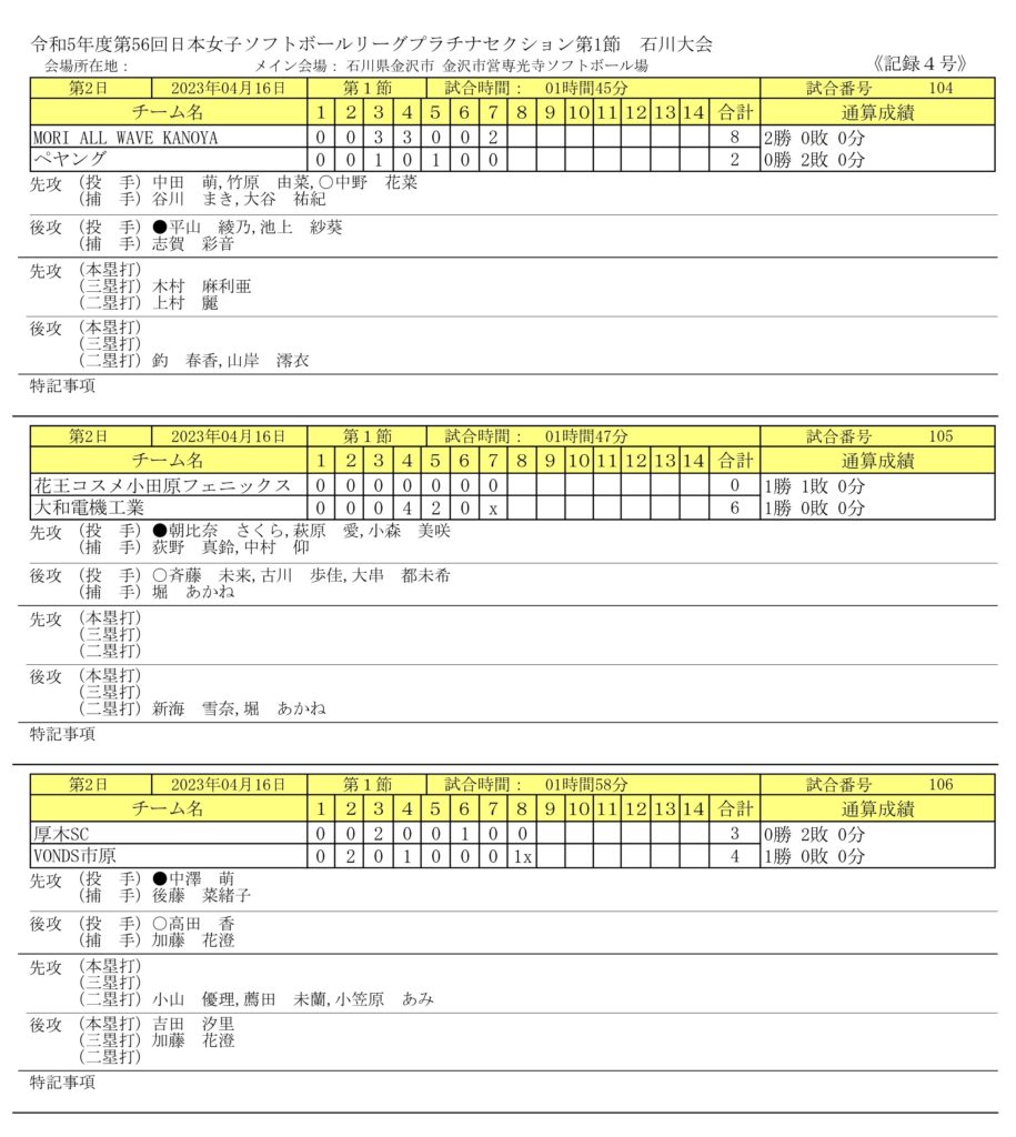 JSリーグ(日本女子ソフトボールリーグ)の第1節が4/15(土)~4/17(月)まで、金沢市専光寺ソフトボール場(石川県金沢市)で開催されました。第1節は、プラチナセクション(6チーム)とサファイアセクション(6チーム)が同じ会場で、各チーム土日で2試合、計12試合が実施されました。尚、プラチナセクションのVONDS市原vs大和電機工業(初日第三試合)は、5回6-6まで行われた時点で降雨によりノーゲームとなり、月曜日に順延されました。