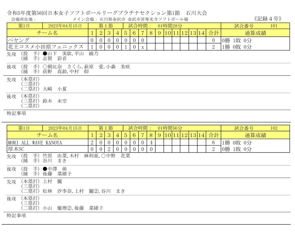 | 4 | 15 | 土 | 10:00 | 花王コスメ小田原 | 〇 | 2 | - | 0 | ● | ペヤング | 金 沢 市 | プ ラ チ ナ |